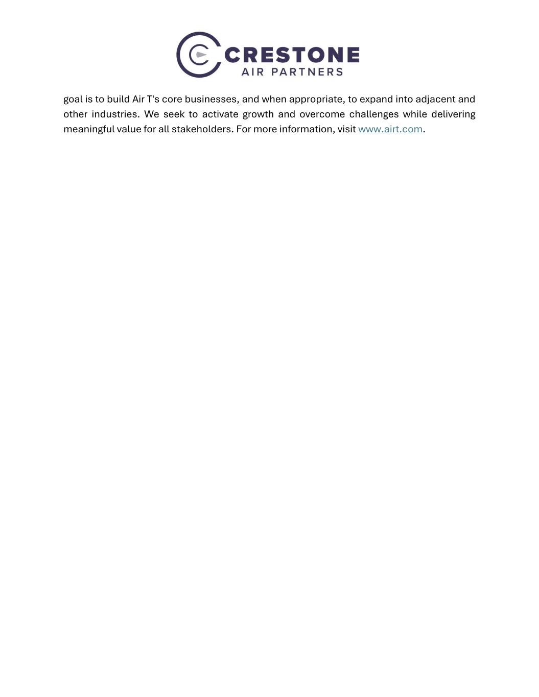 goal is to build Air T's core businesses, and when appropriate, to expand into adjacent and other industries. We seek to activate growth and overcome challenges while delivering meaningful value for all stakeholders. For more information, visit www.airt.com.