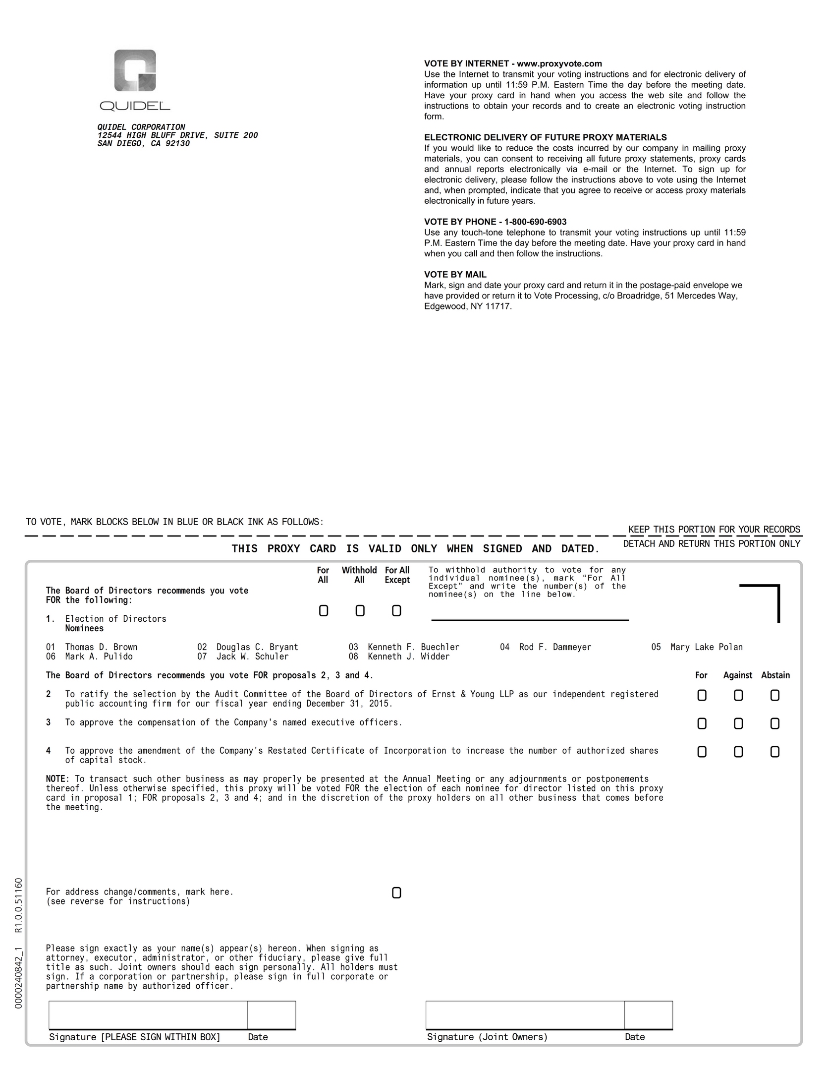 The Board of Directors of Quidel Corporation unanimously recommends that the stockholders vote FOR the eight nominees for the Board of Directors named in the accompanying Proxy Statement; FOR the ratification of the selection of Ernst & Young LLP as our independent registered public accounting firm; FOR the advisory approval of the Company’s executive compensation; and FOR the amendment to the Company’s Restated Certificate of Incorporation to increase the number of authorized shares of capital stock.