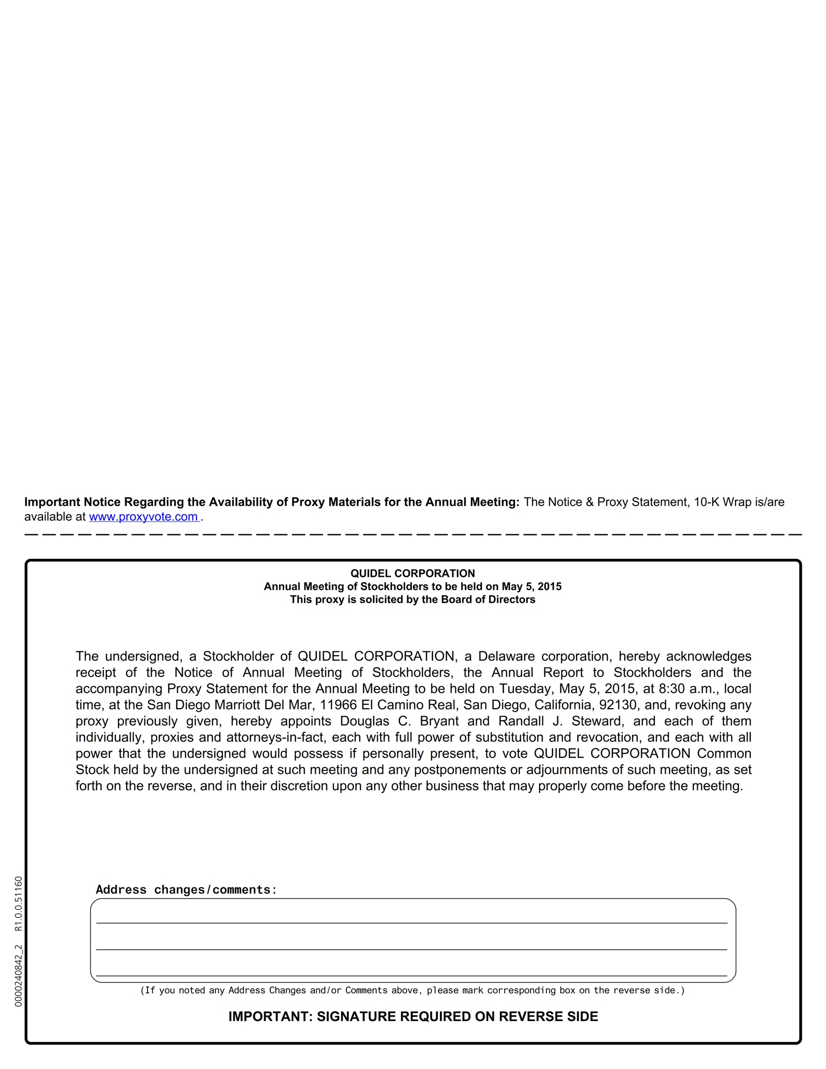 The Annual Meeting of Stockholders of Quidel Corporation will be held on Tuesday, May 5, 2015, at 8:30 a.m., local time, at the San Diego Marriott Del Mar, 11966 El Camino Real, San Diego, California 92130, for the following purposes: