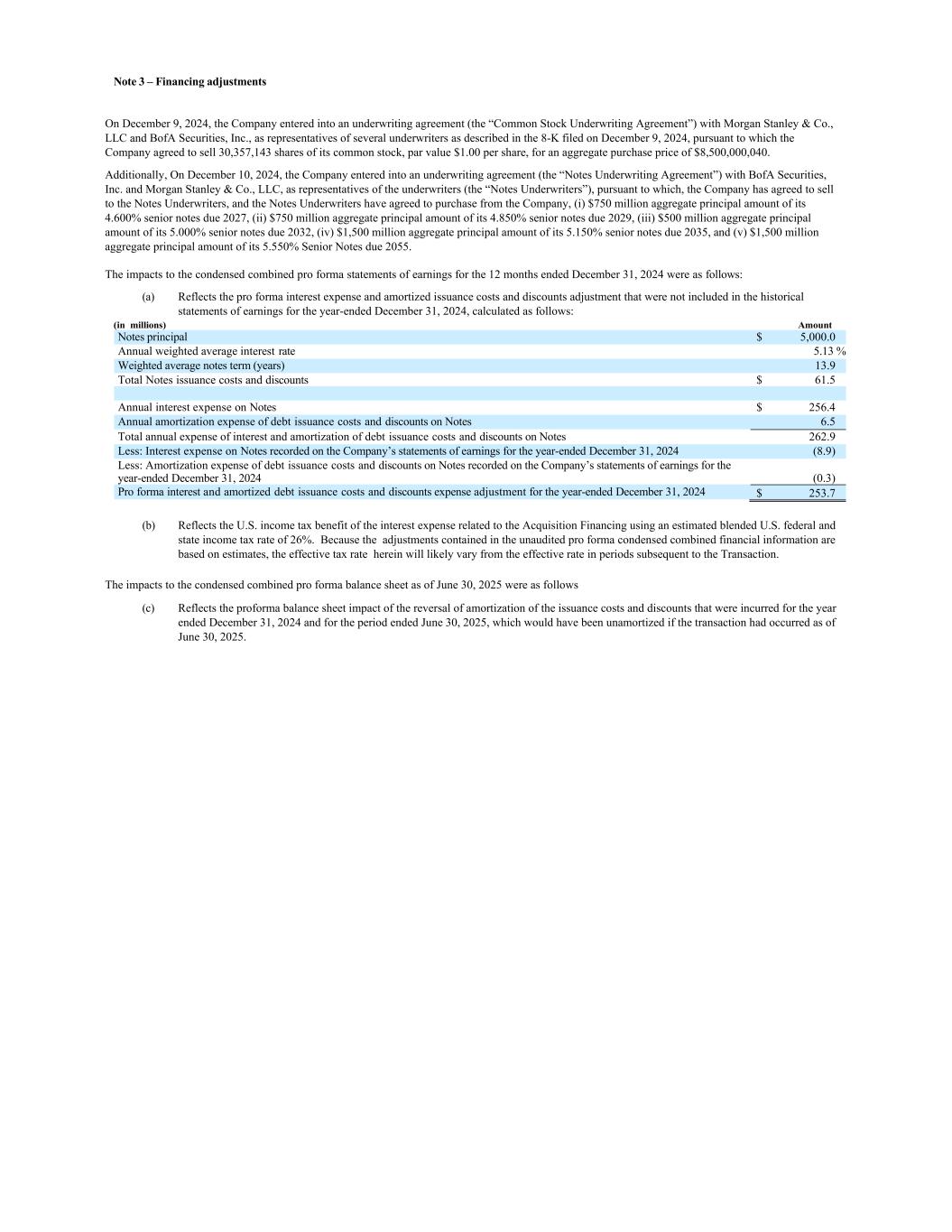 Note 3 – Financing adjustments On December 9, 2024, the Company entered into an underwriting agreement (the “Common Stock Underwriting Agreement”) with Morgan Stanley & Co., LLC and BofA Securities, Inc., as representatives of several underwriters as described in the 8-K filed on December 9, 2024, pursuant to which the Company agreed to sell 30,357,143 shares of its common stock, par value $1.00 per share, for an aggregate purchase price of $8,500,000,040. Additionally, On December 10, 2024, the Company entered into an underwriting agreement (the “Notes Underwriting Agreement”) with BofA Securities, Inc. and Morgan Stanley & Co., LLC, as representatives of the underwriters (the “Notes Underwriters”), pursuant to which, the Company has agreed to sell to the Notes Underwriters, and the Notes Underwriters have agreed to purchase from the Company, (i) $750 million aggregate principal amount of its 4.600% senior notes due 2027, (ii) $750 million aggregate principal amount of its 4.850% senior notes due 2029, (iii) $500 million aggregate principal amount of its 5.000% senior notes due 2032, (iv) $1,500 million aggregate principal amount of its 5.150% senior notes due 2035, and (v) $1,500 million aggregate principal amount of its 5.550% Senior Notes due 2055. The impacts to the condensed combined pro forma statements of earnings for the 12 months ended December 31, 2024 were as follows: (a) Reflects the pro forma interest expense and amortized issuance costs and discounts adjustment that were not included in the historical statements of earnings for the year-ended December 31, 2024, calculated as follows: (in millions) Amount Notes principal $ 5,000.0 Annual weighted average interest rate 5.13 % Weighted average notes term (years) 13.9 Total Notes issuance costs and discounts $ 61.5 Annual interest expense on Notes $ 256.4 Annual amortization expense of debt issuance costs and discounts on Notes 6.5 Total annual expense of interest and amortization of debt issuance costs and discounts on Notes 262.9 Less: Interest expense on Notes recorded on the Company’s statements of earnings for the year-ended December 31, 2024 (8.9) Less: Amortization expense of debt issuance costs and discounts on Notes recorded on the Company’s statements of earnings for the year-ended December 31, 2024 (0.3) Pro forma interest and amortized debt issuance costs and discounts expense adjustment for the year-ended December 31, 2024 $ 253.7 (b) Reflects the U.S. income tax benefit of the interest expense related to the Acquisition Financing using an estimated blended U.S. federal and state income tax rate of 26%. Because the adjustments contained in the unaudited pro forma condensed combined financial information are based on estimates, the effective tax rate herein will likely vary from the effective rate in periods subsequent to the Transaction. The impacts to the condensed combined pro forma balance sheet as of June 30, 2025 were as follows (c) Reflects the proforma balance sheet impact of the reversal of amortization of the issuance costs and discounts that were incurred for the year ended December 31, 2024 and for the period ended June 30, 2025, which would have been unamortized if the transaction had occurred as of June 30, 2025.