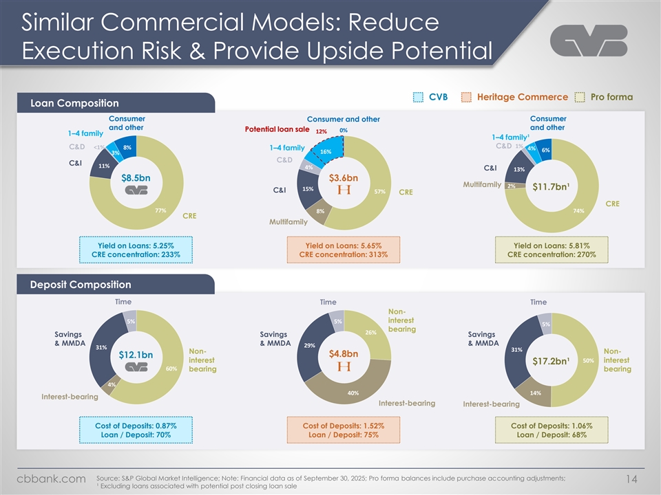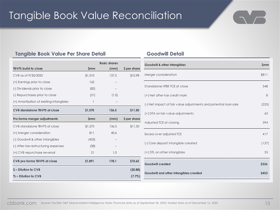 Similar Commercial Models: Reduce Execution Risk & Provide Upside Potential CVB Heritage Commerce Pro forma Loan Composition Consumer Consumer Consumer and other and other and other Potential loan sale 0% 12% 1–4 family 1–4 family¹ C&D 1% C&D <1% 8% 1–4 family 4% 6% 16% 3% C&D C&I 11% 4% C&I 13% $8.5bn $3.6bn Multifamily 2% $11.7bn¹ 15% C&I 57% CRE CRE 77% 74% 8% CRE Multifamily Yield on Loans: 5.25% Yield on Loans: 5.65% Yield on Loans: 5.81% CRE concentration: 233% CRE concentration: 313% CRE concentration: 270% Deposit Composition Time Time Time Non- 5% 5% interest 5% bearing 26% Savings Savings Savings & MMDA & MMDA & MMDA 29% 31% 31% Non- Non- $4.8bn $12.1bn interest 50% interest $17.2bn¹ 60% bearing bearing 4% 40% 14% Interest-bearing Interest-bearing Interest-bearing Cost of Deposits: 0.87% Cost of Deposits: 1.52% Cost of Deposits: 1.06% Loan / Deposit: 70% Loan / Deposit: 75% Loan / Deposit: 68% Source: S&P Global Market Intelligence; Note: Financial data as of September 30, 2025; Pro forma balances include purchase accounting adjustments; cbbank.com 14 ¹ Excluding loans associated with potential post closing loan sale