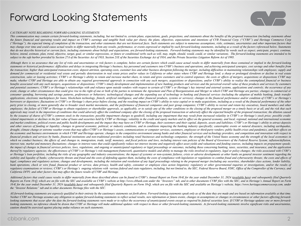 Forward Looking Statements CAUTIONARY NOTE REGARDING FORWARD-LOOKING STATEMENTS This communication may contain certain forward-looking statements, including, but not limited to, certain plans, expectations, goals, projections, and statements about the benefits of the proposed transaction (including statements about the future financial and operating results and impact on CVBF’s earnings and tangible book value per share), the plans, objectives, expectations and intentions of CVB Financial Corp. (“CVBF”) and Heritage Commerce Corp (“Heritage”), the expected timing of completion of the transaction, and other statements that are not historical facts. Such statements are subject to numerous assumptions, risks, estimates, uncertainties and other important factors that may change over time and could cause actual results to differ materially from any results, performance, or events expressed or implied by such forward-looking statements, including as a result of the factors referenced below. Statements that do not describe historical or current facts, including statements about beliefs and expectations, are forward-looking statements. Forward-looking statements may be identified by words such as expect, anticipate, project, continue, believe, intend, estimate, plan, trend, objective, target, goal, or similar expressions, or future or conditional verbs such as will, may, might, should, would, could, or similar variations. The forward-looking statements are intended to be subject to the safe harbor provided by Section 27A of the Securities Act of 1933, Section 21E of the Securities Exchange Act of 1934, and the Private Securities Litigation Reform Act of 1995. Although there is no assurance that any list of risks and uncertainties or risk factors is complete, below are certain factors which could cause actual results to differ materially from those contained or implied in the forward-looking statements or historical performance: difficulties and delays in integrating Heritage’s business, key personnel and customers into CVBF’s business and operations, and achieving anticipated synergies, cost savings and other benefits from the transaction; higher than anticipated transaction costs; deposit attrition, operating costs, customer loss and other business disruption following the merger, including difficulties in maintaining relationships with employees; supply and demand for commercial or residential real estate and periodic deterioration in real estate prices and/or values in California or other states where CVBF and Heritage lend; a sharp or prolonged slowdown or decline in real estate construction, sales or leasing activities; CVBF’s or Heritage’s ability to retain and increase market share, to retain and grow customers and to control expenses; the costs or effects of mergers, acquisitions or dispositions CVBF may make, whether CVBF and Heritage are able to obtain any required governmental approvals in connection with any such mergers, acquisitions or dispositions, and/or CVBF’s ability to realize the contemplated financial or business benefits associated with any such mergers, acquisitions or dispositions; CVBF’s timely development and implementation of new banking products and services and the perceived overall value of these products and services by customers and potential customers; CVBF’s or Heritage’s relationships with and reliance upon outside vendors with respect to certain of CVBF’s or Heritage’s key internal and external systems, applications and controls; the occurrence of any event, change or other circumstances that could give rise to the right of one or both of the parties to terminate the Agreement and Plan of Reorganization and Merger to which CVBF and Heritage are parties; changes in commercial or consumer spending, borrowing and savings patterns, preferences or behaviors; technological changes and the expanding use of technology in banking and financial services (including the adoption of mobile banking, funds transfer applications, electronic marketplaces for loans, blockchain technology, fintech, artificial intelligence, and other financial products, systems or services); changes in the financial performance and/or condition of CVBF’s or Heritage’s borrowers or depositors; fluctuations in CVBF’s or Heritage’s share price before closing, and the resulting impact on CVBF’s ability to raise capital or to make acquisitions, including as a result of the financial performance of the other party prior to closing, or more generally due to broader stock market movements, and the performance of financial companies and peer group companies; CVBF’s ability to recruit and retain key executives, board members and other employees; the failure of CVBF or Heritage to obtain regulatory or shareholder approvals, as applicable, or to satisfy any of the other conditions to the closing of the proposed merger on a timely basis or at all, and the risk that such approvals may result in the imposition of conditions that could adversely affect the combined company after the closing of the proposed transaction or adversely affect the expected benefits of the proposed transaction; the dilution caused by the issuance of shares of CVBF’s common stock in the transaction; possible impairment charges to goodwill, including any impairment that may result from increased volatility in CVBF’s or Heritage’s stock price; possible credit- related impairments or declines in the fair value of loans and securities held by CVBF or Heritage; volatility in the credit and equity markets and its effect on the general economy, and local, regional, national and international economic and market conditions, political events and public health developments and the impact they may have on CVBF or Heritage, their customers and their capital, deposits, assets and liabilities; CVBF’s or Heritage’s ability to attract deposits and other sources of funding or liquidity; changes in gene