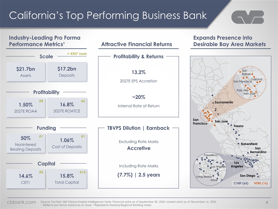 Additional Information ADDITIONAL INFORMATION ABOUT THE PROPOSED MERGER AND WHERE TO FIND IT In connection with the proposed merger, CVBF will file with the SEC a Registration Statement on Form S-4 that will include a Joint Proxy Statement of CVBF and Heritage and a Prospectus of CVBF (the “Joint Proxy Statement/Prospectus”), as well as other relevant documents concerning the Mergers. Certain matters in respect of the proposed merger involving CVBF and Heritage will be submitted to CVBF’s shareholders or Heritage’s shareholders, as applicable, for their consideration. This communication does not constitute an offer to sell or the solicitation of an offer to buy any securities or a solicitation of any vote or approval, nor shall there be any sale of securities, in any jurisdiction in which such offer, solicitation or sale would be unlawful prior to registration or qualification under the securities laws of any such jurisdiction. Before making any voting or investment decision, security holders of CVBF and security holders of Heritage are urged to carefully read the entire registration statement and the Joint Proxy Statement/Prospectus, when they become available, as well as any amendments or supplements to these documents, because they will contain important information about the proposed merger. The documents filed by CVBF and Heritage with the SEC may be obtained free of charge at the SEC’s website at www.sec.gov. In addition, the documents filed by CVBF may be obtained free of charge at CVBF’s website at http://www.cbbank.com under the “Investors” tab or at Heritage’s website at http://www.heritagecommercecorp.com under the “Investor Relations” tab. Alternatively, these documents, when available, can be obtained free of charge by directing a written request to CVBF, Attention: Investor Relations, 701 North Haven Avenue, Ontario, CA 91764, or by calling (909) 980-4030, or to Heritage Commerce Corp, Attention: Investor Relations, 224 Airport Parkway, San Jose, CA 95110, or by calling (408) 947-6900. PARTICIPANTS IN THE SOLICITATION CVBF, Heritage, and certain of their respective directors and executive officers may be deemed to be participants in the solicitation of proxies from CVBF’s shareholders or Heritage’s shareholders in connection with the proposed merger under the rules of the SEC. Information regarding CVBF’s directors and executive officers is available in the sections entitled “Directors, Executive Officers and Corporate Governance” and “Security Ownership of Certain Beneficial Owners and Management and Related Stockholder Matters” in CVBF’s Annual Report on Form 10-K for the fiscal year ended December 31, 2024, which was filed with the SEC on February 28, 2025 (available here); in the sections entitled “Board Oversight and Structure,” “Our Executive Officers,” “The Nominees” “Certain Relationships and Related Person Transactions,” “Director Compensation,” “Compensation Arrangements with our President and Chief Executive Officer,” “Compensation Arrangements with our Other Named Executive Officers,” “Summary of Compensation Table” and “How Much Stock Do CVB Financial Corp.’s Directors and Executive Officers Own” in CVBF’s definitive proxy statement relating to its 2025 Annual Meeting of Shareholders, which was filed with the SEC on April 8, 2025 (available here); in the Form 8-K filed with the SEC on October 23, 2025 regarding the election of a new director (available here); and in other documents filed by CVBF with the SEC. Information regarding Heritage’s directors and executive officers is available in the sections entitled “Directors, Executive Officers and Corporate Governance” and “Security Ownership of Certain Beneficial Owners and Management and Related Stockholder Matters” in Heritage’s Annual Report on Form 10-K for the fiscal year ended December 31, 2024, which was filed with the SEC on March 10, 2025 (available here); in the sections entitled “The Board and Corporate Governance,” “Director Compensation,” “Our Executive Officers,” “Executive Compensation,” “Beneficial Ownership of Common Stock,” and “Transactions with Management” in Heritage’s definitive proxy statement relating to its 2025 Annual Meeting of Shareholders, which was filed with the SEC on April 7, 2025 (available here); and in other documents filed by Heritage with the SEC, and in each case, in particular, the discussion of “Risk Factors” set forth in such filings. To the extent holdings of CVBF’s common stock by the CVBF directors and executive officers, or holdings of Heritage’s common stock by the Heritage directors and executive officers, have changed from the amounts held by such persons as reflected in the documents described above, such changes have been or will be reflected on Statements of Change in Ownership on Form 4 filed with the SEC (available here, in the case of CVBF, and available here, in the case of Heritage). Other information regarding the participants in the proxy solicitation and a description of their direct and indirect interests, by security holdings or otherwise, will be contained in the Joint Proxy Statement/Prospectus relating to the proposed merger. Free copies of this document and the above-mentioned Joint Proxy Statement/Prospectus when it becomes available, may be obtained as described in the preceding section titled “Additional Information About the Proposed Merger and Where to Find It.” cbbank.com 3
