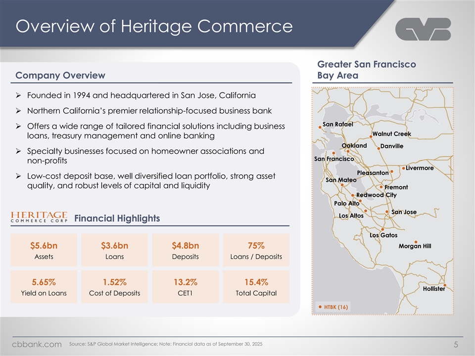 California’s Top Performing Business Bank Industry-Leading Pro Forma Expands Presence into Performance Metrics¹ Attractive Financial Returns Desirable Bay Area Markets KRX² rank Scale Profitability & Returns $21.7bn $17.2bn San 13.2% Rafael Deposits Assets Oakland 2027E EPS Accretion San Francisco Palo Alto Profitability San Jose ~20% #8 #5 Sacramento 1.50% 16.8% Internal Rate of Return 2027E ROAA 2027E ROATCE San San Jose Francisco Fresno Funding TBVPS Dilution | Earnback #1 #1 50% 1.06% Excluding Rate Marks Bakersfield Noninterest Cost of Deposits San Accretive Bearing Deposits Bernardino Pasadena Los Capital Including Rate Marks Los Angeles Angeles #8 #15 (7.7%) | 2.5 years San Diego 15.8% Long Beach 14.6% Irvine CET1 Total Capital CVBF (65) HTBK (16) Source: FactSet; S&P Global Market Intelligence; Note: Financial data as of September 30, 2025; Market data as of December 16, 2025 cbbank.com 4 ¹ Reflects pro forma balances at close; ² Represents Nasdaq Regional Banking Index