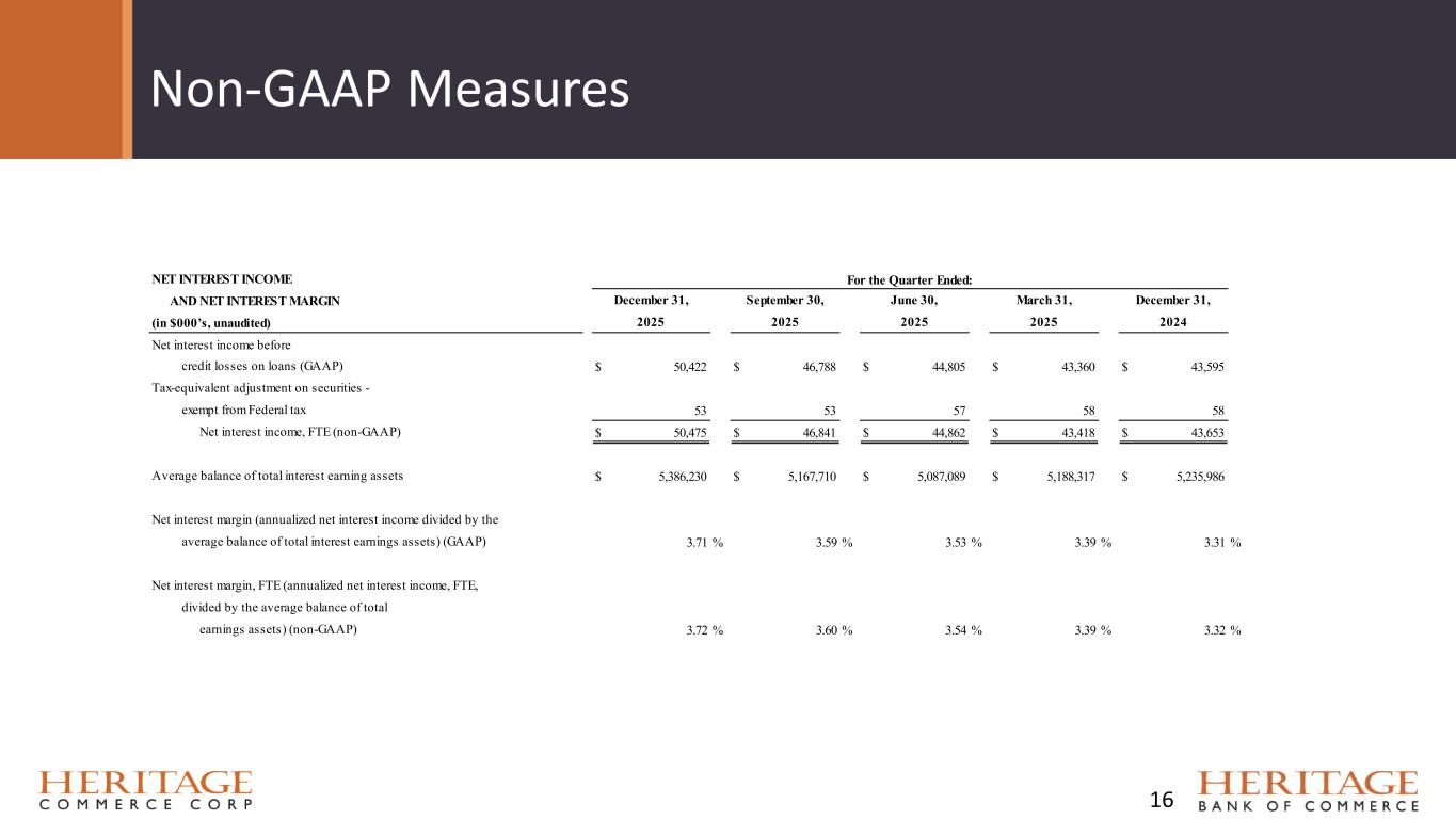 Non-GAAP Measures 15 RETURN ON AVERAGE TANGIBLE COMMON EQUITY AND AVERAGE ASSETS (in $000’s, unaudited) Reported net income (GAAP) $ 15,117 $ 14,698 $ 6,389 $ 11,626 $ 10,621 Add: pre-tax legal settlement, merger and other charges 2,067 — 9,184 — — Less: related income taxes (15) — (2,618) — — Adjusted net income (non-GAAP) $ 17,169 $ 14,698 $ 12,955 $ 11,626 $ 10,621 Average tangible common equity components: Average equity (GAAP) $ 703,611 $ 696,385 $ 697,016 $ 692,733 $ 686,263 Less: goodwill (167,631) (167,631) (167,631) (167,631) (167,631) Less: other intangible assets (4,891) (5,358) (5,817) (6,264) (6,770) Total average tangible common equity (non-GAAP) $ 531,089 $ 523,396 $ 523,568 $ 518,838 $ 511,862 Reported annualized return on average equity (GAAP) 8.52 % 8.37 % 3.68 % 6.81 % 6.16 % Adjusted annualized return on average equity (non-GAAP) 9.68 % 8.37 % 7.45 % 6.81 % 6.16 % Reported annualized return on average tangible common equity (non-GAAP) 11.29 % 11.14 % 4.89 % 9.09 % 8.25 % Adjusted annualized return on average tangible common equity (non-GAAP) 12.83 % 11.14 % 9.92 % 9.09 % 8.25 % Average Assets (GAAP) $ 5,764,240 $ 5,551,457 $ 5,458,420 $ 5,559,896 $ 5,607,840 Reported annualized return on average assets (GAAP) 1.04 % 1.05 % 0.47 % 0.85 % 0.75 % Adjusted annualized return on average assets (non-GAAP) 1.18 % 1.05 % 0.95 % 0.85 % 0.75 % December 31, 2025 2025 September 30, For the Quarter Ended: June 30, March 31, December 31, 202420252025