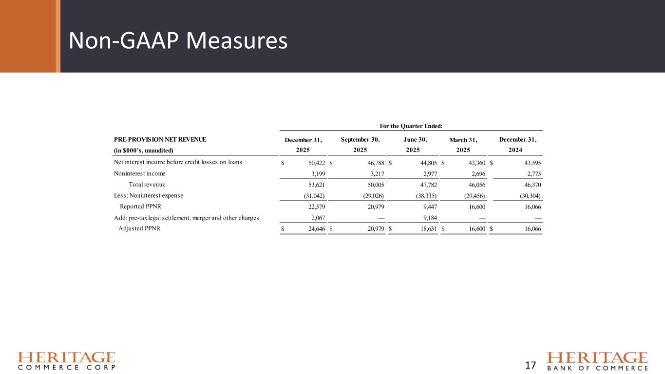 Non-GAAP Measures 16 NET INTEREST INCOME AND NET INTEREST MARGIN (in $000’s, unaudited) Net interest income before credit losses on loans (GAAP) $ 50,422 $ 46,788 $ 44,805 $ 43,360 $ 43,595 Tax-equivalent adjustment on securities - exempt from Federal tax 53 53 57 58 58 Net interest income, FTE (non-GAAP) $ 50,475 $ 46,841 $ 44,862 $ 43,418 $ 43,653 Average balance of total interest earning assets $ 5,386,230 $ 5,167,710 $ 5,087,089 $ 5,188,317 $ 5,235,986 Net interest margin (annualized net interest income divided by the average balance of total interest earnings assets) (GAAP) 3.71 % 3.59 % 3.53 % 3.39 % 3.31 % Net interest margin, FTE (annualized net interest income, FTE, divided by the average balance of total earnings assets) (non-GAAP) 3.72 % 3.60 % 3.54 % 3.39 % 3.32 % December 31, 2025 2025 September 30, For the Quarter Ended: June 30, March 31, December 31, 202420252025