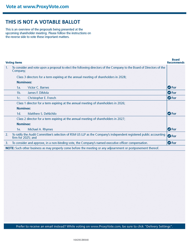 Vote at www.ProxyVote.com THIS IS NOT A VOTABLE BALLOT This is an overview of the proposals being presented at the upcoming shareholder meeting. Please follow the instructions on the reverse side to vote these important matters. Prefer to receive an email instead? While voting on www.ProxyVote.com, be sure to click “Delivery Settings”. V64290 - Z89640 For 1. To consider and vote upon a proposal to elect the following directors of the Company to the Board of Directors of the Company; Class 3 directors for a term expiring at the annual meeting of shareholders in 2028; Nominees: 1a. Victor C. Barnes For 1b. James F. DiMola For 1c. Christopher E. French For Class 1 director for a term expiring at the annual meeting of shareholders in 2026; Nominee: 1d. Matthew S. DeNichilo For Class 2 director for a term expiring at the annual meeting of shareholders in 2027; Nominee: 1e. Michael A. Rhymes For 2. To ratify the Audit Committee’s selection of RSM US LLP as the Company’s independent registered public accounting firm for 2025; and For 3. To consider and approve, in a non - binding vote, the Company’s named executive officer compensation. NOTE: Such other business as may properly come before the meeting or any adjournment or postponement thereof. Voting Items Board Recommends