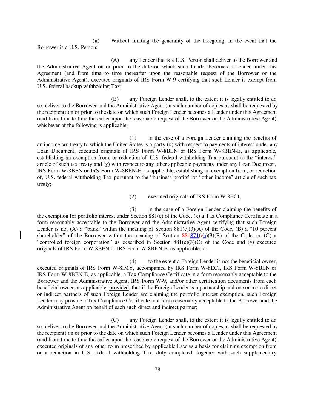 Without limiting the generality of the foregoing, in the event that the(ii) Borrower is a U.S. Person: any Lender that is a U.S. Person shall deliver to the Borrower and(A) the Administrative Agent on or prior to the date on which such Lender becomes a Lender under this Agreement (and from time to time thereafter upon the reasonable request of the Borrower or the Administrative Agent), executed originals of IRS Form W-9 certifying that such Lender is exempt from U.S. federal backup withholding Tax; any Foreign Lender shall, to the extent it is legally entitled to do(B) so, deliver to the Borrower and the Administrative Agent (in such number of copies as shall be requested by the recipient) on or prior to the date on which such Foreign Lender becomes a Lender under this Agreement (and from time to time thereafter upon the reasonable request of the Borrower or the Administrative Agent), whichever of the following is applicable: in the case of a Foreign Lender claiming the benefits of(1) an income tax treaty to which the United States is a party (x) with respect to payments of interest under any Loan Document, executed originals of IRS Form W-8BEN or IRS Form W-8BEN-E, as applicable, establishing an exemption from, or reduction of, U.S. federal withholding Tax pursuant to the “interest” article of such tax treaty and (y) with respect to any other applicable payments under any Loan Document, IRS Form W-8BEN or IRS Form W-8BEN-E, as applicable, establishing an exemption from, or reduction of, U.S. federal withholding Tax pursuant to the “business profits” or “other income” article of such tax treaty; executed originals of IRS Form W-8ECI;(2) in the case of a Foreign Lender claiming the benefits of(3) the exemption for portfolio interest under Section 881(c) of the Code, (x) a Tax Compliance Certificate in a form reasonably acceptable to the Borrower and the Administrative Agent certifying that such Foreign Lender is not (A) a “bank” within the meaning of Section 881(c)(3)(A) of the Code, (B) a “10 percent shareholder” of the Borrower within the meaning of Section 881871(ch)(3)(B) of the Code, or (C) a “controlled foreign corporation” as described in Section 881(c)(3)(C) of the Code and (y) executed originals of IRS Form W-8BEN or IRS Form W-8BEN-E, as applicable; or to the extent a Foreign Lender is not the beneficial owner,(4) executed originals of IRS Form W-8IMY, accompanied by IRS Form W-8ECI, IRS Form W-8BEN or IRS Form W-8BEN-E, as applicable, a Tax Compliance Certificate in a form reasonably acceptable to the Borrower and the Administrative Agent, IRS Form W-9, and/or other certification documents from each beneficial owner, as applicable; provided, that if the Foreign Lender is a partnership and one or more direct or indirect partners of such Foreign Lender are claiming the portfolio interest exemption, such Foreign Lender may provide a Tax Compliance Certificate in a form reasonably acceptable to the Borrower and the Administrative Agent on behalf of each such direct and indirect partner; any Foreign Lender shall, to the extent it is legally entitled to do(C) so, deliver to the Borrower and the Administrative Agent (in such number of copies as shall be requested by the recipient) on or prior to the date on which such Foreign Lender becomes a Lender under this Agreement (and from time to time thereafter upon the reasonable request of the Borrower or the Administrative Agent), executed originals of any other form prescribed by applicable Law as a basis for claiming exemption from or a reduction in U.S. federal withholding Tax, duly completed, together with such supplementary 78