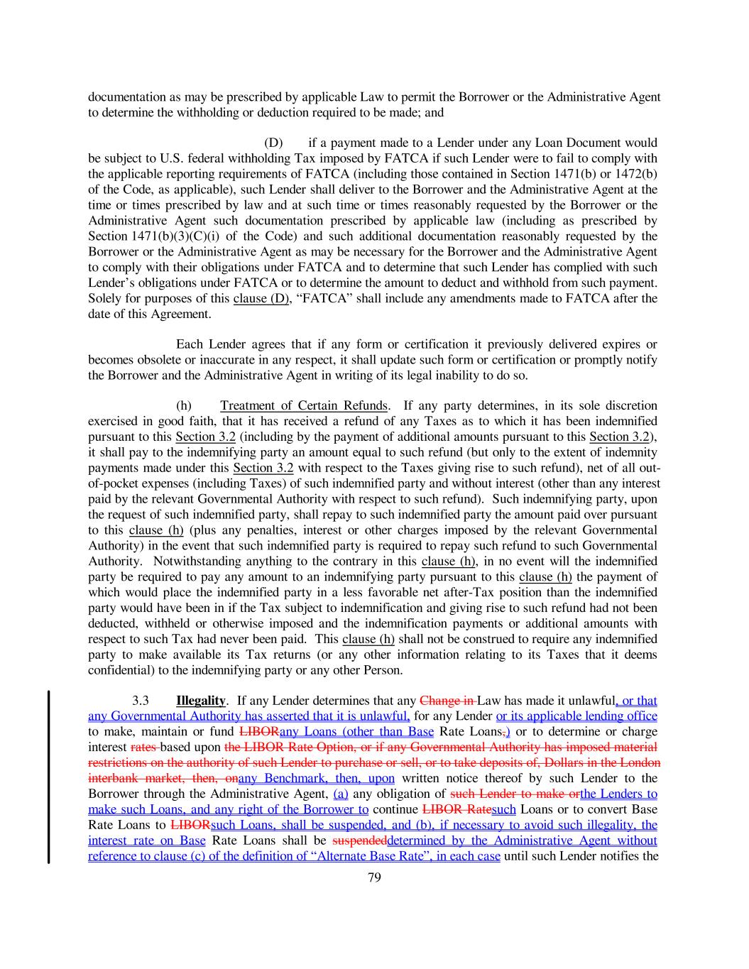 documentation as may be prescribed by applicable Law to permit the Borrower or the Administrative Agent to determine the withholding or deduction required to be made; and if a payment made to a Lender under any Loan Document would(D) be subject to U.S. federal withholding Tax imposed by FATCA if such Lender were to fail to comply with the applicable reporting requirements of FATCA (including those contained in Section 1471(b) or 1472(b) of the Code, as applicable), such Lender shall deliver to the Borrower and the Administrative Agent at the time or times prescribed by law and at such time or times reasonably requested by the Borrower or the Administrative Agent such documentation prescribed by applicable law (including as prescribed by Section 1471(b)(3)(C)(i) of the Code) and such additional documentation reasonably requested by the Borrower or the Administrative Agent as may be necessary for the Borrower and the Administrative Agent to comply with their obligations under FATCA and to determine that such Lender has complied with such Lender’s obligations under FATCA or to determine the amount to deduct and withhold from such payment. Solely for purposes of this clause (D), “FATCA” shall include any amendments made to FATCA after the date of this Agreement. Each Lender agrees that if any form or certification it previously delivered expires or becomes obsolete or inaccurate in any respect, it shall update such form or certification or promptly notify the Borrower and the Administrative Agent in writing of its legal inability to do so. Treatment of Certain Refunds. If any party determines, in its sole discretion(h) exercised in good faith, that it has received a refund of any Taxes as to which it has been indemnified pursuant to this Section 3.2 (including by the payment of additional amounts pursuant to this Section 3.2), it shall pay to the indemnifying party an amount equal to such refund (but only to the extent of indemnity payments made under this Section 3.2 with respect to the Taxes giving rise to such refund), net of all out- of-pocket expenses (including Taxes) of such indemnified party and without interest (other than any interest paid by the relevant Governmental Authority with respect to such refund). Such indemnifying party, upon the request of such indemnified party, shall repay to such indemnified party the amount paid over pursuant to this clause (h) (plus any penalties, interest or other charges imposed by the relevant Governmental Authority) in the event that such indemnified party is required to repay such refund to such Governmental Authority. Notwithstanding anything to the contrary in this clause (h), in no event will the indemnified party be required to pay any amount to an indemnifying party pursuant to this clause (h) the payment of which would place the indemnified party in a less favorable net after-Tax position than the indemnified party would have been in if the Tax subject to indemnification and giving rise to such refund had not been deducted, withheld or otherwise imposed and the indemnification payments or additional amounts with respect to such Tax had never been paid. This clause (h) shall not be construed to require any indemnified party to make available its Tax returns (or any other information relating to its Taxes that it deems confidential) to the indemnifying party or any other Person. Illegality. If any Lender determines that any Change in Law has made it unlawful, or that3.3 any Governmental Authority has asserted that it is unlawful, for any Lender or its applicable lending office to make, maintain or fund LIBORany Loans (other than Base Rate Loans,) or to determine or charge interest rates based upon the LIBOR Rate Option, or if any Governmental Authority has imposed material restrictions on the authority of such Lender to purchase or sell, or to take deposits of, Dollars in the London interbank market, then, onany Benchmark, then, upon written notice thereof by such Lender to the Borrower through the Administrative Agent, (a) any obligation of such Lender to make orthe Lenders to make such Loans, and any right of the Borrower to continue LIBOR Ratesuch Loans or to convert Base Rate Loans to LIBORsuch Loans, shall be suspended, and (b), if necessary to avoid such illegality, the interest rate on Base Rate Loans shall be suspendeddetermined by the Administrative Agent without reference to clause (c) of the definition of “Alternate Base Rate”, in each case until such Lender notifies the 79