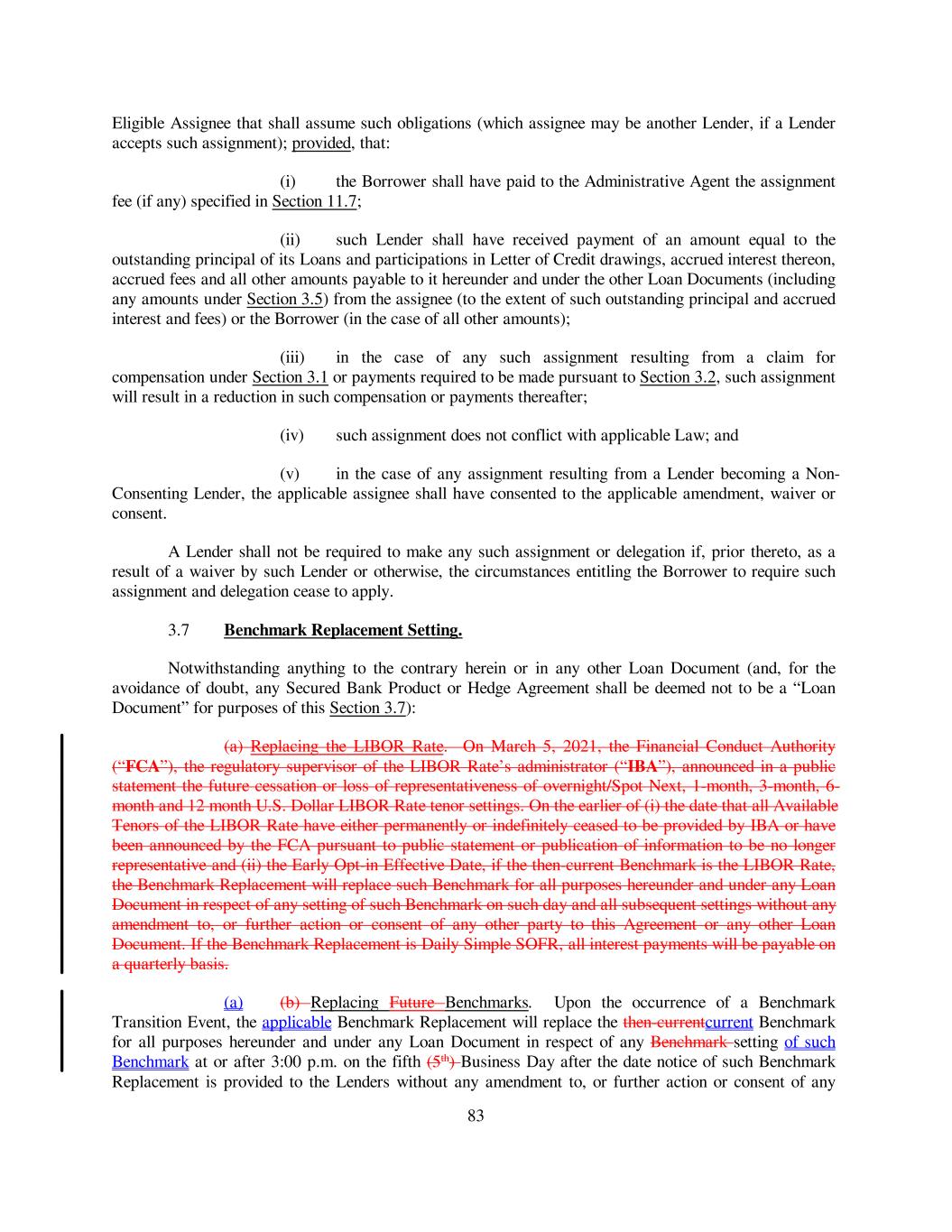 Eligible Assignee that shall assume such obligations (which assignee may be another Lender, if a Lender accepts such assignment); provided, that: the Borrower shall have paid to the Administrative Agent the assignment(i) fee (if any) specified in Section 11.7; such Lender shall have received payment of an amount equal to the(ii) outstanding principal of its Loans and participations in Letter of Credit drawings, accrued interest thereon, accrued fees and all other amounts payable to it hereunder and under the other Loan Documents (including any amounts under Section 3.5) from the assignee (to the extent of such outstanding principal and accrued interest and fees) or the Borrower (in the case of all other amounts); in the case of any such assignment resulting from a claim for(iii) compensation under Section 3.1 or payments required to be made pursuant to Section 3.2, such assignment will result in a reduction in such compensation or payments thereafter; such assignment does not conflict with applicable Law; and(iv) in the case of any assignment resulting from a Lender becoming a Non-(v) Consenting Lender, the applicable assignee shall have consented to the applicable amendment, waiver or consent. A Lender shall not be required to make any such assignment or delegation if, prior thereto, as a result of a waiver by such Lender or otherwise, the circumstances entitling the Borrower to require such assignment and delegation cease to apply. Benchmark Replacement Setting.3.7 Notwithstanding anything to the contrary herein or in any other Loan Document (and, for the avoidance of doubt, any Secured Bank Product or Hedge Agreement shall be deemed not to be a “Loan Document” for purposes of this Section 3.7): (a) Replacing the LIBOR Rate. On March 5, 2021, the Financial Conduct Authority (“FCA”), the regulatory supervisor of the LIBOR Rate’s administrator (“IBA”), announced in a public statement the future cessation or loss of representativeness of overnight/Spot Next, 1-month, 3-month, 6- month and 12 month U.S. Dollar LIBOR Rate tenor settings. On the earlier of (i) the date that all Available Tenors of the LIBOR Rate have either permanently or indefinitely ceased to be provided by IBA or have been announced by the FCA pursuant to public statement or publication of information to be no longer representative and (ii) the Early Opt-in Effective Date, if the then-current Benchmark is the LIBOR Rate, the Benchmark Replacement will replace such Benchmark for all purposes hereunder and under any Loan Document in respect of any setting of such Benchmark on such day and all subsequent settings without any amendment to, or further action or consent of any other party to this Agreement or any other Loan Document. If the Benchmark Replacement is Daily Simple SOFR, all interest payments will be payable on a quarterly basis. (b) Replacing Future Benchmarks. Upon the occurrence of a Benchmark(a) Transition Event, the applicable Benchmark Replacement will replace the then-currentcurrent Benchmark for all purposes hereunder and under any Loan Document in respect of any Benchmark setting of such Benchmark at or after 3:00 p.m. on the fifth (5th) Business Day after the date notice of such Benchmark Replacement is provided to the Lenders without any amendment to, or further action or consent of any 83