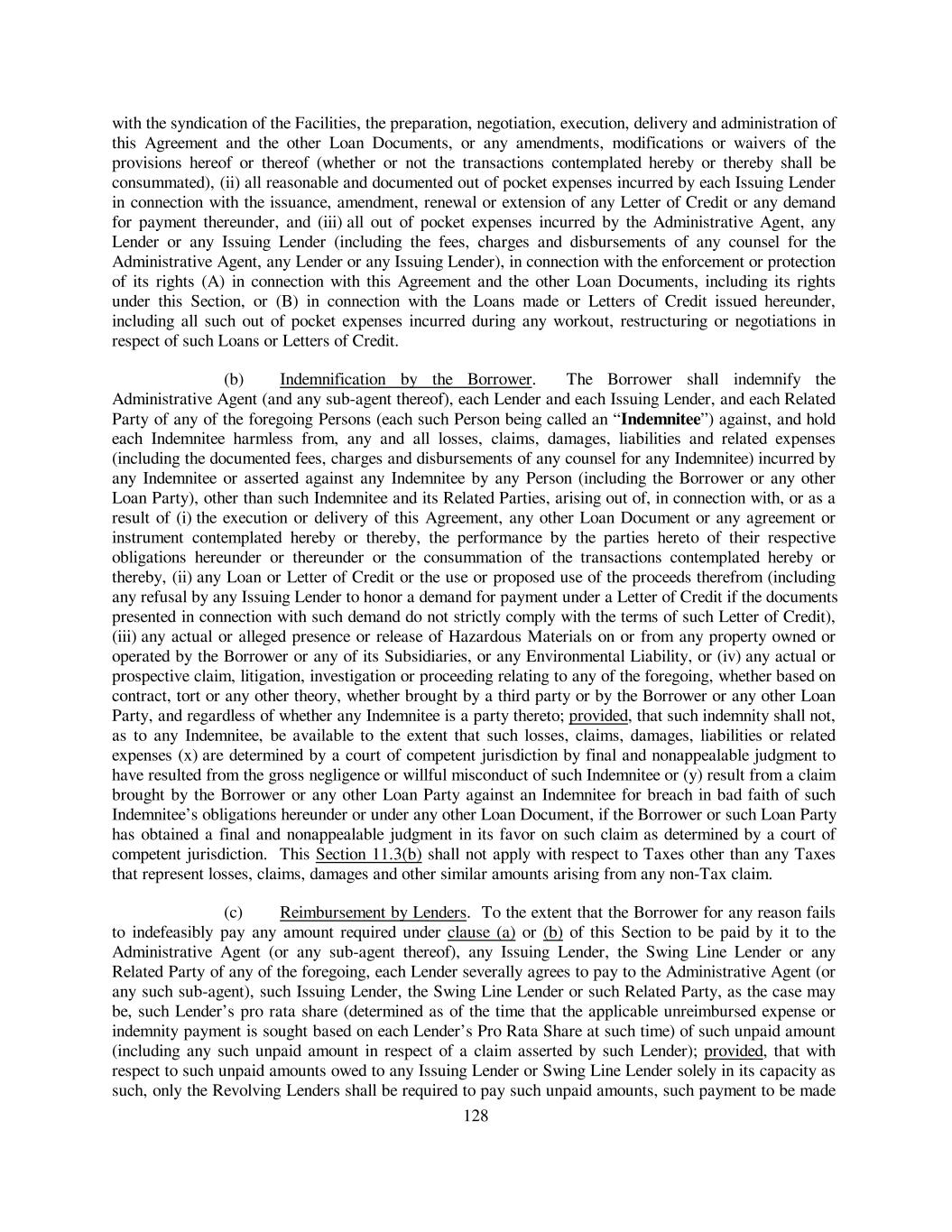 with the syndication of the Facilities, the preparation, negotiation, execution, delivery and administration of this Agreement and the other Loan Documents, or any amendments, modifications or waivers of the provisions hereof or thereof (whether or not the transactions contemplated hereby or thereby shall be consummated), (ii) all reasonable and documented out of pocket expenses incurred by each Issuing Lender in connection with the issuance, amendment, renewal or extension of any Letter of Credit or any demand for payment thereunder, and (iii) all out of pocket expenses incurred by the Administrative Agent, any Lender or any Issuing Lender (including the fees, charges and disbursements of any counsel for the Administrative Agent, any Lender or any Issuing Lender), in connection with the enforcement or protection of its rights (A) in connection with this Agreement and the other Loan Documents, including its rights under this Section, or (B) in connection with the Loans made or Letters of Credit issued hereunder, including all such out of pocket expenses incurred during any workout, restructuring or negotiations in respect of such Loans or Letters of Credit. Indemnification by the Borrower. The Borrower shall indemnify the(b) Administrative Agent (and any sub-agent thereof), each Lender and each Issuing Lender, and each Related Party of any of the foregoing Persons (each such Person being called an “Indemnitee”) against, and hold each Indemnitee harmless from, any and all losses, claims, damages, liabilities and related expenses (including the documented fees, charges and disbursements of any counsel for any Indemnitee) incurred by any Indemnitee or asserted against any Indemnitee by any Person (including the Borrower or any other Loan Party), other than such Indemnitee and its Related Parties, arising out of, in connection with, or as a result of (i) the execution or delivery of this Agreement, any other Loan Document or any agreement or instrument contemplated hereby or thereby, the performance by the parties hereto of their respective obligations hereunder or thereunder or the consummation of the transactions contemplated hereby or thereby, (ii) any Loan or Letter of Credit or the use or proposed use of the proceeds therefrom (including any refusal by any Issuing Lender to honor a demand for payment under a Letter of Credit if the documents presented in connection with such demand do not strictly comply with the terms of such Letter of Credit), (iii) any actual or alleged presence or release of Hazardous Materials on or from any property owned or operated by the Borrower or any of its Subsidiaries, or any Environmental Liability, or (iv) any actual or prospective claim, litigation, investigation or proceeding relating to any of the foregoing, whether based on contract, tort or any other theory, whether brought by a third party or by the Borrower or any other Loan Party, and regardless of whether any Indemnitee is a party thereto; provided, that such indemnity shall not, as to any Indemnitee, be available to the extent that such losses, claims, damages, liabilities or related expenses (x) are determined by a court of competent jurisdiction by final and nonappealable judgment to have resulted from the gross negligence or willful misconduct of such Indemnitee or (y) result from a claim brought by the Borrower or any other Loan Party against an Indemnitee for breach in bad faith of such Indemnitee’s obligations hereunder or under any other Loan Document, if the Borrower or such Loan Party has obtained a final and nonappealable judgment in its favor on such claim as determined by a court of competent jurisdiction. This Section 11.3(b) shall not apply with respect to Taxes other than any Taxes that represent losses, claims, damages and other similar amounts arising from any non-Tax claim. Reimbursement by Lenders. To the extent that the Borrower for any reason fails(c) to indefeasibly pay any amount required under clause (a) or (b) of this Section to be paid by it to the Administrative Agent (or any sub-agent thereof), any Issuing Lender, the Swing Line Lender or any Related Party of any of the foregoing, each Lender severally agrees to pay to the Administrative Agent (or any such sub-agent), such Issuing Lender, the Swing Line Lender or such Related Party, as the case may be, such Lender’s pro rata share (determined as of the time that the applicable unreimbursed expense or indemnity payment is sought based on each Lender’s Pro Rata Share at such time) of such unpaid amount (including any such unpaid amount in respect of a claim asserted by such Lender); provided, that with respect to such unpaid amounts owed to any Issuing Lender or Swing Line Lender solely in its capacity as such, only the Revolving Lenders shall be required to pay such unpaid amounts, such payment to be made 128