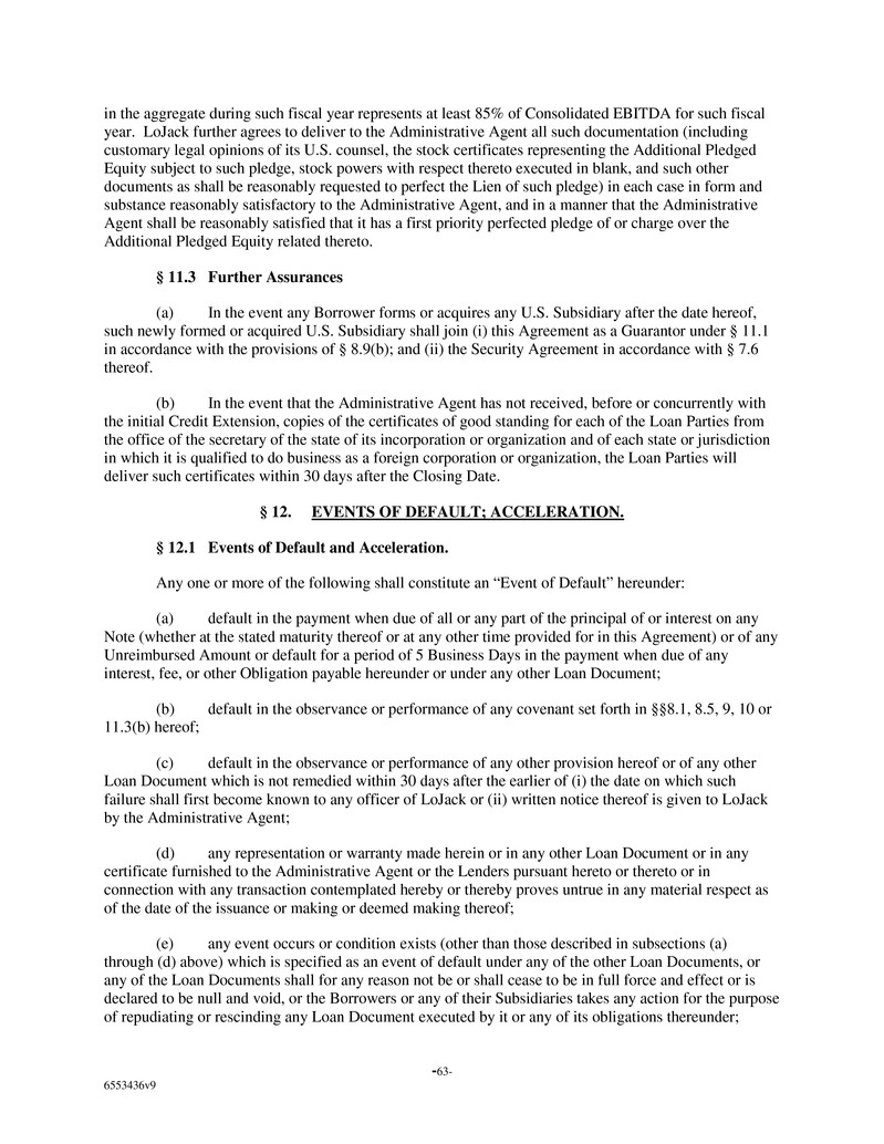 -63- 6553436v9 in the aggregate during such fiscal year represents at least 85% of Consolidated EBITDA for such fiscal year. LoJack further agrees to deliver to the Administrative Agent all such documentation (including customary legal opinions of its U.S. counsel, the stock certificates representing the Additional Pledged Equity subject to such pledge, stock powers with respect thereto executed in blank, and such other documents as shall be reasonably requested to perfect the Lien of such pledge) in each case in form and substance reasonably satisfactory to the Administrative Agent, and in a manner that the Administrative Agent shall be reasonably satisfied that it has a first priority perfected pledge of or charge over the Additional Pledged Equity related thereto. § 11.3 Further Assurances (a) In the event any Borrower forms or acquires any U.S. Subsidiary after the date hereof, such newly formed or acquired U.S. Subsidiary shall join (i) this Agreement as a Guarantor under § 11.1 in accordance with the provisions of § 8.9(b); and (ii) the Security Agreement in accordance with § 7.6 thereof. (b) In the event that the Administrative Agent has not received, before or concurrently with the initial Credit Extension, copies of the certificates of good standing for each of the Loan Parties from the office of the secretary of the state of its incorporation or organization and of each state or jurisdiction in which it is qualified to do business as a foreign corporation or organization, the Loan Parties will deliver such certificates within 30 days after the Closing Date. § 12. EVENTS OF DEFAULT; ACCELERATION. § 12.1 Events of Default and Acceleration. Any one or more of the following shall constitute an “Event of Default” hereunder: (a) default in the payment when due of all or any part of the principal of or interest on any Note (whether at the stated maturity thereof or at any other time provided for in this Agreement) or of any Unreimbursed Amount or default for a period of 5 Business Days in the payment when due of any interest, fee, or other Obligation payable hereunder or under any other Loan Document; (b) default in the observance or performance of any covenant set forth in §§8.1, 8.5, 9, 10 or 11.3(b) hereof; (c) default in the observance or performance of any other provision hereof or of any other Loan Document which is not remedied within 30 days after the earlier of (i) the date on which such failure shall first become known to any officer of LoJack or (ii) written notice thereof is given to LoJack by the Administrative Agent; (d) any representation or warranty made herein or in any other Loan Document or in any certificate furnished to the Administrative Agent or the Lenders pursuant hereto or thereto or in connection with any transaction contemplated hereby or thereby proves untrue in any material respect as of the date of the issuance or making or deemed making thereof; (e) any event occurs or condition exists (other than those described in subsections (a) through (d) above) which is specified as an event of default under any of the other Loan Documents, or any of the Loan Documents shall for any reason not be or shall cease to be in full force and effect or is declared to be null and void, or the Borrowers or any of their Subsidiaries takes any action for the purpose of repudiating or rescinding any Loan Document executed by it or any of its obligations thereunder;