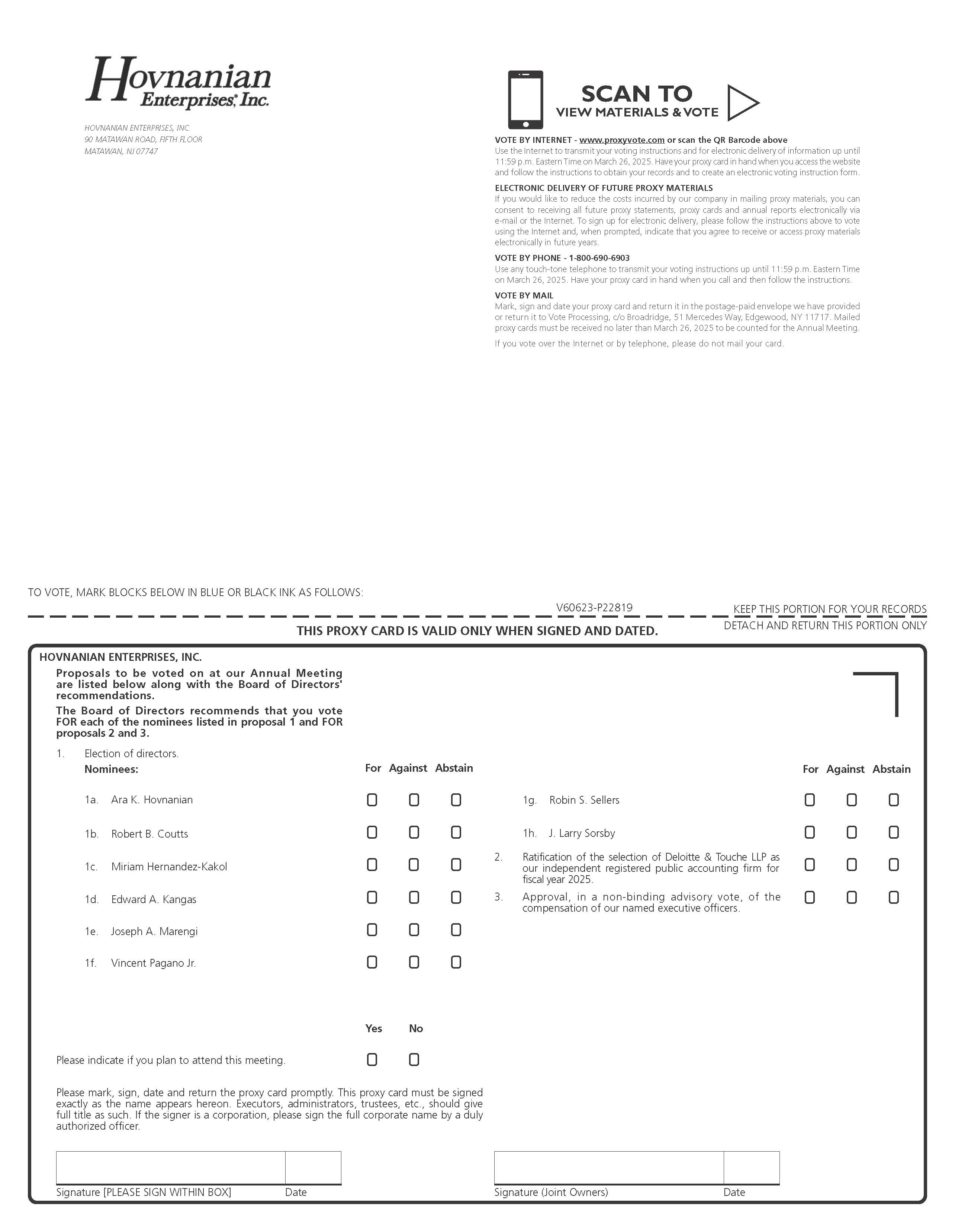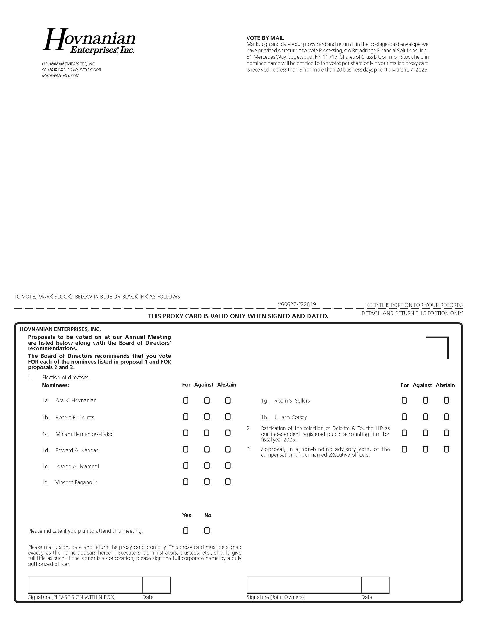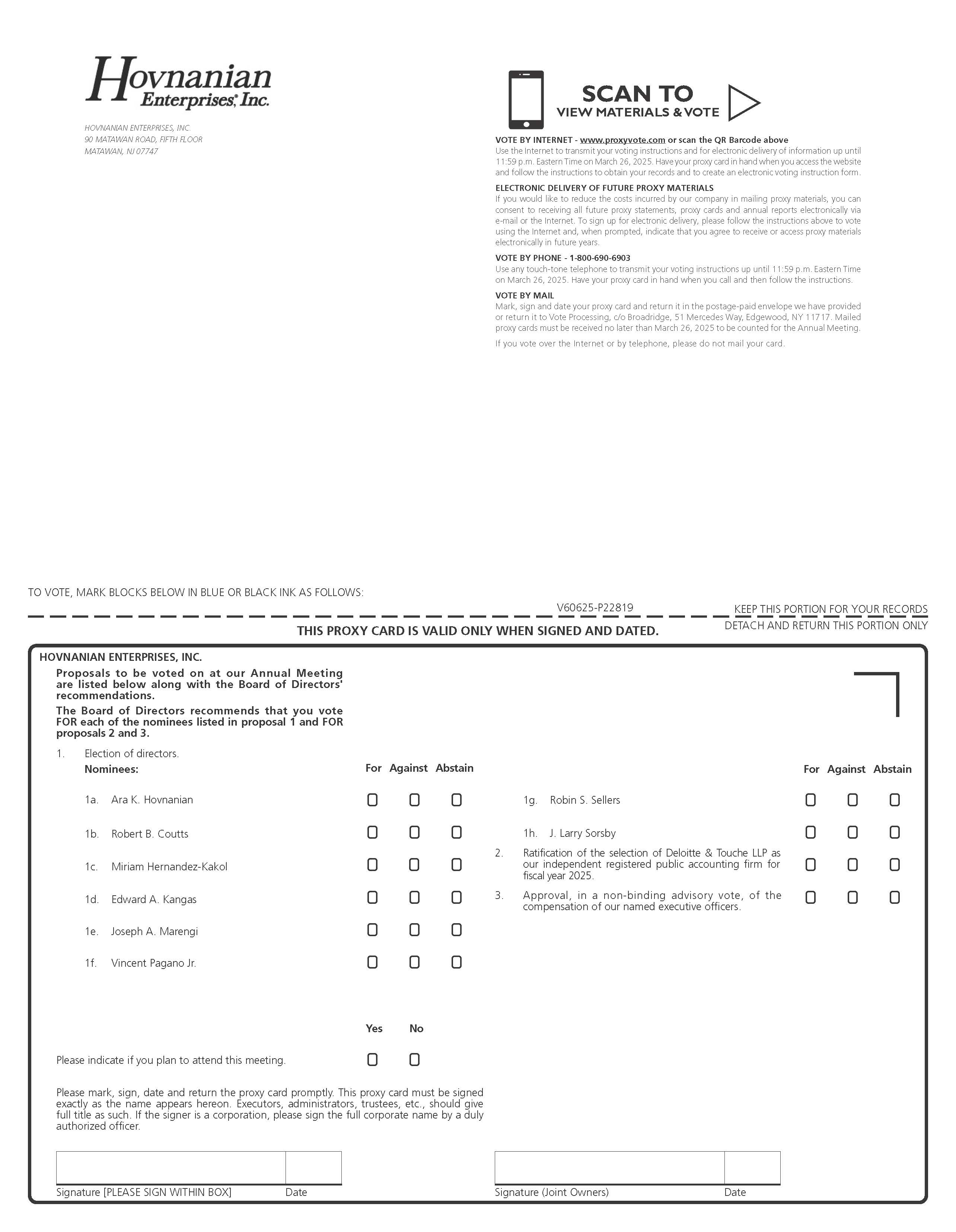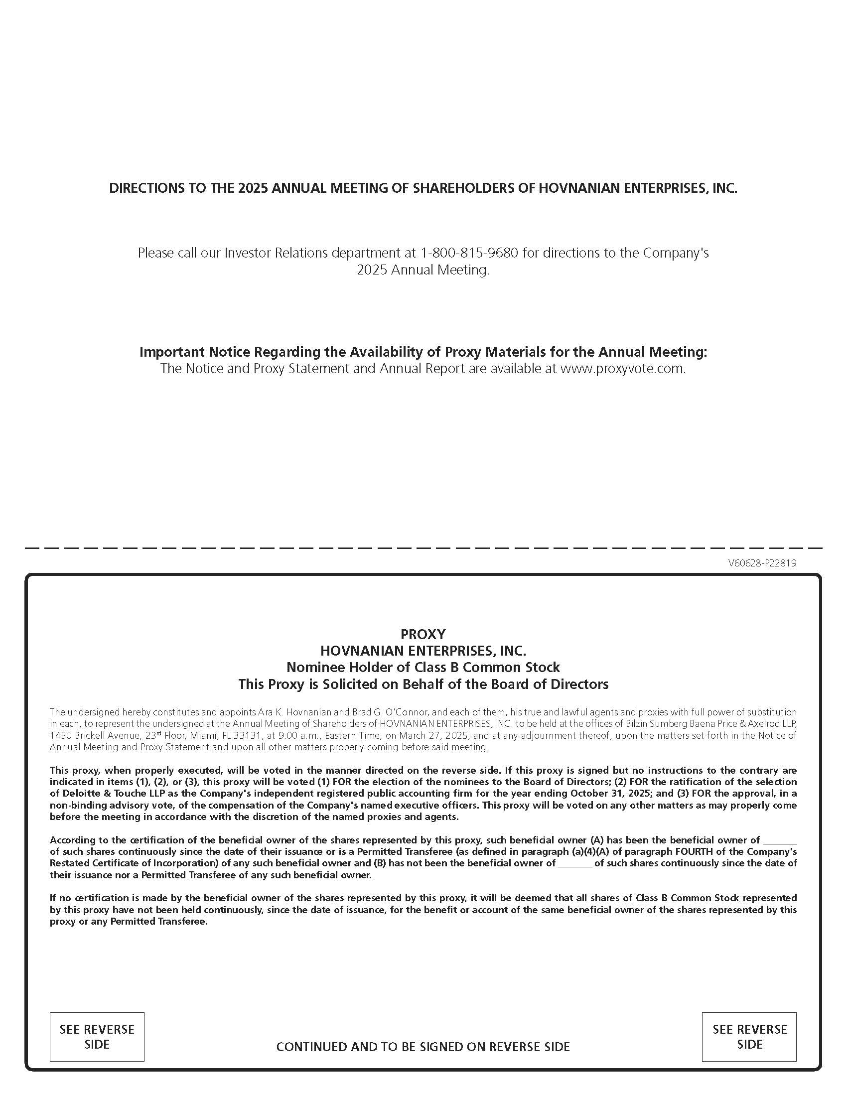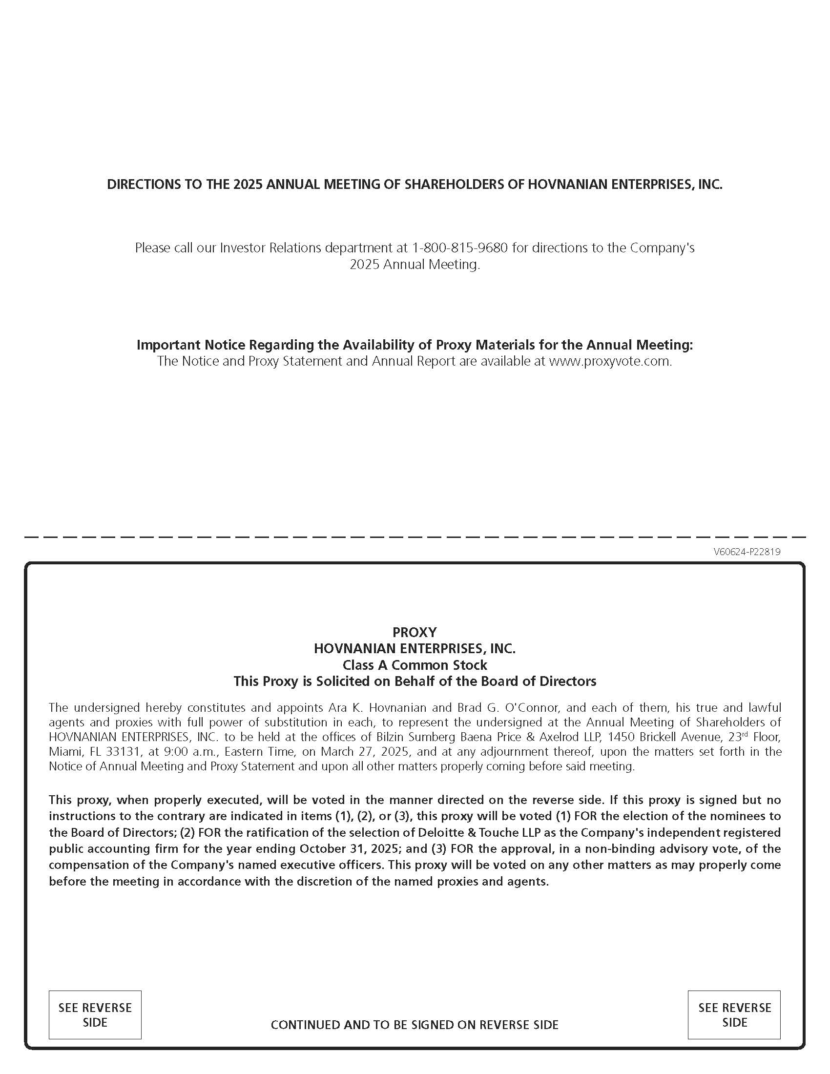 The accompanying proxy is solicited on behalf of the Board of Directors (the “Board”) of Hovnanian Enterprises, Inc. (the “Company”, “we”, “us” or “our”) for use at the 2025 Annual Meeting of Shareholders (the “2025 Annual Meeting”) referred to in the foregoing Notice and at any adjournment thereof.
