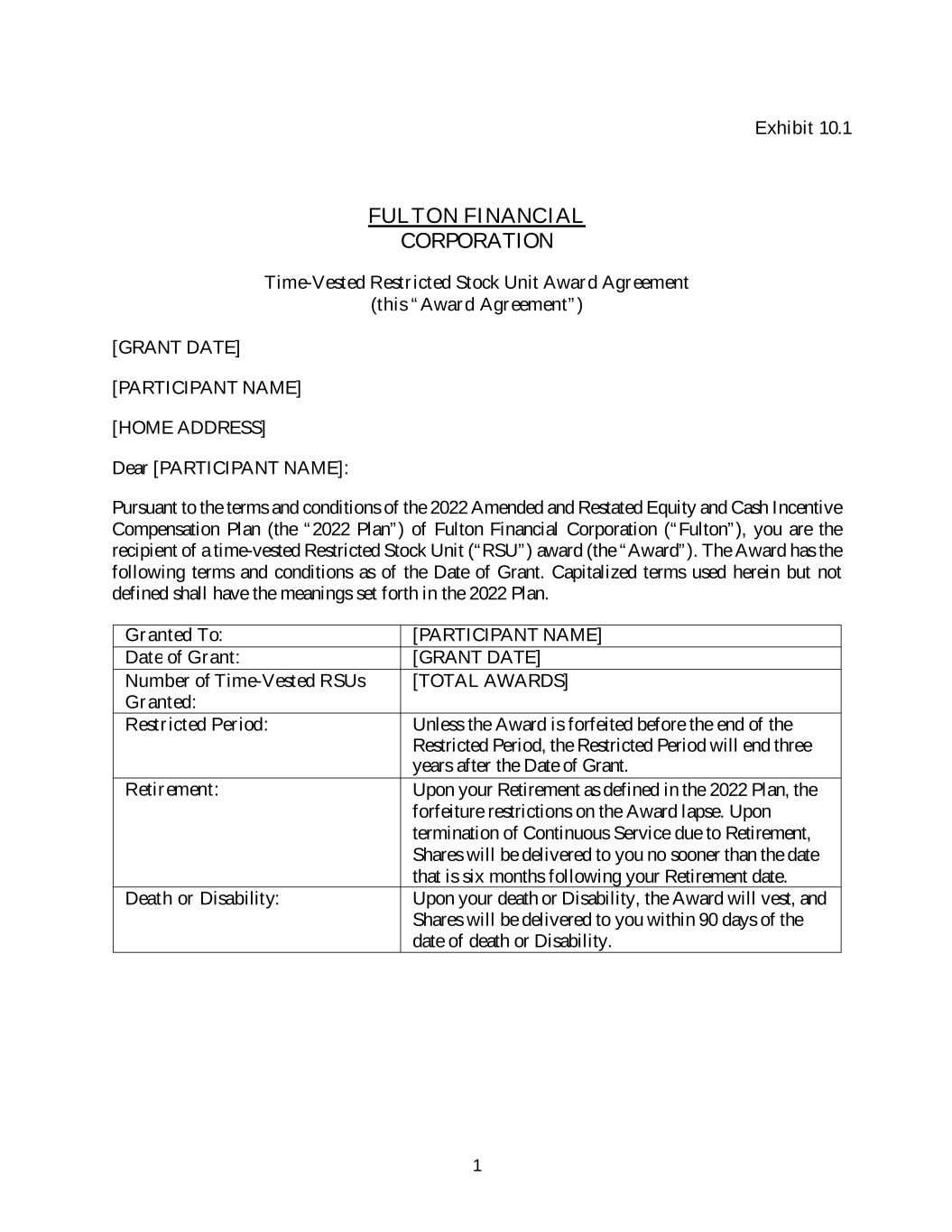 1 Exhibit 10.1 FULTON FINANCIAL CORPORATION Time-Vested Restricted Stock Unit Award Agreement (this “Award Agreement”) [GRANT DATE] [PARTICIPANT NAME] [HOME ADDRESS] Dear [PARTICIPANT NAME]: Pursuant to the terms and conditions of the 2022 Amended and Restated Equity and Cash Incentive Compensation Plan (the “2022 Plan”) of Fulton Financial Corporation (“Fulton”), you are the recipient of a time-vested Restricted Stock Unit (“RSU”) award (the “Award”). The Award has the following terms and conditions as of the Date of Grant. Capitalized terms used herein but not defined shall have the meanings set forth in the 2022 Plan. Granted To: [PARTICIPANT NAME] Date of Grant: [GRANT DATE] Number of Time-Vested RSUs Granted: [TOTAL AWARDS] Restricted Period: Unless the Award is forfeited before the end of the Restricted Period, the Restricted Period will end three years after the Date of Grant. Retirement: Upon your Retirement as defined in the 2022 Plan, the forfeiture restrictions on the Award lapse. Upon termination of Continuous Service due to Retirement, Shares will be delivered to you no sooner than the date that is six months following your Retirement date. Death or Disability: Upon your death or Disability, the Award will vest, and Shares will be delivered to you within 90 days of the date of death or Disability.