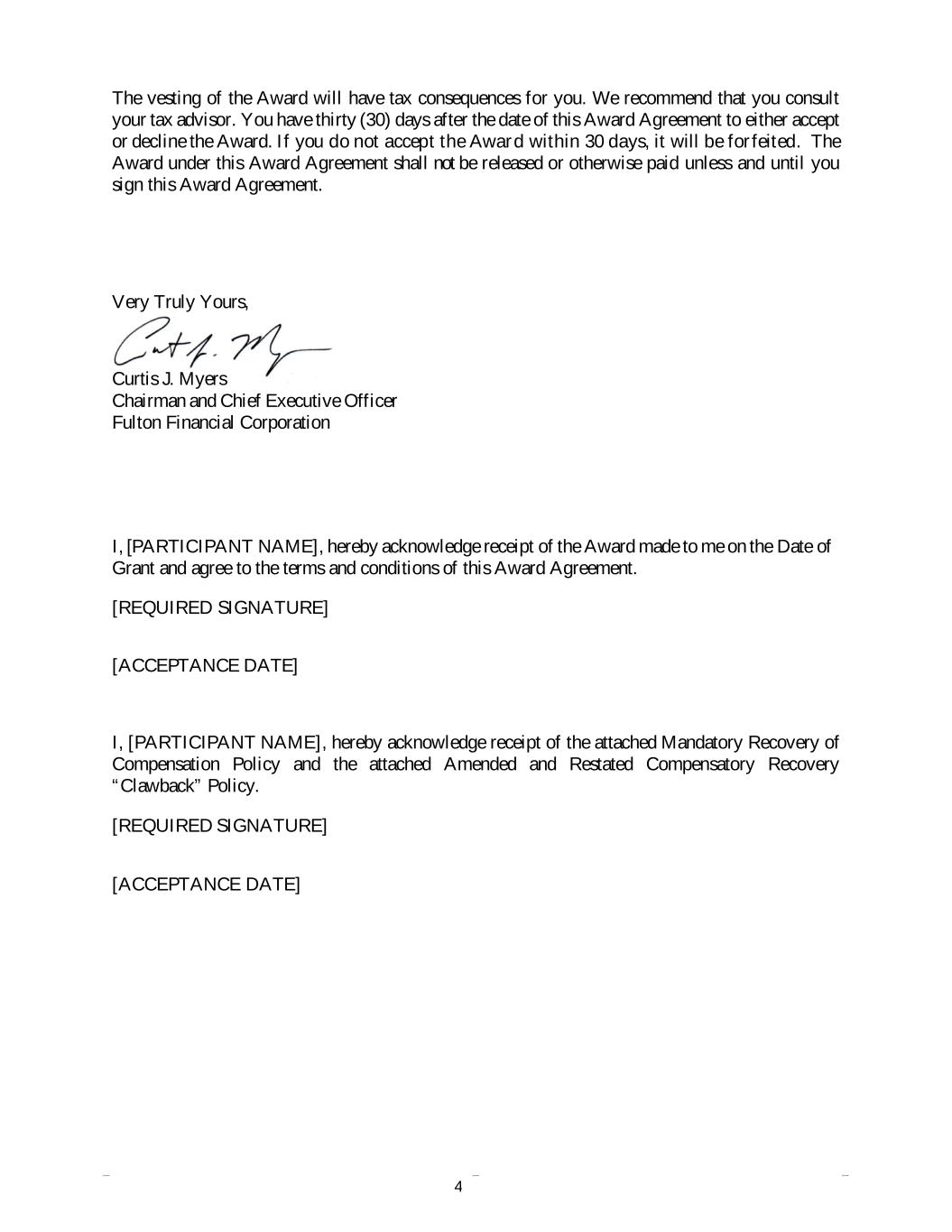 4 [Type here ] [Type here ] [Type here ] The vesting of the Award will have tax consequences for you. We recommend that you consult your tax advisor. You have thirty (30) days after the date of this Award Agreement to either accept or decline the Award. If you do not accept the Award within 30 days, it will be forfeited. The Award under this Award Agreement shall not be released or otherwise paid unless and until you sign this Award Agreement. Very Truly Yours, Curtis J. Myers Chairman and Chief Executive Officer Fulton Financial Corporation I, [PARTICIPANT NAME], hereby acknowledge receipt of the Award made to me on the Date of Grant and agree to the terms and conditions of this Award Agreement. [REQUIRED SIGNATURE] [ACCEPTANCE DATE] I, [PARTICIPANT NAME], hereby acknowledge receipt of the attached Mandatory Recovery of Compensation Policy and the attached Amended and Restated Compensatory Recovery “Clawback” Policy. [REQUIRED SIGNATURE] [ACCEPTANCE DATE]