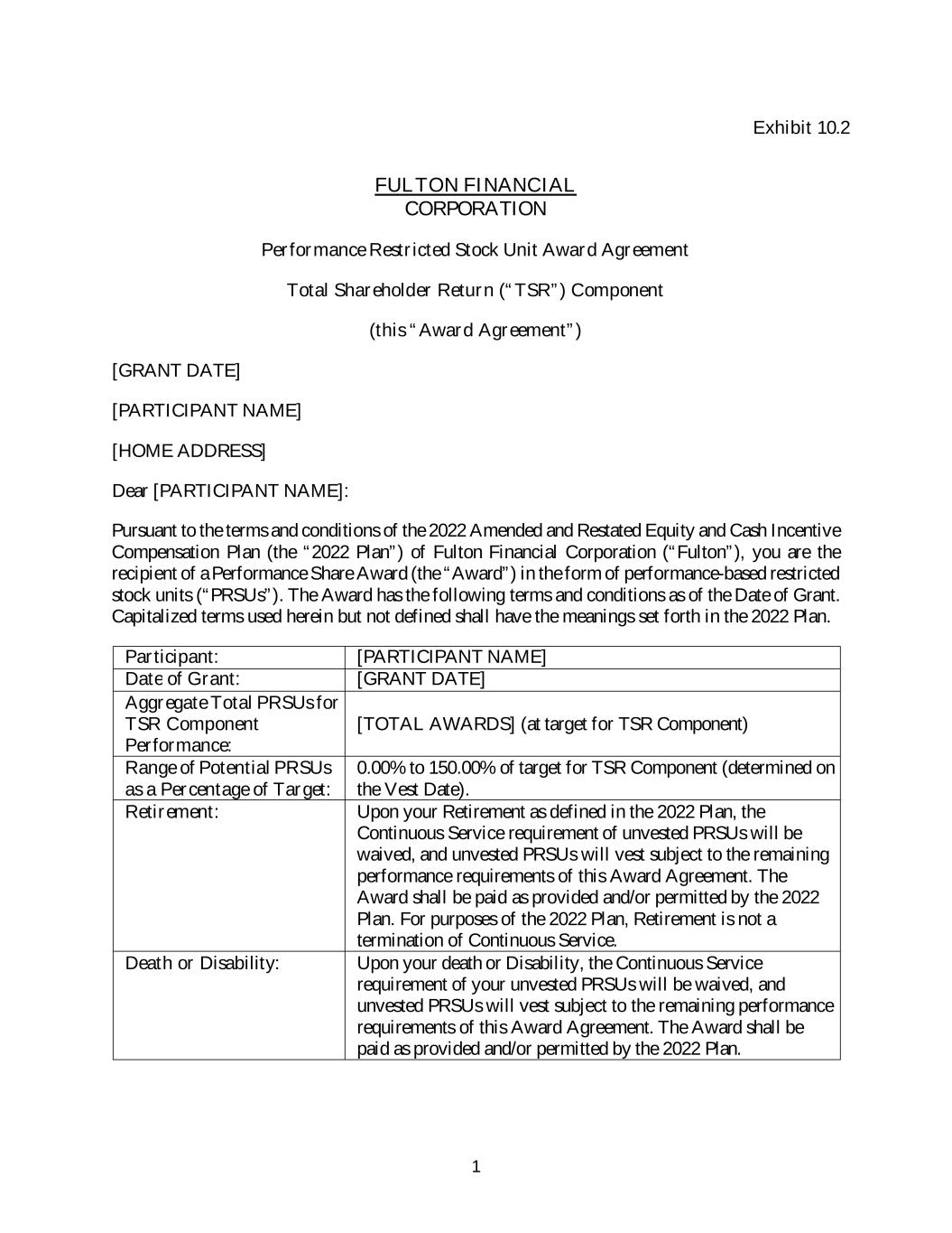 1 Exhibit 10.2 FULTON FINANCIAL CORPORATION Performance Restricted Stock Unit Award Agreement Total Shareholder Return (“TSR”) Component (this “Award Agreement”) [GRANT DATE] [PARTICIPANT NAME] [HOME ADDRESS] Dear [PARTICIPANT NAME]: Pursuant to the terms and conditions of the 2022 Amended and Restated Equity and Cash Incentive Compensation Plan (the “2022 Plan”) of Fulton Financial Corporation (“Fulton”), you are the recipient of a Performance Share Award (the “Award”) in the form of performance-based restricted stock units (“PRSUs”). The Award has the following terms and conditions as of the Date of Grant. Capitalized terms used herein but not defined shall have the meanings set forth in the 2022 Plan. Participant: [PARTICIPANT NAME] Date of Grant: [GRANT DATE] Aggregate Total PRSUs for TSR Component Performance: [TOTAL AWARDS] (at target for TSR Component) Range of Potential PRSUs as a Percentage of Target: 0.00% to 150.00% of target for TSR Component (determined on the Vest Date). Retirement: Upon your Retirement as defined in the 2022 Plan, the Continuous Service requirement of unvested PRSUs will be waived, and unvested PRSUs will vest subject to the remaining performance requirements of this Award Agreement. The Award shall be paid as provided and/or permitted by the 2022 Plan. For purposes of the 2022 Plan, Retirement is not a termination of Continuous Service. Death or Disability: Upon your death or Disability, the Continuous Service requirement of your unvested PRSUs will be waived, and unvested PRSUs will vest subject to the remaining performance requirements of this Award Agreement. The Award shall be paid as provided and/or permitted by the 2022 Plan.