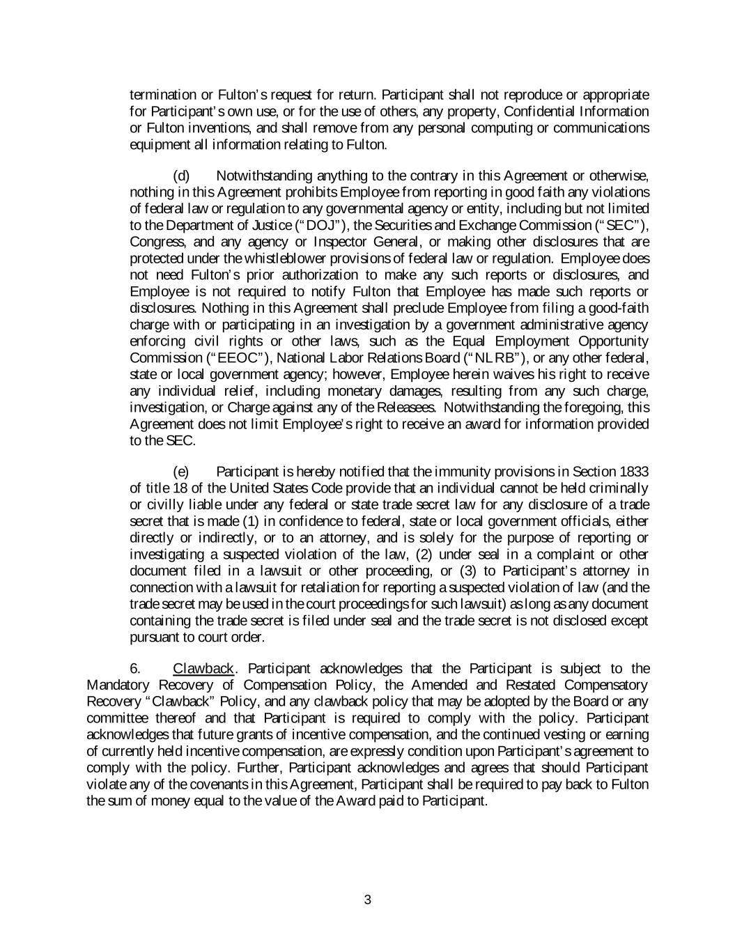 3 termination or Fulton’s request for return. Participant shall not reproduce or appropriate for Participant’s own use, or for the use of others, any property, Confidential Information or Fulton inventions, and shall remove from any personal computing or communications equipment all information relating to Fulton. (d) Notwithstanding anything to the contrary in this Agreement or otherwise, nothing in this Agreement prohibits Employee from reporting in good faith any violations of federal law or regulation to any governmental agency or entity, including but not limited to the Department of Justice (“DOJ”), the Securities and Exchange Commission (“SEC”), Congress, and any agency or Inspector General, or making other disclosures that are protected under the whistleblower provisions of federal law or regulation. Employee does not need Fulton’s prior authorization to make any such reports or disclosures, and Employee is not required to notify Fulton that Employee has made such reports or disclosures. Nothing in this Agreement shall preclude Employee from filing a good-faith charge with or participating in an investigation by a government administrative agency enforcing civil rights or other laws, such as the Equal Employment Opportunity Commission (“EEOC”), National Labor Relations Board (“NLRB”), or any other federal, state or local government agency; however, Employee herein waives his right to receive any individual relief, including monetary damages, resulting from any such charge, investigation, or Charge against any of the Releasees. Notwithstanding the foregoing, this Agreement does not limit Employee’s right to receive an award for information provided to the SEC. (e) Participant is hereby notified that the immunity provisions in Section 1833 of title 18 of the United States Code provide that an individual cannot be held criminally or civilly liable under any federal or state trade secret law for any disclosure of a trade secret that is made (1) in confidence to federal, state or local government officials, either directly or indirectly, or to an attorney, and is solely for the purpose of reporting or investigating a suspected violation of the law, (2) under seal in a complaint or other document filed in a lawsuit or other proceeding, or (3) to Participant’s attorney in connection with a lawsuit for retaliation for reporting a suspected violation of law (and the trade secret may be used in the court proceedings for such lawsuit) as long as any document containing the trade secret is filed under seal and the trade secret is not disclosed except pursuant to court order. 6. Clawback. Participant acknowledges that the Participant is subject to the Mandatory Recovery of Compensation Policy, the Amended and Restated Compensatory Recovery “Clawback” Policy, and any clawback policy that may be adopted by the Board or any committee thereof and that Participant is required to comply with the policy. Participant acknowledges that future grants of incentive compensation, and the continued vesting or earning of currently held incentive compensation, are expressly condition upon Participant’s agreement to comply with the policy. Further, Participant acknowledges and agrees that should Participant violate any of the covenants in this Agreement, Participant shall be required to pay back to Fulton the sum of money equal to the value of the Award paid to Participant.