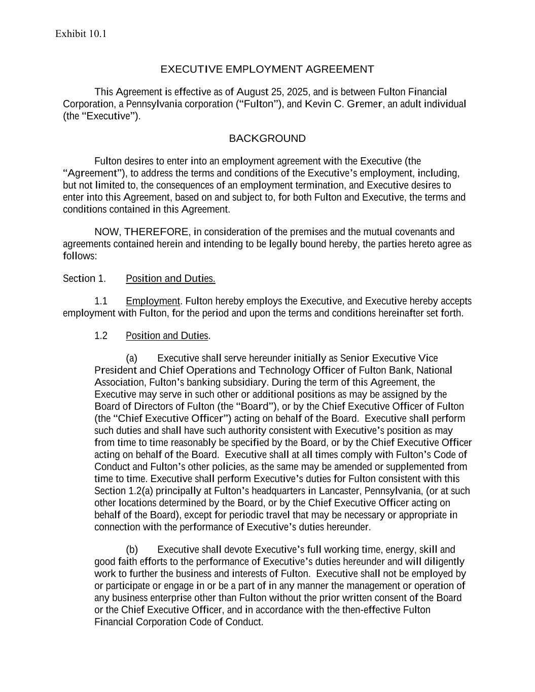 EXECUTIVE EMPLOYMENT AGREEMENT This Agreement is effective as of August 25, 2025, and is between Fulton Financial Corporation, a Pennsylvania corporation (“Fulton”), and Kevin C. Gremer, an adult individual (the “Executive”). BACKGROUND Fulton desires to enter into an employment agreement with the Executive (the “Agreement”), to address the terms and conditions of the Executive’s employment, including, but not limited to, the consequences of an employment termination, and Executive desires to enter into this Agreement, based on and subject to, for both Fulton and Executive, the terms and conditions contained in this Agreement. NOW, THEREFORE, in consideration of the premises and the mutual covenants and agreements contained herein and intending to be legally bound hereby, the parties hereto agree as follows: Section 1. Position and Duties. 1.1 Employment. Fulton hereby employs the Executive, and Executive hereby accepts employment with Fulton, for the period and upon the terms and conditions hereinafter set forth. 1.2 Position and Duties. (a) Executive shall serve hereunder initially as Senior Executive Vice President and Chief Operations and Technology Officer of Fulton Bank, National Association, Fulton’s banking subsidiary. During the term of this Agreement, the Executive may serve in such other or additional positions as may be assigned by the Board of Directors of Fulton (the “Board”), or by the Chief Executive Officer of Fulton (the “Chief Executive Officer”) acting on behalf of the Board. Executive shall perform such duties and shall have such authority consistent with Executive’s position as may from time to time reasonably be specified by the Board, or by the Chief Executive Officer acting on behalf of the Board. Executive shall at all times comply with Fulton’s Code of Conduct and Fulton’s other policies, as the same may be amended or supplemented from time to time. Executive shall perform Executive’s duties for Fulton consistent with this Section 1.2(a) principally at Fulton’s headquarters in Lancaster, Pennsylvania, (or at such other locations determined by the Board, or by the Chief Executive Officer acting on behalf of the Board), except for periodic travel that may be necessary or appropriate in connection with the performance of Executive’s duties hereunder. (b) Executive shall devote Executive’s full working time, energy, skill and good faith efforts to the performance of Executive’s duties hereunder and will diligently work to further the business and interests of Fulton. Executive shall not be employed by or participate or engage in or be a part of in any manner the management or operation of any business enterprise other than Fulton without the prior written consent of the Board or the Chief Executive Officer, and in accordance with the then-effective Fulton Financial Corporation Code of Conduct.