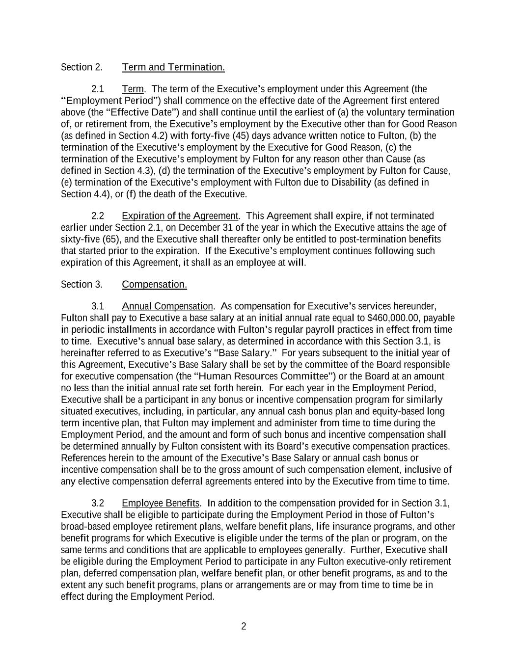 2 Section 2. Term and Termination. 2.1 Term. The term of the Executive’s employment under this Agreement (the “Employment Period”) shall commence on the effective date of the Agreement first entered above (the “Effective Date”) and shall continue until the earliest of (a) the voluntary termination of, or retirement from, the Executive’s employment by the Executive other than for Good Reason (as defined in Section 4.2) with forty-five (45) days advance written notice to Fulton, (b) the termination of the Executive’s employment by the Executive for Good Reason, (c) the termination of the Executive’s employment by Fulton for any reason other than Cause (as defined in Section 4.3), (d) the termination of the Executive’s employment by Fulton for Cause, (e) termination of the Executive’s employment with Fulton due to Disability (as defined in Section 4.4), or (f) the death of the Executive. 2.2 Expiration of the Agreement. This Agreement shall expire, if not terminated earlier under Section 2.1, on December 31 of the year in which the Executive attains the age of sixty-five (65), and the Executive shall thereafter only be entitled to post-termination benefits that started prior to the expiration. If the Executive’s employment continues following such expiration of this Agreement, it shall as an employee at will. Section 3. Compensation. 3.1 Annual Compensation. As compensation for Executive’s services hereunder, Fulton shall pay to Executive a base salary at an initial annual rate equal to $460,000.00, payable in periodic installments in accordance with Fulton’s regular payroll practices in effect from time to time. Executive’s annual base salary, as determined in accordance with this Section 3.1, is hereinafter referred to as Executive’s “Base Salary.” For years subsequent to the initial year of this Agreement, Executive’s Base Salary shall be set by the committee of the Board responsible for executive compensation (the “Human Resources Committee”) or the Board at an amount no less than the initial annual rate set forth herein. For each year in the Employment Period, Executive shall be a participant in any bonus or incentive compensation program for similarly situated executives, including, in particular, any annual cash bonus plan and equity-based long term incentive plan, that Fulton may implement and administer from time to time during the Employment Period, and the amount and form of such bonus and incentive compensation shall be determined annually by Fulton consistent with its Board’s executive compensation practices. References herein to the amount of the Executive’s Base Salary or annual cash bonus or incentive compensation shall be to the gross amount of such compensation element, inclusive of any elective compensation deferral agreements entered into by the Executive from time to time. 3.2 Employee Benefits. In addition to the compensation provided for in Section 3.1, Executive shall be eligible to participate during the Employment Period in those of Fulton’s broad-based employee retirement plans, welfare benefit plans, life insurance programs, and other benefit programs for which Executive is eligible under the terms of the plan or program, on the same terms and conditions that are applicable to employees generally. Further, Executive shall be eligible during the Employment Period to participate in any Fulton executive-only retirement plan, deferred compensation plan, welfare benefit plan, or other benefit programs, as and to the extent any such benefit programs, plans or arrangements are or may from time to time be in effect during the Employment Period.