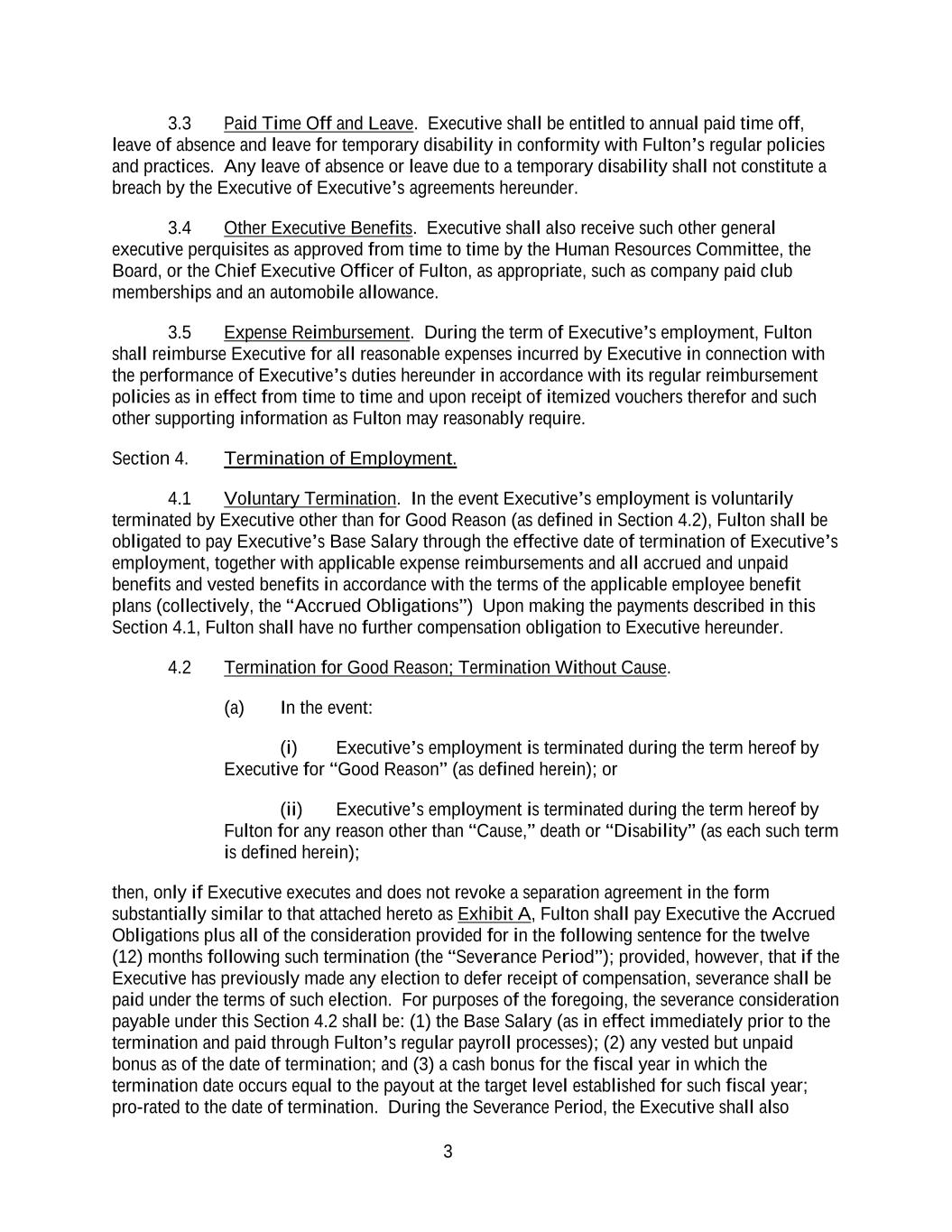 3 3.3 Paid Time Off and Leave. Executive shall be entitled to annual paid time off, leave of absence and leave for temporary disability in conformity with Fulton’s regular policies and practices. Any leave of absence or leave due to a temporary disability shall not constitute a breach by the Executive of Executive’s agreements hereunder. 3.4 Other Executive Benefits. Executive shall also receive such other general executive perquisites as approved from time to time by the Human Resources Committee, the Board, or the Chief Executive Officer of Fulton, as appropriate, such as company paid club memberships and an automobile allowance. 3.5 Expense Reimbursement. During the term of Executive’s employment, Fulton shall reimburse Executive for all reasonable expenses incurred by Executive in connection with the performance of Executive’s duties hereunder in accordance with its regular reimbursement policies as in effect from time to time and upon receipt of itemized vouchers therefor and such other supporting information as Fulton may reasonably require. Section 4. Termination of Employment. 4.1 Voluntary Termination. In the event Executive’s employment is voluntarily terminated by Executive other than for Good Reason (as defined in Section 4.2), Fulton shall be obligated to pay Executive’s Base Salary through the effective date of termination of Executive’s employment, together with applicable expense reimbursements and all accrued and unpaid benefits and vested benefits in accordance with the terms of the applicable employee benefit plans (collectively, the “Accrued Obligations”) Upon making the payments described in this Section 4.1, Fulton shall have no further compensation obligation to Executive hereunder. 4.2 Termination for Good Reason; Termination Without Cause. (a) In the event: (i) Executive’s employment is terminated during the term hereof by Executive for “Good Reason” (as defined herein); or (ii) Executive’s employment is terminated during the term hereof by Fulton for any reason other than “Cause,” death or “Disability” (as each such term is defined herein); then, only if Executive executes and does not revoke a separation agreement in the form substantially similar to that attached hereto as Exhibit A, Fulton shall pay Executive the Accrued Obligations plus all of the consideration provided for in the following sentence for the twelve (12) months following such termination (the “Severance Period”); provided, however, that if the Executive has previously made any election to defer receipt of compensation, severance shall be paid under the terms of such election. For purposes of the foregoing, the severance consideration payable under this Section 4.2 shall be: (1) the Base Salary (as in effect immediately prior to the termination and paid through Fulton’s regular payroll processes); (2) any vested but unpaid bonus as of the date of termination; and (3) a cash bonus for the fiscal year in which the termination date occurs equal to the payout at the target level established for such fiscal year; pro-rated to the date of termination. During the Severance Period, the Executive shall also