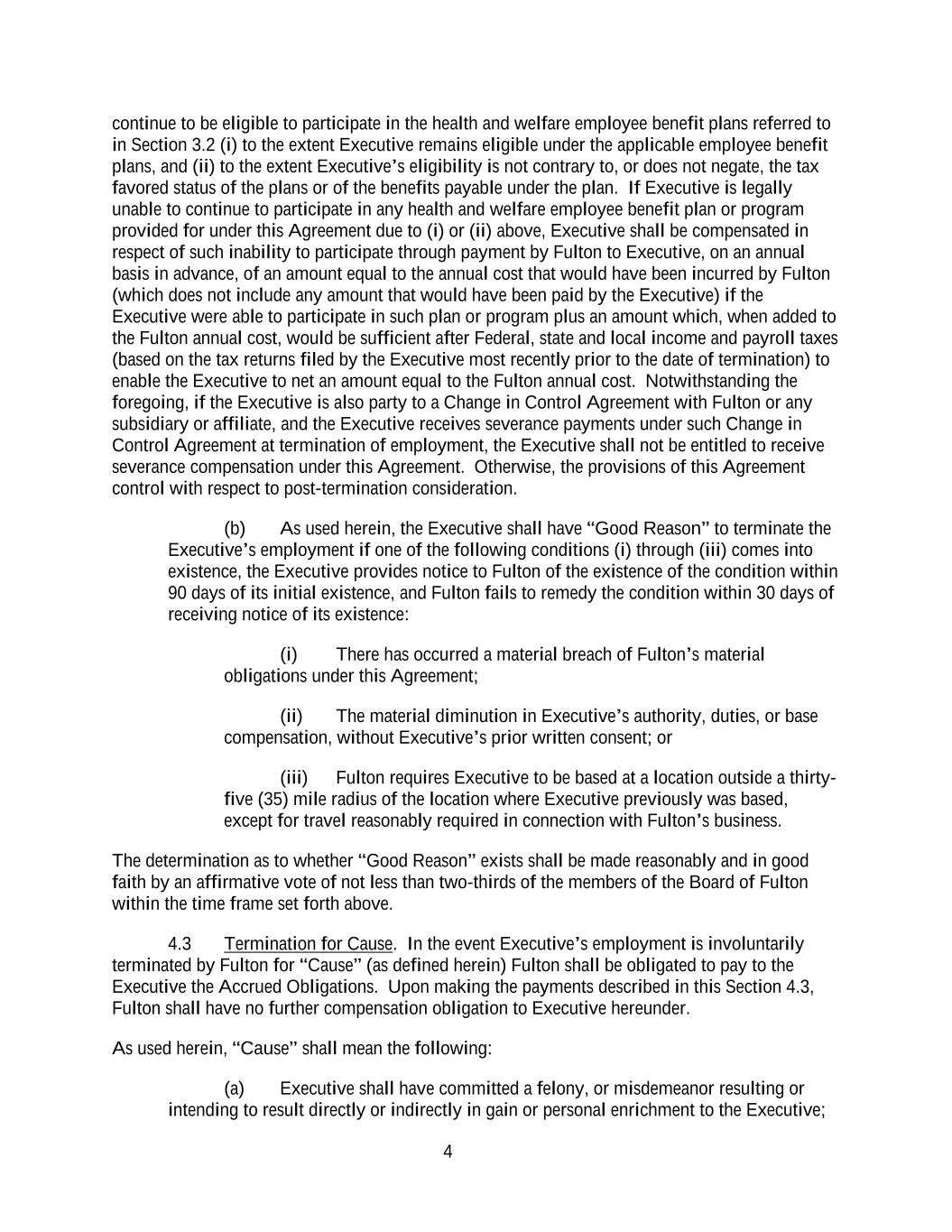 4 continue to be eligible to participate in the health and welfare employee benefit plans referred to in Section 3.2 (i) to the extent Executive remains eligible under the applicable employee benefit plans, and (ii) to the extent Executive’s eligibility is not contrary to, or does not negate, the tax favored status of the plans or of the benefits payable under the plan. If Executive is legally unable to continue to participate in any health and welfare employee benefit plan or program provided for under this Agreement due to (i) or (ii) above, Executive shall be compensated in respect of such inability to participate through payment by Fulton to Executive, on an annual basis in advance, of an amount equal to the annual cost that would have been incurred by Fulton (which does not include any amount that would have been paid by the Executive) if the Executive were able to participate in such plan or program plus an amount which, when added to the Fulton annual cost, would be sufficient after Federal, state and local income and payroll taxes (based on the tax returns filed by the Executive most recently prior to the date of termination) to enable the Executive to net an amount equal to the Fulton annual cost. Notwithstanding the foregoing, if the Executive is also party to a Change in Control Agreement with Fulton or any subsidiary or affiliate, and the Executive receives severance payments under such Change in Control Agreement at termination of employment, the Executive shall not be entitled to receive severance compensation under this Agreement. Otherwise, the provisions of this Agreement control with respect to post-termination consideration. (b) As used herein, the Executive shall have “Good Reason” to terminate the Executive’s employment if one of the following conditions (i) through (iii) comes into existence, the Executive provides notice to Fulton of the existence of the condition within 90 days of its initial existence, and Fulton fails to remedy the condition within 30 days of receiving notice of its existence: (i) There has occurred a material breach of Fulton’s material obligations under this Agreement; (ii) The material diminution in Executive’s authority, duties, or base compensation, without Executive’s prior written consent; or (iii) Fulton requires Executive to be based at a location outside a thirty- five (35) mile radius of the location where Executive previously was based, except for travel reasonably required in connection with Fulton’s business. The determination as to whether “Good Reason” exists shall be made reasonably and in good faith by an affirmative vote of not less than two-thirds of the members of the Board of Fulton within the time frame set forth above. 4.3 Termination for Cause. In the event Executive’s employment is involuntarily terminated by Fulton for “Cause” (as defined herein) Fulton shall be obligated to pay to the Executive the Accrued Obligations. Upon making the payments described in this Section 4.3, Fulton shall have no further compensation obligation to Executive hereunder. As used herein, “Cause” shall mean the following: (a) Executive shall have committed a felony, or misdemeanor resulting or intending to result directly or indirectly in gain or personal enrichment to the Executive;