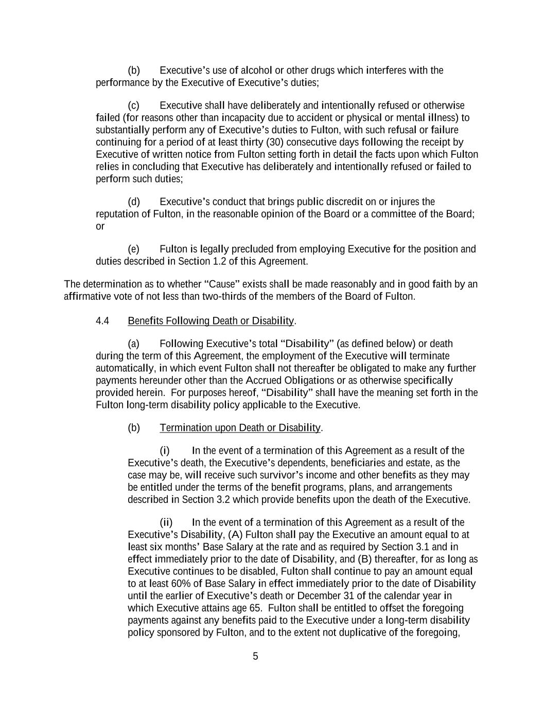 5 (b) Executive’s use of alcohol or other drugs which interferes with the performance by the Executive of Executive’s duties; (c) Executive shall have deliberately and intentionally refused or otherwise failed (for reasons other than incapacity due to accident or physical or mental illness) to substantially perform any of Executive’s duties to Fulton, with such refusal or failure continuing for a period of at least thirty (30) consecutive days following the receipt by Executive of written notice from Fulton setting forth in detail the facts upon which Fulton relies in concluding that Executive has deliberately and intentionally refused or failed to perform such duties; (d) Executive’s conduct that brings public discredit on or injures the reputation of Fulton, in the reasonable opinion of the Board or a committee of the Board; or (e) Fulton is legally precluded from employing Executive for the position and duties described in Section 1.2 of this Agreement. The determination as to whether “Cause” exists shall be made reasonably and in good faith by an affirmative vote of not less than two-thirds of the members of the Board of Fulton. 4.4 Benefits Following Death or Disability. (a) Following Executive’s total “Disability” (as defined below) or death during the term of this Agreement, the employment of the Executive will terminate automatically, in which event Fulton shall not thereafter be obligated to make any further payments hereunder other than the Accrued Obligations or as otherwise specifically provided herein. For purposes hereof, “Disability” shall have the meaning set forth in the Fulton long-term disability policy applicable to the Executive. (b) Termination upon Death or Disability. (i) In the event of a termination of this Agreement as a result of the Executive’s death, the Executive’s dependents, beneficiaries and estate, as the case may be, will receive such survivor’s income and other benefits as they may be entitled under the terms of the benefit programs, plans, and arrangements described in Section 3.2 which provide benefits upon the death of the Executive. (ii) In the event of a termination of this Agreement as a result of the Executive’s Disability, (A) Fulton shall pay the Executive an amount equal to at least six months’ Base Salary at the rate and as required by Section 3.1 and in effect immediately prior to the date of Disability, and (B) thereafter, for as long as Executive continues to be disabled, Fulton shall continue to pay an amount equal to at least 60% of Base Salary in effect immediately prior to the date of Disability until the earlier of Executive’s death or December 31 of the calendar year in which Executive attains age 65. Fulton shall be entitled to offset the foregoing payments against any benefits paid to the Executive under a long-term disability policy sponsored by Fulton, and to the extent not duplicative of the foregoing,
