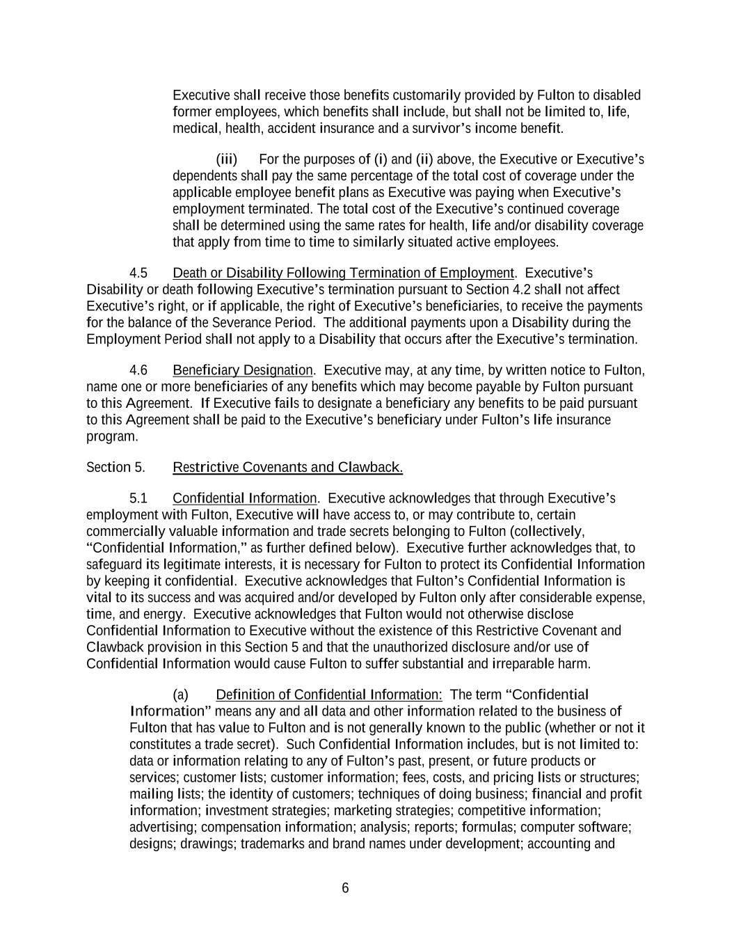 6 Executive shall receive those benefits customarily provided by Fulton to disabled former employees, which benefits shall include, but shall not be limited to, life, medical, health, accident insurance and a survivor’s income benefit. (iii) For the purposes of (i) and (ii) above, the Executive or Executive’s dependents shall pay the same percentage of the total cost of coverage under the applicable employee benefit plans as Executive was paying when Executive’s employment terminated. The total cost of the Executive’s continued coverage shall be determined using the same rates for health, life and/or disability coverage that apply from time to time to similarly situated active employees. 4.5 Death or Disability Following Termination of Employment. Executive’s Disability or death following Executive’s termination pursuant to Section 4.2 shall not affect Executive’s right, or if applicable, the right of Executive’s beneficiaries, to receive the payments for the balance of the Severance Period. The additional payments upon a Disability during the Employment Period shall not apply to a Disability that occurs after the Executive’s termination. 4.6 Beneficiary Designation. Executive may, at any time, by written notice to Fulton, name one or more beneficiaries of any benefits which may become payable by Fulton pursuant to this Agreement. If Executive fails to designate a beneficiary any benefits to be paid pursuant to this Agreement shall be paid to the Executive’s beneficiary under Fulton’s life insurance program. Section 5. Restrictive Covenants and Clawback. 5.1 Confidential Information. Executive acknowledges that through Executive’s employment with Fulton, Executive will have access to, or may contribute to, certain commercially valuable information and trade secrets belonging to Fulton (collectively, “Confidential Information,” as further defined below). Executive further acknowledges that, to safeguard its legitimate interests, it is necessary for Fulton to protect its Confidential Information by keeping it confidential. Executive acknowledges that Fulton’s Confidential Information is vital to its success and was acquired and/or developed by Fulton only after considerable expense, time, and energy. Executive acknowledges that Fulton would not otherwise disclose Confidential Information to Executive without the existence of this Restrictive Covenant and Clawback provision in this Section 5 and that the unauthorized disclosure and/or use of Confidential Information would cause Fulton to suffer substantial and irreparable harm. (a) Definition of Confidential Information: The term “Confidential Information” means any and all data and other information related to the business of Fulton that has value to Fulton and is not generally known to the public (whether or not it constitutes a trade secret). Such Confidential Information includes, but is not limited to: data or information relating to any of Fulton’s past, present, or future products or services; customer lists; customer information; fees, costs, and pricing lists or structures; mailing lists; the identity of customers; techniques of doing business; financial and profit information; investment strategies; marketing strategies; competitive information; advertising; compensation information; analysis; reports; formulas; computer software; designs; drawings; trademarks and brand names under development; accounting and