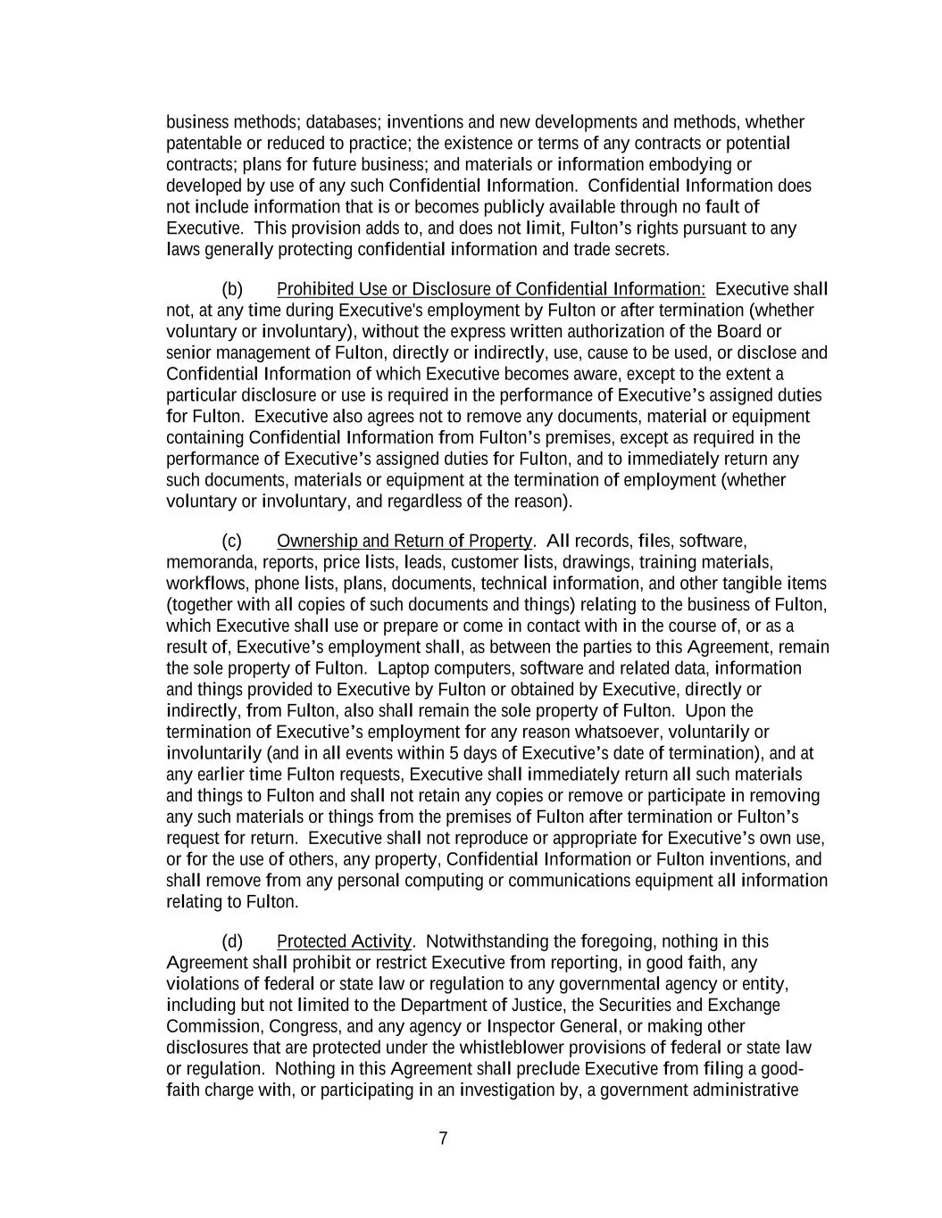 7 business methods; databases; inventions and new developments and methods, whether patentable or reduced to practice; the existence or terms of any contracts or potential contracts; plans for future business; and materials or information embodying or developed by use of any such Confidential Information. Confidential Information does not include information that is or becomes publicly available through no fault of Executive. This provision adds to, and does not limit, Fulton’s rights pursuant to any laws generally protecting confidential information and trade secrets. (b) Prohibited Use or Disclosure of Confidential Information: Executive shall not, at any time during Executive's employment by Fulton or after termination (whether voluntary or involuntary), without the express written authorization of the Board or senior management of Fulton, directly or indirectly, use, cause to be used, or disclose and Confidential Information of which Executive becomes aware, except to the extent a particular disclosure or use is required in the performance of Executive’s assigned duties for Fulton. Executive also agrees not to remove any documents, material or equipment containing Confidential Information from Fulton’s premises, except as required in the performance of Executive’s assigned duties for Fulton, and to immediately return any such documents, materials or equipment at the termination of employment (whether voluntary or involuntary, and regardless of the reason). (c) Ownership and Return of Property. All records, files, software, memoranda, reports, price lists, leads, customer lists, drawings, training materials, workflows, phone lists, plans, documents, technical information, and other tangible items (together with all copies of such documents and things) relating to the business of Fulton, which Executive shall use or prepare or come in contact with in the course of, or as a result of, Executive’s employment shall, as between the parties to this Agreement, remain the sole property of Fulton. Laptop computers, software and related data, information and things provided to Executive by Fulton or obtained by Executive, directly or indirectly, from Fulton, also shall remain the sole property of Fulton. Upon the termination of Executive’s employment for any reason whatsoever, voluntarily or involuntarily (and in all events within 5 days of Executive’s date of termination), and at any earlier time Fulton requests, Executive shall immediately return all such materials and things to Fulton and shall not retain any copies or remove or participate in removing any such materials or things from the premises of Fulton after termination or Fulton’s request for return. Executive shall not reproduce or appropriate for Executive’s own use, or for the use of others, any property, Confidential Information or Fulton inventions, and shall remove from any personal computing or communications equipment all information relating to Fulton. (d) Protected Activity. Notwithstanding the foregoing, nothing in this Agreement shall prohibit or restrict Executive from reporting, in good faith, any violations of federal or state law or regulation to any governmental agency or entity, including but not limited to the Department of Justice, the Securities and Exchange Commission, Congress, and any agency or Inspector General, or making other disclosures that are protected under the whistleblower provisions of federal or state law or regulation. Nothing in this Agreement shall preclude Executive from filing a good- faith charge with, or participating in an investigation by, a government administrative