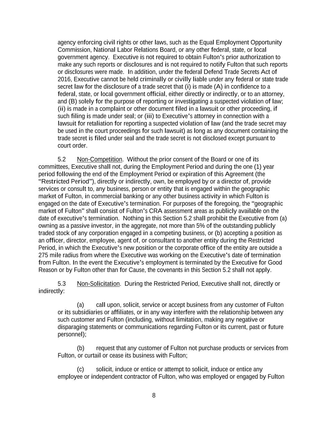8 agency enforcing civil rights or other laws, such as the Equal Employment Opportunity Commission, National Labor Relations Board, or any other federal, state, or local government agency. Executive is not required to obtain Fulton’s prior authorization to make any such reports or disclosures and is not required to notify Fulton that such reports or disclosures were made. In addition, under the federal Defend Trade Secrets Act of 2016, Executive cannot be held criminally or civilly liable under any federal or state trade secret law for the disclosure of a trade secret that (i) is made (A) in confidence to a federal, state, or local government official, either directly or indirectly, or to an attorney, and (B) solely for the purpose of reporting or investigating a suspected violation of law; (ii) is made in a complaint or other document filed in a lawsuit or other proceeding, if such filing is made under seal; or (iii) to Executive’s attorney in connection with a lawsuit for retaliation for reporting a suspected violation of law (and the trade secret may be used in the court proceedings for such lawsuit) as long as any document containing the trade secret is filed under seal and the trade secret is not disclosed except pursuant to court order. 5.2 Non-Competition. Without the prior consent of the Board or one of its committees, Executive shall not, during the Employment Period and during the one (1) year period following the end of the Employment Period or expiration of this Agreement (the “Restricted Period”), directly or indirectly, own, be employed by or a director of, provide services or consult to, any business, person or entity that is engaged within the geographic market of Fulton, in commercial banking or any other business activity in which Fulton is engaged on the date of Executive’s termination. For purposes of the foregoing, the “geographic market of Fulton” shall consist of Fulton’s CRA assessment areas as publicly available on the date of executive’s termination. Nothing in this Section 5.2 shall prohibit the Executive from (a) owning as a passive investor, in the aggregate, not more than 5% of the outstanding publicly traded stock of any corporation engaged in a competing business, or (b) accepting a position as an officer, director, employee, agent of, or consultant to another entity during the Restricted Period, in which the Executive’s new position or the corporate office of the entity are outside a 275 mile radius from where the Executive was working on the Executive’s date of termination from Fulton. In the event the Executive’s employment is terminated by the Executive for Good Reason or by Fulton other than for Cause, the covenants in this Section 5.2 shall not apply. 5.3 Non-Solicitation. During the Restricted Period, Executive shall not, directly or indirectly: (a) call upon, solicit, service or accept business from any customer of Fulton or its subsidiaries or affiliates, or in any way interfere with the relationship between any such customer and Fulton (including, without limitation, making any negative or disparaging statements or communications regarding Fulton or its current, past or future personnel); (b) request that any customer of Fulton not purchase products or services from Fulton, or curtail or cease its business with Fulton; (c) solicit, induce or entice or attempt to solicit, induce or entice any employee or independent contractor of Fulton, who was employed or engaged by Fulton