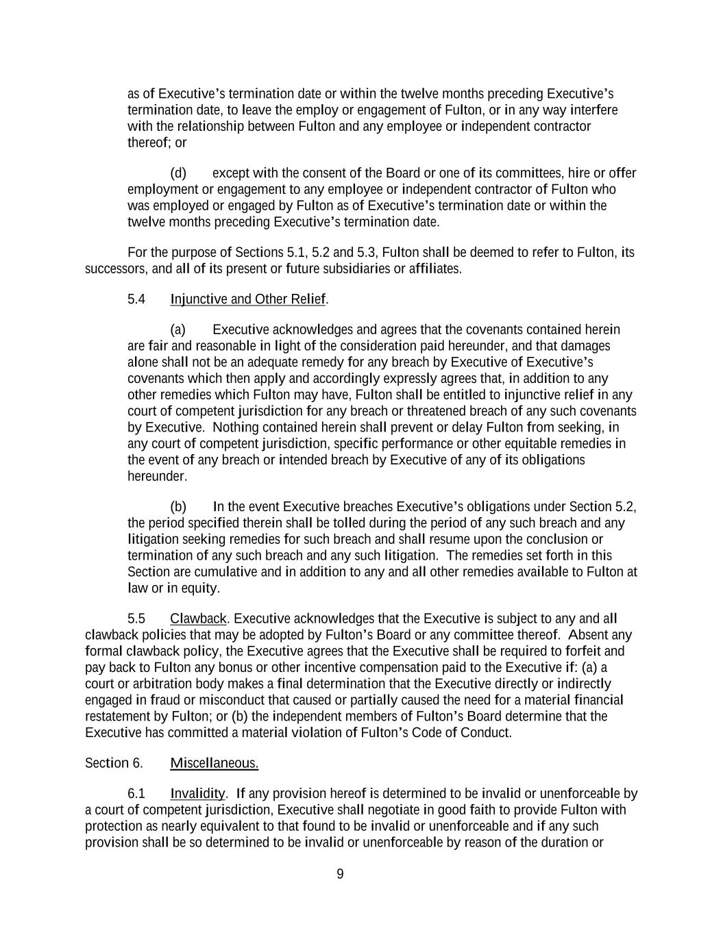 9 as of Executive’s termination date or within the twelve months preceding Executive’s termination date, to leave the employ or engagement of Fulton, or in any way interfere with the relationship between Fulton and any employee or independent contractor thereof; or (d) except with the consent of the Board or one of its committees, hire or offer employment or engagement to any employee or independent contractor of Fulton who was employed or engaged by Fulton as of Executive’s termination date or within the twelve months preceding Executive’s termination date. For the purpose of Sections 5.1, 5.2 and 5.3, Fulton shall be deemed to refer to Fulton, its successors, and all of its present or future subsidiaries or affiliates. 5.4 Injunctive and Other Relief. (a) Executive acknowledges and agrees that the covenants contained herein are fair and reasonable in light of the consideration paid hereunder, and that damages alone shall not be an adequate remedy for any breach by Executive of Executive’s covenants which then apply and accordingly expressly agrees that, in addition to any other remedies which Fulton may have, Fulton shall be entitled to injunctive relief in any court of competent jurisdiction for any breach or threatened breach of any such covenants by Executive. Nothing contained herein shall prevent or delay Fulton from seeking, in any court of competent jurisdiction, specific performance or other equitable remedies in the event of any breach or intended breach by Executive of any of its obligations hereunder. (b) In the event Executive breaches Executive’s obligations under Section 5.2, the period specified therein shall be tolled during the period of any such breach and any litigation seeking remedies for such breach and shall resume upon the conclusion or termination of any such breach and any such litigation. The remedies set forth in this Section are cumulative and in addition to any and all other remedies available to Fulton at law or in equity. 5.5 Clawback. Executive acknowledges that the Executive is subject to any and all clawback policies that may be adopted by Fulton’s Board or any committee thereof. Absent any formal clawback policy, the Executive agrees that the Executive shall be required to forfeit and pay back to Fulton any bonus or other incentive compensation paid to the Executive if: (a) a court or arbitration body makes a final determination that the Executive directly or indirectly engaged in fraud or misconduct that caused or partially caused the need for a material financial restatement by Fulton; or (b) the independent members of Fulton’s Board determine that the Executive has committed a material violation of Fulton’s Code of Conduct. Section 6. Miscellaneous. 6.1 Invalidity. If any provision hereof is determined to be invalid or unenforceable by a court of competent jurisdiction, Executive shall negotiate in good faith to provide Fulton with protection as nearly equivalent to that found to be invalid or unenforceable and if any such provision shall be so determined to be invalid or unenforceable by reason of the duration or