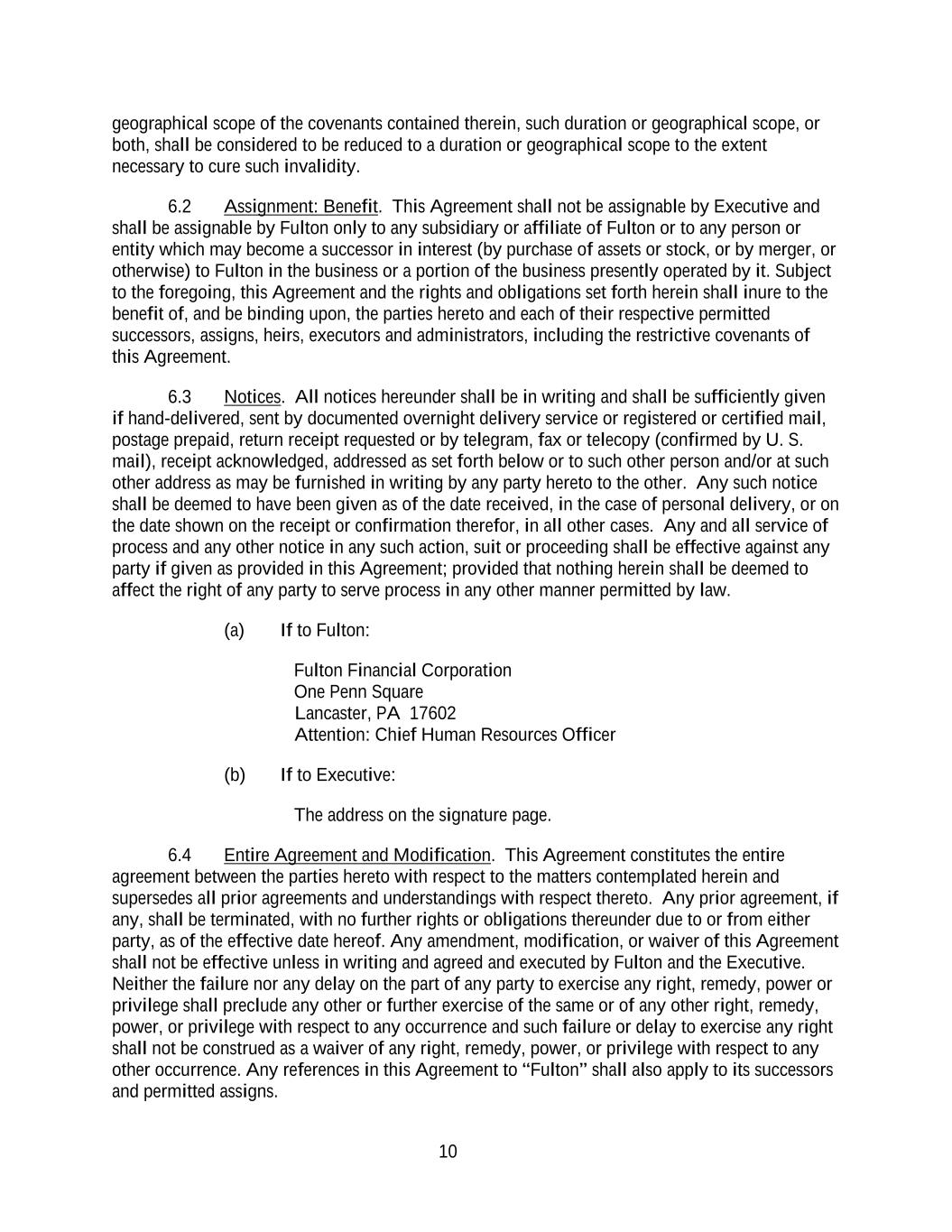 10 geographical scope of the covenants contained therein, such duration or geographical scope, or both, shall be considered to be reduced to a duration or geographical scope to the extent necessary to cure such invalidity. 6.2 Assignment: Benefit. This Agreement shall not be assignable by Executive and shall be assignable by Fulton only to any subsidiary or affiliate of Fulton or to any person or entity which may become a successor in interest (by purchase of assets or stock, or by merger, or otherwise) to Fulton in the business or a portion of the business presently operated by it. Subject to the foregoing, this Agreement and the rights and obligations set forth herein shall inure to the benefit of, and be binding upon, the parties hereto and each of their respective permitted successors, assigns, heirs, executors and administrators, including the restrictive covenants of this Agreement. 6.3 Notices. All notices hereunder shall be in writing and shall be sufficiently given if hand-delivered, sent by documented overnight delivery service or registered or certified mail, postage prepaid, return receipt requested or by telegram, fax or telecopy (confirmed by U. S. mail), receipt acknowledged, addressed as set forth below or to such other person and/or at such other address as may be furnished in writing by any party hereto to the other. Any such notice shall be deemed to have been given as of the date received, in the case of personal delivery, or on the date shown on the receipt or confirmation therefor, in all other cases. Any and all service of process and any other notice in any such action, suit or proceeding shall be effective against any party if given as provided in this Agreement; provided that nothing herein shall be deemed to affect the right of any party to serve process in any other manner permitted by law. (a) If to Fulton: Fulton Financial Corporation One Penn Square Lancaster, PA 17602 Attention: Chief Human Resources Officer (b) If to Executive: The address on the signature page. 6.4 Entire Agreement and Modification. This Agreement constitutes the entire agreement between the parties hereto with respect to the matters contemplated herein and supersedes all prior agreements and understandings with respect thereto. Any prior agreement, if any, shall be terminated, with no further rights or obligations thereunder due to or from either party, as of the effective date hereof. Any amendment, modification, or waiver of this Agreement shall not be effective unless in writing and agreed and executed by Fulton and the Executive. Neither the failure nor any delay on the part of any party to exercise any right, remedy, power or privilege shall preclude any other or further exercise of the same or of any other right, remedy, power, or privilege with respect to any occurrence and such failure or delay to exercise any right shall not be construed as a waiver of any right, remedy, power, or privilege with respect to any other occurrence. Any references in this Agreement to “Fulton” shall also apply to its successors and permitted assigns.