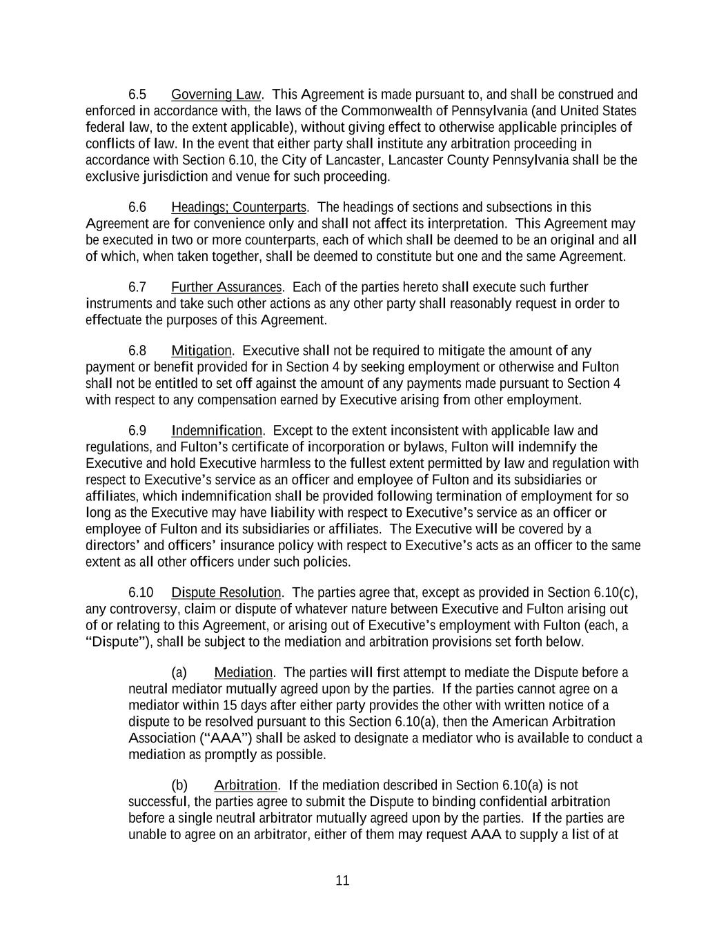 11 6.5 Governing Law. This Agreement is made pursuant to, and shall be construed and enforced in accordance with, the laws of the Commonwealth of Pennsylvania (and United States federal law, to the extent applicable), without giving effect to otherwise applicable principles of conflicts of law. In the event that either party shall institute any arbitration proceeding in accordance with Section 6.10, the City of Lancaster, Lancaster County Pennsylvania shall be the exclusive jurisdiction and venue for such proceeding. 6.6 Headings; Counterparts. The headings of sections and subsections in this Agreement are for convenience only and shall not affect its interpretation. This Agreement may be executed in two or more counterparts, each of which shall be deemed to be an original and all of which, when taken together, shall be deemed to constitute but one and the same Agreement. 6.7 Further Assurances. Each of the parties hereto shall execute such further instruments and take such other actions as any other party shall reasonably request in order to effectuate the purposes of this Agreement. 6.8 Mitigation. Executive shall not be required to mitigate the amount of any payment or benefit provided for in Section 4 by seeking employment or otherwise and Fulton shall not be entitled to set off against the amount of any payments made pursuant to Section 4 with respect to any compensation earned by Executive arising from other employment. 6.9 Indemnification. Except to the extent inconsistent with applicable law and regulations, and Fulton’s certificate of incorporation or bylaws, Fulton will indemnify the Executive and hold Executive harmless to the fullest extent permitted by law and regulation with respect to Executive’s service as an officer and employee of Fulton and its subsidiaries or affiliates, which indemnification shall be provided following termination of employment for so long as the Executive may have liability with respect to Executive’s service as an officer or employee of Fulton and its subsidiaries or affiliates. The Executive will be covered by a directors’ and officers’ insurance policy with respect to Executive’s acts as an officer to the same extent as all other officers under such policies. 6.10 Dispute Resolution. The parties agree that, except as provided in Section 6.10(c), any controversy, claim or dispute of whatever nature between Executive and Fulton arising out of or relating to this Agreement, or arising out of Executive’s employment with Fulton (each, a “Dispute”), shall be subject to the mediation and arbitration provisions set forth below. (a) Mediation. The parties will first attempt to mediate the Dispute before a neutral mediator mutually agreed upon by the parties. If the parties cannot agree on a mediator within 15 days after either party provides the other with written notice of a dispute to be resolved pursuant to this Section 6.10(a), then the American Arbitration Association (“AAA”) shall be asked to designate a mediator who is available to conduct a mediation as promptly as possible. (b) Arbitration. If the mediation described in Section 6.10(a) is not successful, the parties agree to submit the Dispute to binding confidential arbitration before a single neutral arbitrator mutually agreed upon by the parties. If the parties are unable to agree on an arbitrator, either of them may request AAA to supply a list of at