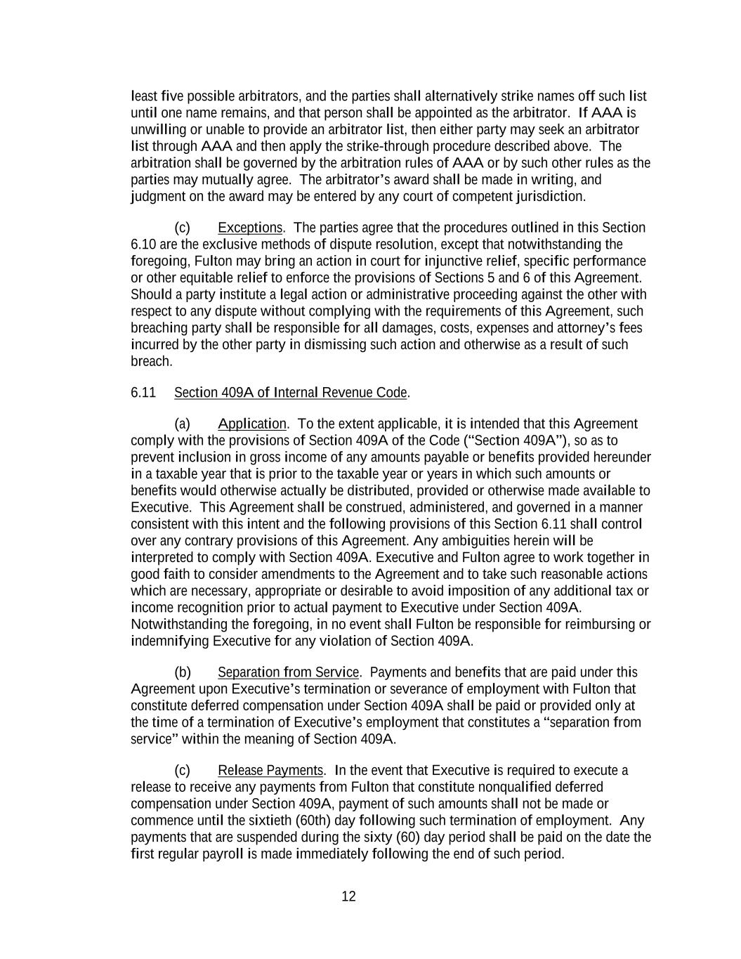 12 least five possible arbitrators, and the parties shall alternatively strike names off such list until one name remains, and that person shall be appointed as the arbitrator. If AAA is unwilling or unable to provide an arbitrator list, then either party may seek an arbitrator list through AAA and then apply the strike-through procedure described above. The arbitration shall be governed by the arbitration rules of AAA or by such other rules as the parties may mutually agree. The arbitrator’s award shall be made in writing, and judgment on the award may be entered by any court of competent jurisdiction. (c) Exceptions. The parties agree that the procedures outlined in this Section 6.10 are the exclusive methods of dispute resolution, except that notwithstanding the foregoing, Fulton may bring an action in court for injunctive relief, specific performance or other equitable relief to enforce the provisions of Sections 5 and 6 of this Agreement. Should a party institute a legal action or administrative proceeding against the other with respect to any dispute without complying with the requirements of this Agreement, such breaching party shall be responsible for all damages, costs, expenses and attorney’s fees incurred by the other party in dismissing such action and otherwise as a result of such breach. 6.11 Section 409A of Internal Revenue Code. (a) Application. To the extent applicable, it is intended that this Agreement comply with the provisions of Section 409A of the Code (“Section 409A”), so as to prevent inclusion in gross income of any amounts payable or benefits provided hereunder in a taxable year that is prior to the taxable year or years in which such amounts or benefits would otherwise actually be distributed, provided or otherwise made available to Executive. This Agreement shall be construed, administered, and governed in a manner consistent with this intent and the following provisions of this Section 6.11 shall control over any contrary provisions of this Agreement. Any ambiguities herein will be interpreted to comply with Section 409A. Executive and Fulton agree to work together in good faith to consider amendments to the Agreement and to take such reasonable actions which are necessary, appropriate or desirable to avoid imposition of any additional tax or income recognition prior to actual payment to Executive under Section 409A. Notwithstanding the foregoing, in no event shall Fulton be responsible for reimbursing or indemnifying Executive for any violation of Section 409A. (b) Separation from Service. Payments and benefits that are paid under this Agreement upon Executive’s termination or severance of employment with Fulton that constitute deferred compensation under Section 409A shall be paid or provided only at the time of a termination of Executive’s employment that constitutes a “separation from service” within the meaning of Section 409A. (c) Release Payments. In the event that Executive is required to execute a release to receive any payments from Fulton that constitute nonqualified deferred compensation under Section 409A, payment of such amounts shall not be made or commence until the sixtieth (60th) day following such termination of employment. Any payments that are suspended during the sixty (60) day period shall be paid on the date the first regular payroll is made immediately following the end of such period.