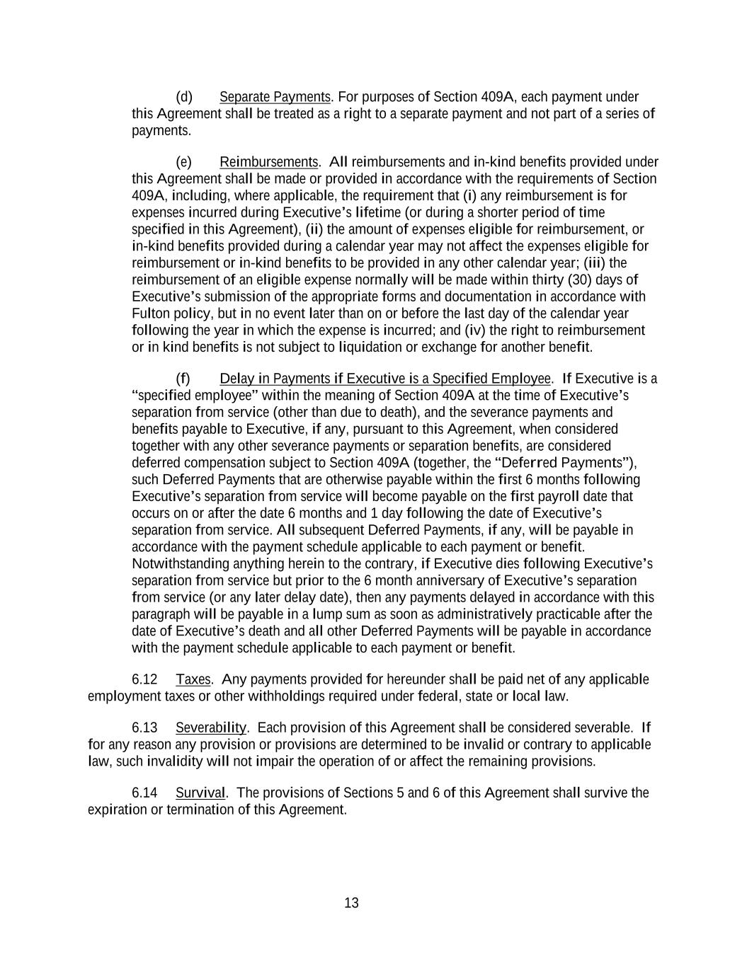 13 (d) Separate Payments. For purposes of Section 409A, each payment under this Agreement shall be treated as a right to a separate payment and not part of a series of payments. (e) Reimbursements. All reimbursements and in-kind benefits provided under this Agreement shall be made or provided in accordance with the requirements of Section 409A, including, where applicable, the requirement that (i) any reimbursement is for expenses incurred during Executive’s lifetime (or during a shorter period of time specified in this Agreement), (ii) the amount of expenses eligible for reimbursement, or in-kind benefits provided during a calendar year may not affect the expenses eligible for reimbursement or in-kind benefits to be provided in any other calendar year; (iii) the reimbursement of an eligible expense normally will be made within thirty (30) days of Executive’s submission of the appropriate forms and documentation in accordance with Fulton policy, but in no event later than on or before the last day of the calendar year following the year in which the expense is incurred; and (iv) the right to reimbursement or in kind benefits is not subject to liquidation or exchange for another benefit. (f) Delay in Payments if Executive is a Specified Employee. If Executive is a “specified employee” within the meaning of Section 409A at the time of Executive’s separation from service (other than due to death), and the severance payments and benefits payable to Executive, if any, pursuant to this Agreement, when considered together with any other severance payments or separation benefits, are considered deferred compensation subject to Section 409A (together, the “Deferred Payments”), such Deferred Payments that are otherwise payable within the first 6 months following Executive’s separation from service will become payable on the first payroll date that occurs on or after the date 6 months and 1 day following the date of Executive’s separation from service. All subsequent Deferred Payments, if any, will be payable in accordance with the payment schedule applicable to each payment or benefit. Notwithstanding anything herein to the contrary, if Executive dies following Executive’s separation from service but prior to the 6 month anniversary of Executive’s separation from service (or any later delay date), then any payments delayed in accordance with this paragraph will be payable in a lump sum as soon as administratively practicable after the date of Executive’s death and all other Deferred Payments will be payable in accordance with the payment schedule applicable to each payment or benefit. 6.12 Taxes. Any payments provided for hereunder shall be paid net of any applicable employment taxes or other withholdings required under federal, state or local law. 6.13 Severability. Each provision of this Agreement shall be considered severable. If for any reason any provision or provisions are determined to be invalid or contrary to applicable law, such invalidity will not impair the operation of or affect the remaining provisions. 6.14 Survival. The provisions of Sections 5 and 6 of this Agreement shall survive the expiration or termination of this Agreement.
