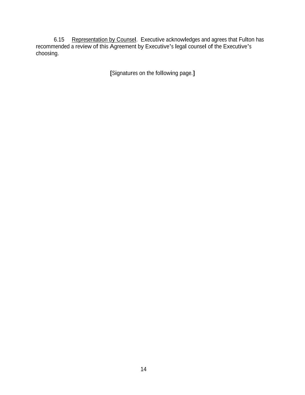 14 6.15 Representation by Counsel. Executive acknowledges and agrees that Fulton has recommended a review of this Agreement by Executive’s legal counsel of the Executive’s choosing. [Signatures on the following page.]