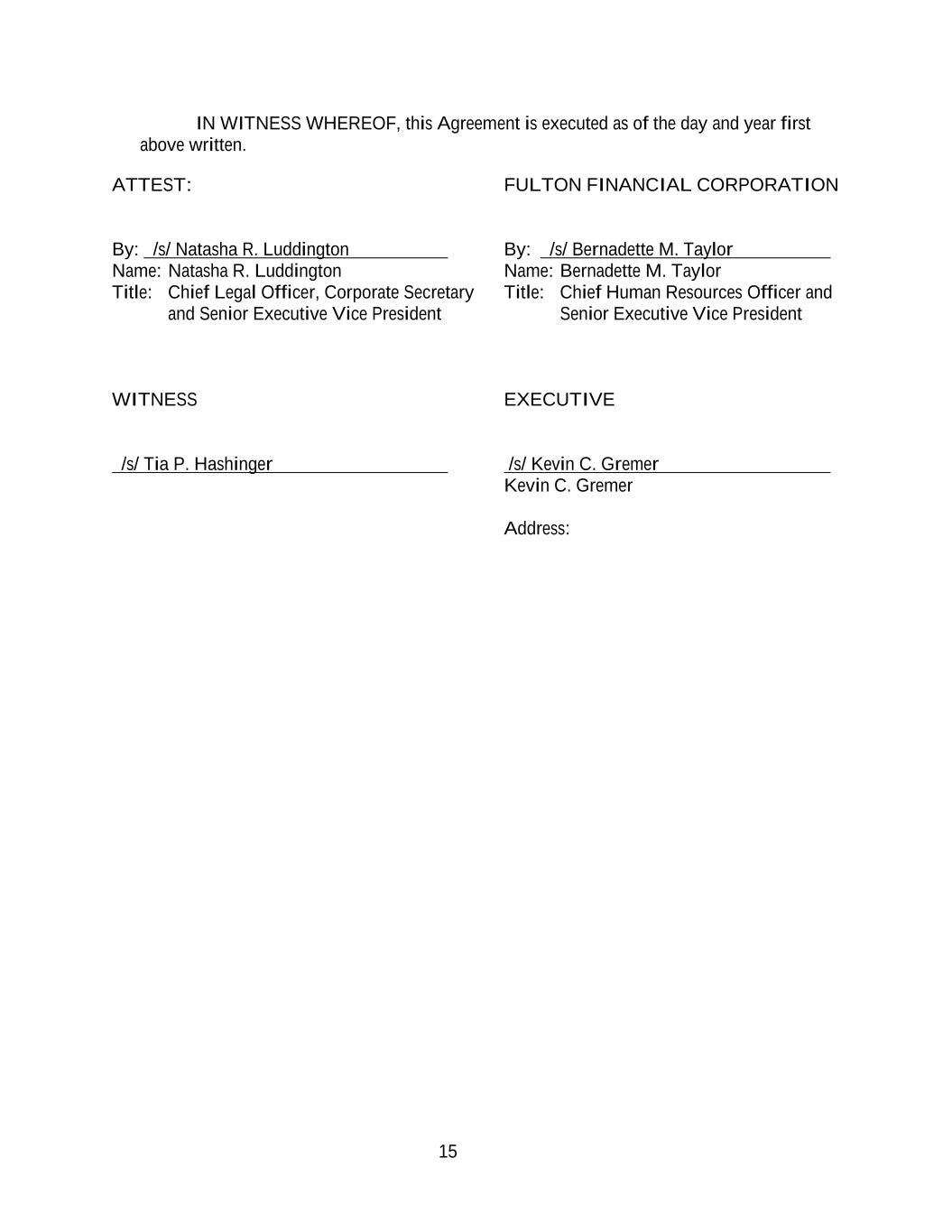 15 IN WITNESS WHEREOF, this Agreement is executed as of the day and year first above written. ATTEST: FULTON FINANCIAL CORPORATION By: /s/ Natasha R. Luddington By: /s/ Bernadette M. Taylor Name: Natasha R. Luddington Name: Bernadette M. Taylor Title: Chief Legal Officer, Corporate Secretary Title: Chief Human Resources Officer and and Senior Executive Vice President Senior Executive Vice President WITNESS EXECUTIVE /s/ Tia P. Hashinger /s/ Kevin C. Gremer Kevin C. Gremer Address: