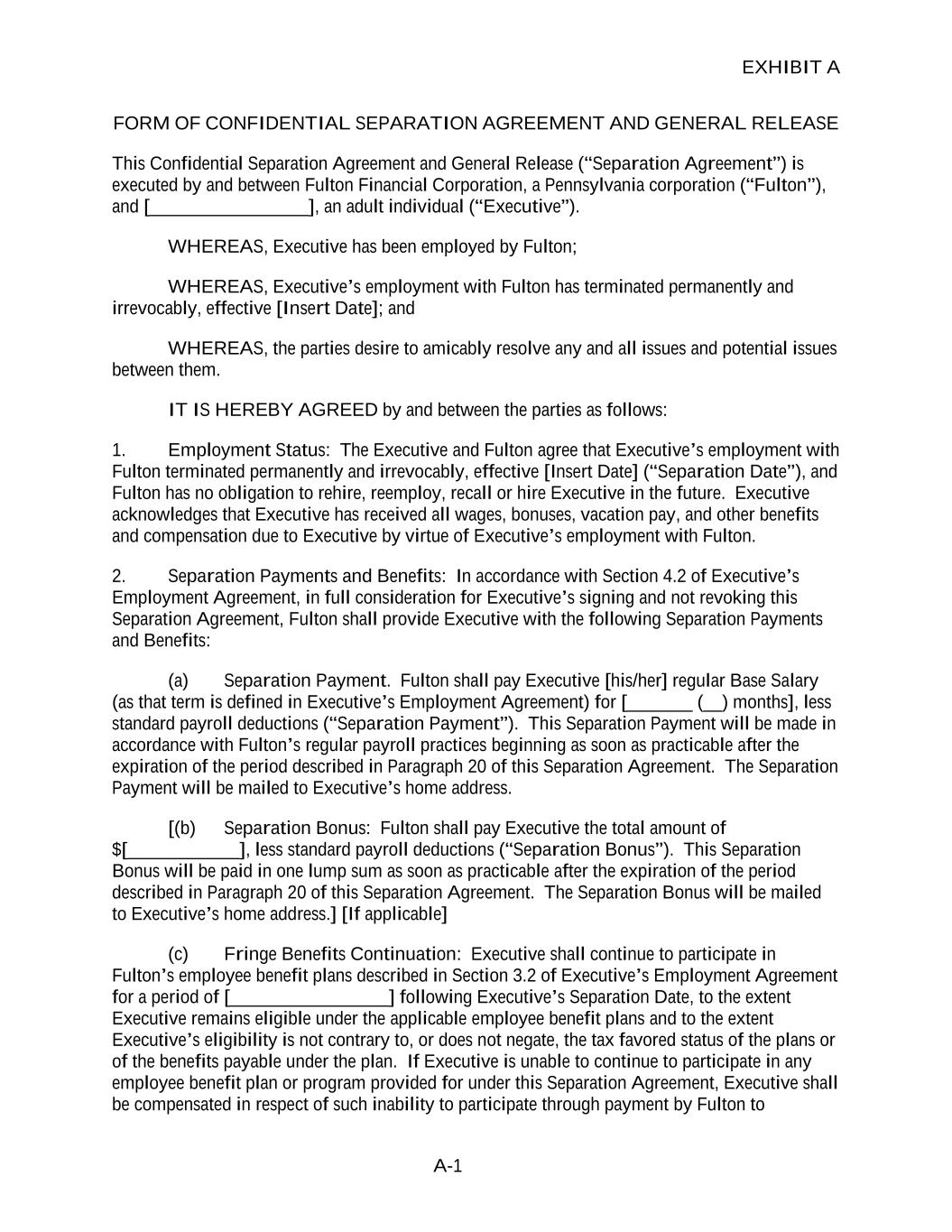 EXHIBIT A A-1 FORM OF CONFIDENTIAL SEPARATION AGREEMENT AND GENERAL RELEASE This Confidential Separation Agreement and General Release (“Separation Agreement”) is executed by and between Fulton Financial Corporation, a Pennsylvania corporation (“Fulton”), and [_________________], an adult individual (“Executive”). WHEREAS, Executive has been employed by Fulton; WHEREAS, Executive’s employment with Fulton has terminated permanently and irrevocably, effective [Insert Date]; and WHEREAS, the parties desire to amicably resolve any and all issues and potential issues between them. IT IS HEREBY AGREED by and between the parties as follows: 1. Employment Status: The Executive and Fulton agree that Executive’s employment with Fulton terminated permanently and irrevocably, effective [Insert Date] (“Separation Date”), and Fulton has no obligation to rehire, reemploy, recall or hire Executive in the future. Executive acknowledges that Executive has received all wages, bonuses, vacation pay, and other benefits and compensation due to Executive by virtue of Executive’s employment with Fulton. 2. Separation Payments and Benefits: In accordance with Section 4.2 of Executive’s Employment Agreement, in full consideration for Executive’s signing and not revoking this Separation Agreement, Fulton shall provide Executive with the following Separation Payments and Benefits: (a) Separation Payment. Fulton shall pay Executive [his/her] regular Base Salary (as that term is defined in Executive’s Employment Agreement) for [_______ (__) months], less standard payroll deductions (“Separation Payment”). This Separation Payment will be made in accordance with Fulton’s regular payroll practices beginning as soon as practicable after the expiration of the period described in Paragraph 20 of this Separation Agreement. The Separation Payment will be mailed to Executive’s home address. [(b) Separation Bonus: Fulton shall pay Executive the total amount of $[____________], less standard payroll deductions (“Separation Bonus”). This Separation Bonus will be paid in one lump sum as soon as practicable after the expiration of the period described in Paragraph 20 of this Separation Agreement. The Separation Bonus will be mailed to Executive’s home address.] [If applicable] (c) Fringe Benefits Continuation: Executive shall continue to participate in Fulton’s employee benefit plans described in Section 3.2 of Executive’s Employment Agreement for a period of [_________________] following Executive’s Separation Date, to the extent Executive remains eligible under the applicable employee benefit plans and to the extent Executive’s eligibility is not contrary to, or does not negate, the tax favored status of the plans or of the benefits payable under the plan. If Executive is unable to continue to participate in any employee benefit plan or program provided for under this Separation Agreement, Executive shall be compensated in respect of such inability to participate through payment by Fulton to