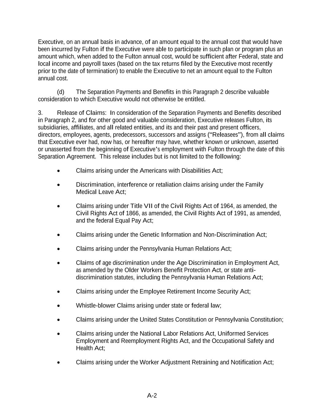 A-2 Executive, on an annual basis in advance, of an amount equal to the annual cost that would have been incurred by Fulton if the Executive were able to participate in such plan or program plus an amount which, when added to the Fulton annual cost, would be sufficient after Federal, state and local income and payroll taxes (based on the tax returns filed by the Executive most recently prior to the date of termination) to enable the Executive to net an amount equal to the Fulton annual cost. (d) The Separation Payments and Benefits in this Paragraph 2 describe valuable consideration to which Executive would not otherwise be entitled. 3. Release of Claims: In consideration of the Separation Payments and Benefits described in Paragraph 2, and for other good and valuable consideration, Executive releases Fulton, its subsidiaries, affiliates, and all related entities, and its and their past and present officers, directors, employees, agents, predecessors, successors and assigns (“Releasees”), from all claims that Executive ever had, now has, or hereafter may have, whether known or unknown, asserted or unasserted from the beginning of Executive’s employment with Fulton through the date of this Separation Agreement. This release includes but is not limited to the following: Claims arising under the Americans with Disabilities Act; Discrimination, interference or retaliation claims arising under the Family Medical Leave Act; Claims arising under Title VII of the Civil Rights Act of 1964, as amended, the Civil Rights Act of 1866, as amended, the Civil Rights Act of 1991, as amended, and the federal Equal Pay Act; Claims arising under the Genetic Information and Non-Discrimination Act; Claims arising under the Pennsylvania Human Relations Act; Claims of age discrimination under the Age Discrimination in Employment Act, as amended by the Older Workers Benefit Protection Act, or state anti- discrimination statutes, including the Pennsylvania Human Relations Act; Claims arising under the Employee Retirement Income Security Act; Whistle-blower Claims arising under state or federal law; Claims arising under the United States Constitution or Pennsylvania Constitution; Claims arising under the National Labor Relations Act, Uniformed Services Employment and Reemployment Rights Act, and the Occupational Safety and Health Act; Claims arising under the Worker Adjustment Retraining and Notification Act;