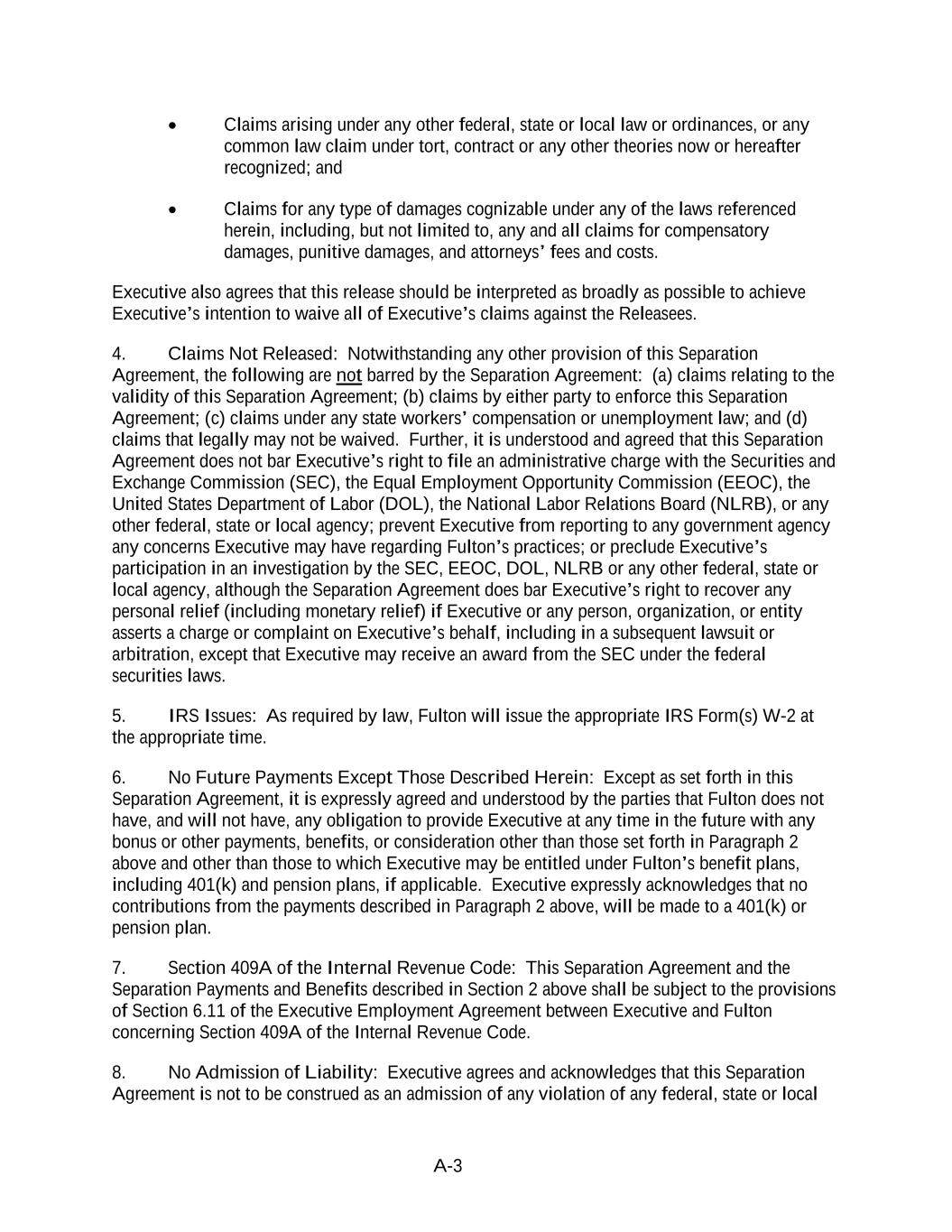 A-3 Claims arising under any other federal, state or local law or ordinances, or any common law claim under tort, contract or any other theories now or hereafter recognized; and Claims for any type of damages cognizable under any of the laws referenced herein, including, but not limited to, any and all claims for compensatory damages, punitive damages, and attorneys’ fees and costs. Executive also agrees that this release should be interpreted as broadly as possible to achieve Executive’s intention to waive all of Executive’s claims against the Releasees. 4. Claims Not Released: Notwithstanding any other provision of this Separation Agreement, the following are not barred by the Separation Agreement: (a) claims relating to the validity of this Separation Agreement; (b) claims by either party to enforce this Separation Agreement; (c) claims under any state workers’ compensation or unemployment law; and (d) claims that legally may not be waived. Further, it is understood and agreed that this Separation Agreement does not bar Executive’s right to file an administrative charge with the Securities and Exchange Commission (SEC), the Equal Employment Opportunity Commission (EEOC), the United States Department of Labor (DOL), the National Labor Relations Board (NLRB), or any other federal, state or local agency; prevent Executive from reporting to any government agency any concerns Executive may have regarding Fulton’s practices; or preclude Executive’s participation in an investigation by the SEC, EEOC, DOL, NLRB or any other federal, state or local agency, although the Separation Agreement does bar Executive’s right to recover any personal relief (including monetary relief) if Executive or any person, organization, or entity asserts a charge or complaint on Executive’s behalf, including in a subsequent lawsuit or arbitration, except that Executive may receive an award from the SEC under the federal securities laws. 5. IRS Issues: As required by law, Fulton will issue the appropriate IRS Form(s) W-2 at the appropriate time. 6. No Future Payments Except Those Described Herein: Except as set forth in this Separation Agreement, it is expressly agreed and understood by the parties that Fulton does not have, and will not have, any obligation to provide Executive at any time in the future with any bonus or other payments, benefits, or consideration other than those set forth in Paragraph 2 above and other than those to which Executive may be entitled under Fulton’s benefit plans, including 401(k) and pension plans, if applicable. Executive expressly acknowledges that no contributions from the payments described in Paragraph 2 above, will be made to a 401(k) or pension plan. 7. Section 409A of the Internal Revenue Code: This Separation Agreement and the Separation Payments and Benefits described in Section 2 above shall be subject to the provisions of Section 6.11 of the Executive Employment Agreement between Executive and Fulton concerning Section 409A of the Internal Revenue Code. 8. No Admission of Liability: Executive agrees and acknowledges that this Separation Agreement is not to be construed as an admission of any violation of any federal, state or local
