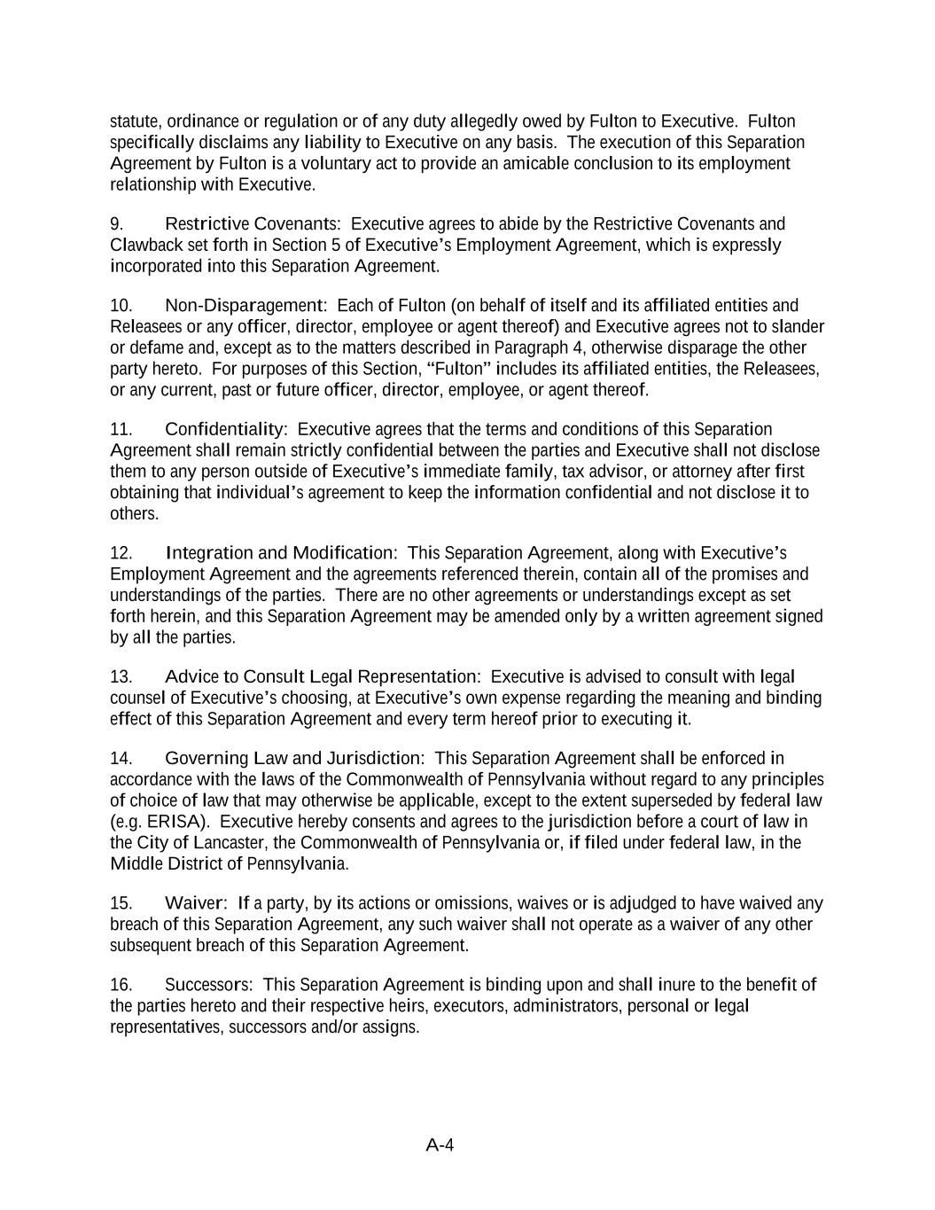 A-4 statute, ordinance or regulation or of any duty allegedly owed by Fulton to Executive. Fulton specifically disclaims any liability to Executive on any basis. The execution of this Separation Agreement by Fulton is a voluntary act to provide an amicable conclusion to its employment relationship with Executive. 9. Restrictive Covenants: Executive agrees to abide by the Restrictive Covenants and Clawback set forth in Section 5 of Executive’s Employment Agreement, which is expressly incorporated into this Separation Agreement. 10. Non-Disparagement: Each of Fulton (on behalf of itself and its affiliated entities and Releasees or any officer, director, employee or agent thereof) and Executive agrees not to slander or defame and, except as to the matters described in Paragraph 4, otherwise disparage the other party hereto. For purposes of this Section, “Fulton” includes its affiliated entities, the Releasees, or any current, past or future officer, director, employee, or agent thereof. 11. Confidentiality: Executive agrees that the terms and conditions of this Separation Agreement shall remain strictly confidential between the parties and Executive shall not disclose them to any person outside of Executive’s immediate family, tax advisor, or attorney after first obtaining that individual’s agreement to keep the information confidential and not disclose it to others. 12. Integration and Modification: This Separation Agreement, along with Executive’s Employment Agreement and the agreements referenced therein, contain all of the promises and understandings of the parties. There are no other agreements or understandings except as set forth herein, and this Separation Agreement may be amended only by a written agreement signed by all the parties. 13. Advice to Consult Legal Representation: Executive is advised to consult with legal counsel of Executive’s choosing, at Executive’s own expense regarding the meaning and binding effect of this Separation Agreement and every term hereof prior to executing it. 14. Governing Law and Jurisdiction: This Separation Agreement shall be enforced in accordance with the laws of the Commonwealth of Pennsylvania without regard to any principles of choice of law that may otherwise be applicable, except to the extent superseded by federal law (e.g. ERISA). Executive hereby consents and agrees to the jurisdiction before a court of law in the City of Lancaster, the Commonwealth of Pennsylvania or, if filed under federal law, in the Middle District of Pennsylvania. 15. Waiver: If a party, by its actions or omissions, waives or is adjudged to have waived any breach of this Separation Agreement, any such waiver shall not operate as a waiver of any other subsequent breach of this Separation Agreement. 16. Successors: This Separation Agreement is binding upon and shall inure to the benefit of the parties hereto and their respective heirs, executors, administrators, personal or legal representatives, successors and/or assigns.