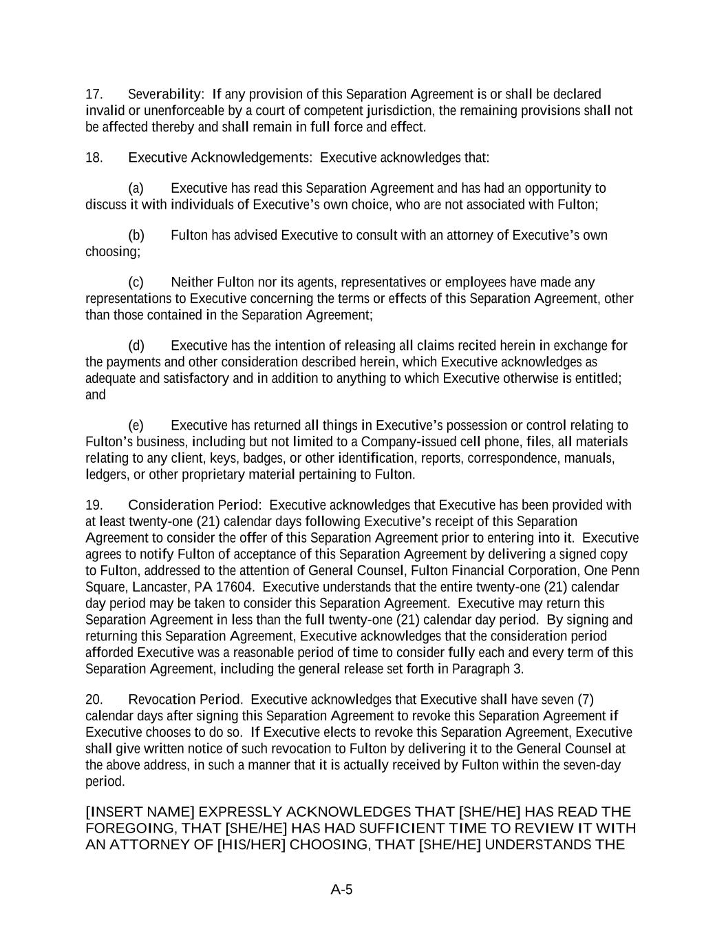 A-5 17. Severability: If any provision of this Separation Agreement is or shall be declared invalid or unenforceable by a court of competent jurisdiction, the remaining provisions shall not be affected thereby and shall remain in full force and effect. 18. Executive Acknowledgements: Executive acknowledges that: (a) Executive has read this Separation Agreement and has had an opportunity to discuss it with individuals of Executive’s own choice, who are not associated with Fulton; (b) Fulton has advised Executive to consult with an attorney of Executive’s own choosing; (c) Neither Fulton nor its agents, representatives or employees have made any representations to Executive concerning the terms or effects of this Separation Agreement, other than those contained in the Separation Agreement; (d) Executive has the intention of releasing all claims recited herein in exchange for the payments and other consideration described herein, which Executive acknowledges as adequate and satisfactory and in addition to anything to which Executive otherwise is entitled; and (e) Executive has returned all things in Executive’s possession or control relating to Fulton’s business, including but not limited to a Company-issued cell phone, files, all materials relating to any client, keys, badges, or other identification, reports, correspondence, manuals, ledgers, or other proprietary material pertaining to Fulton. 19. Consideration Period: Executive acknowledges that Executive has been provided with at least twenty-one (21) calendar days following Executive’s receipt of this Separation Agreement to consider the offer of this Separation Agreement prior to entering into it. Executive agrees to notify Fulton of acceptance of this Separation Agreement by delivering a signed copy to Fulton, addressed to the attention of General Counsel, Fulton Financial Corporation, One Penn Square, Lancaster, PA 17604. Executive understands that the entire twenty-one (21) calendar day period may be taken to consider this Separation Agreement. Executive may return this Separation Agreement in less than the full twenty-one (21) calendar day period. By signing and returning this Separation Agreement, Executive acknowledges that the consideration period afforded Executive was a reasonable period of time to consider fully each and every term of this Separation Agreement, including the general release set forth in Paragraph 3. 20. Revocation Period. Executive acknowledges that Executive shall have seven (7) calendar days after signing this Separation Agreement to revoke this Separation Agreement if Executive chooses to do so. If Executive elects to revoke this Separation Agreement, Executive shall give written notice of such revocation to Fulton by delivering it to the General Counsel at the above address, in such a manner that it is actually received by Fulton within the seven-day period. [INSERT NAME] EXPRESSLY ACKNOWLEDGES THAT [SHE/HE] HAS READ THE FOREGOING, THAT [SHE/HE] HAS HAD SUFFICIENT TIME TO REVIEW IT WITH AN ATTORNEY OF [HIS/HER] CHOOSING, THAT [SHE/HE] UNDERSTANDS THE