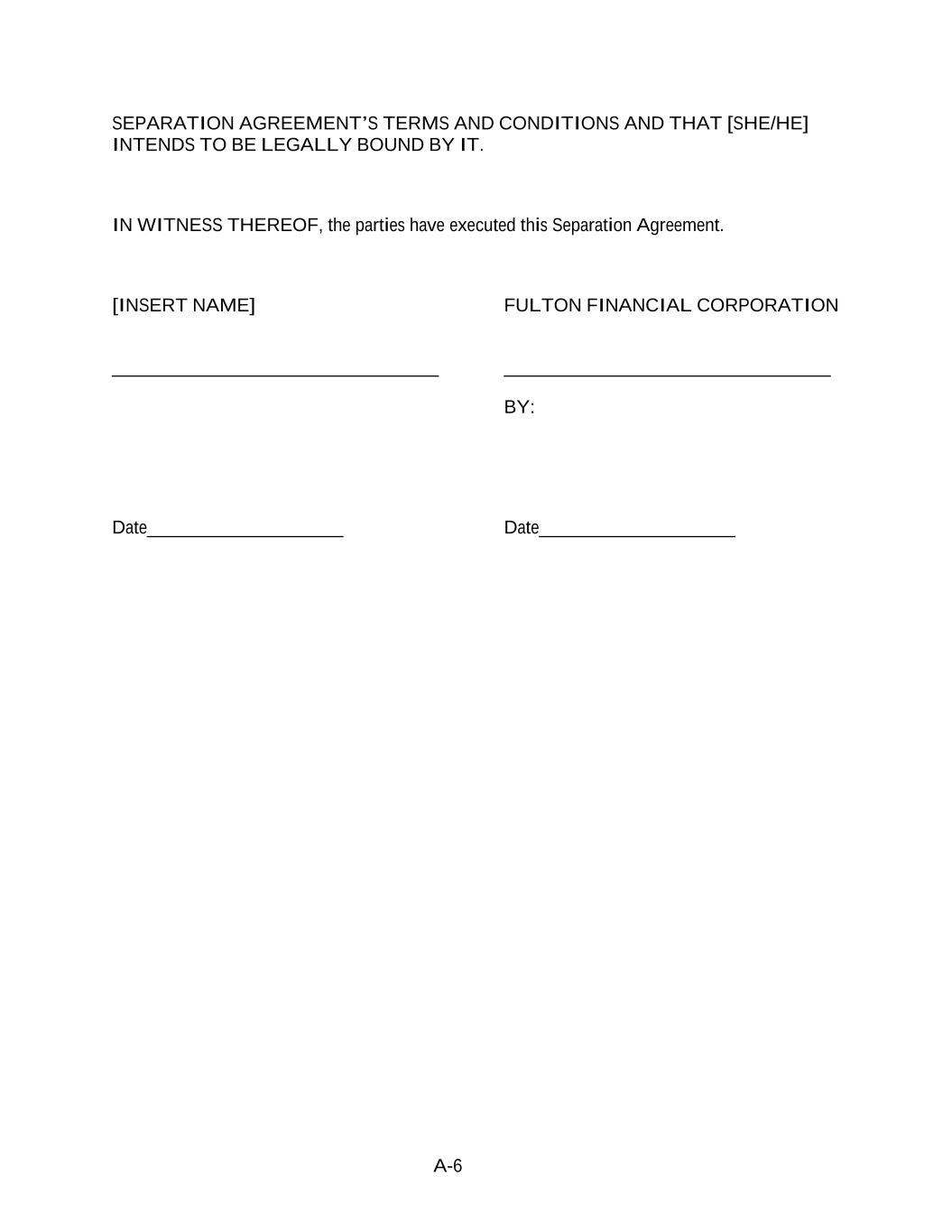 A-6 SEPARATION AGREEMENT’S TERMS AND CONDITIONS AND THAT [SHE/HE] INTENDS TO BE LEGALLY BOUND BY IT. IN WITNESS THEREOF, the parties have executed this Separation Agreement. [INSERT NAME] FULTON FINANCIAL CORPORATION ___________________________________ ___________________________________ BY: Date_____________________ Date_____________________