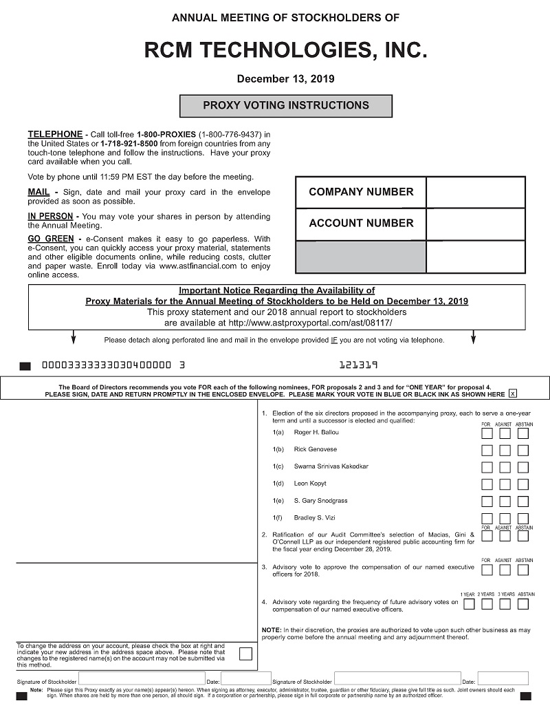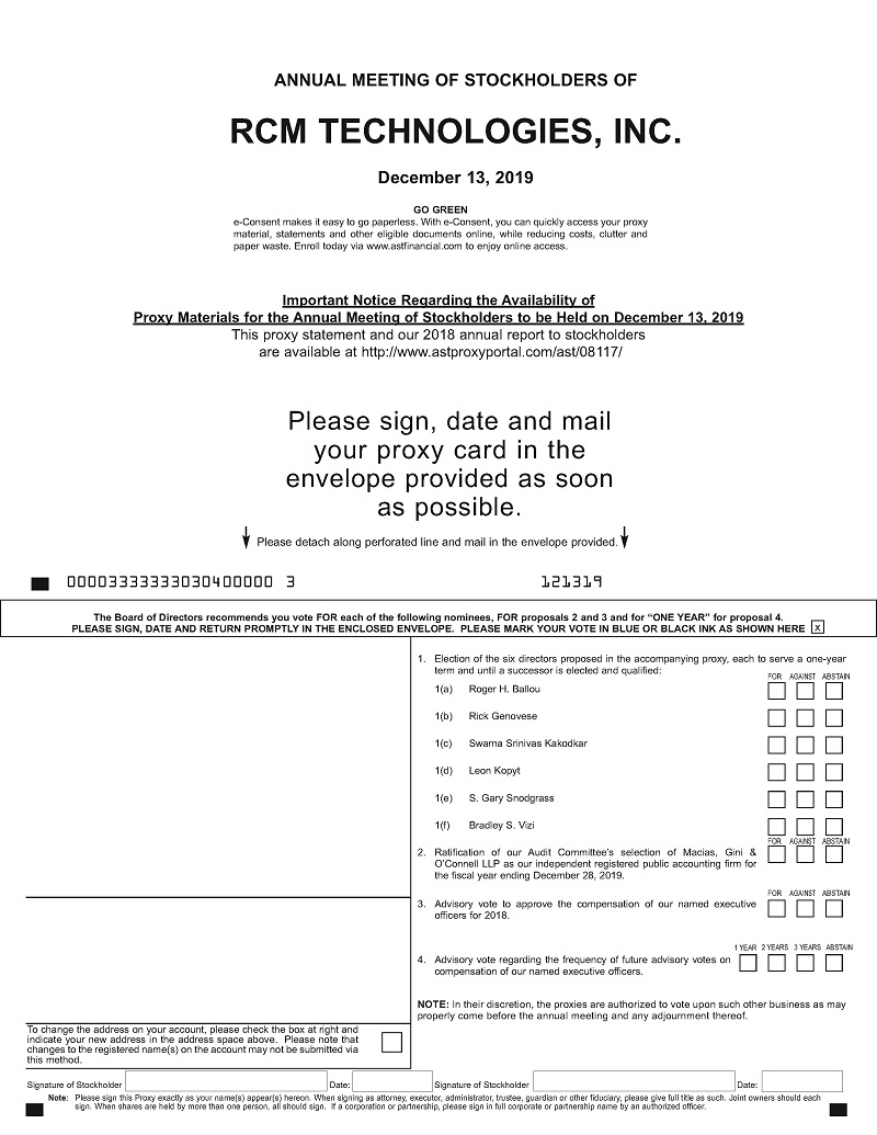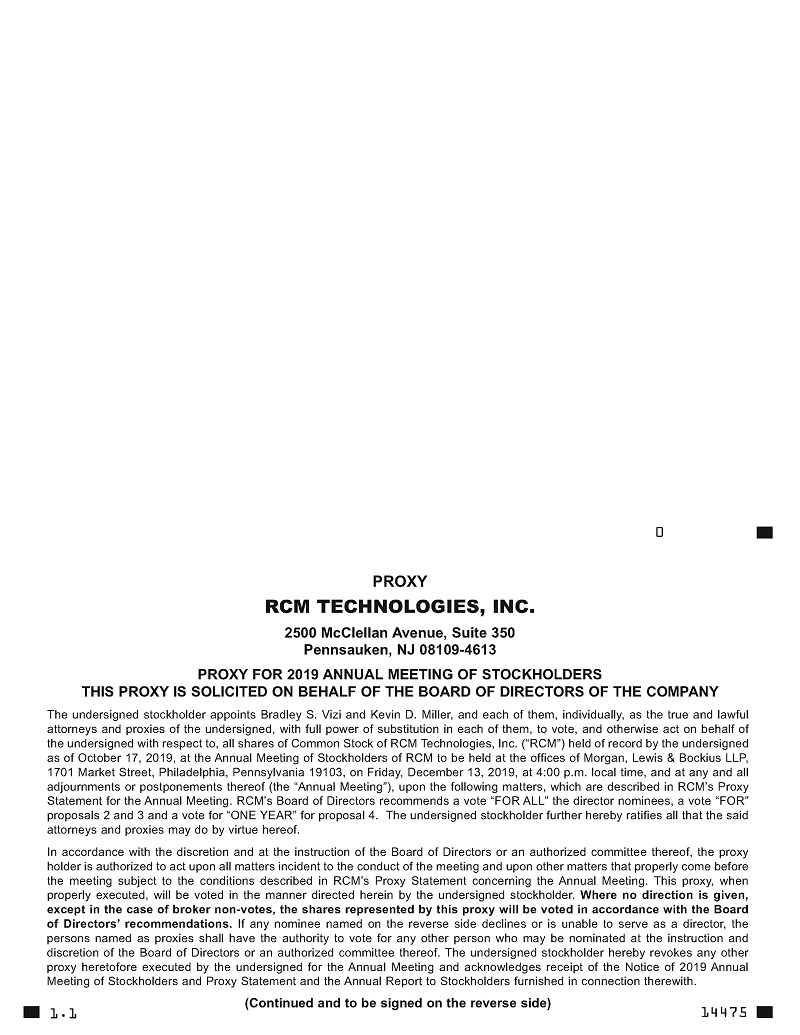 The RCM Technologies, Inc. 2019 Annual Meeting of Stockholders will be held at the offices of Morgan, Lewis & Bockius LLP, 1701 Market Street, Philadelphia, Pennsylvania 19103, on Friday, December 13, 2019, at 4:00 p.m. local time.