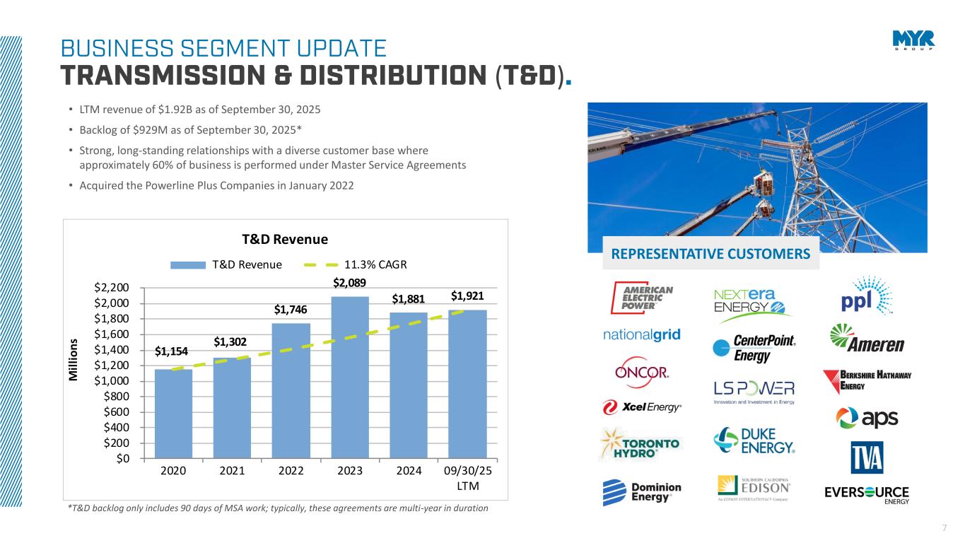3 65+ OFFICE LOCATIONS MYR Group Inc. is a holding company of subsidiaries that has delivered some of the largest and most notable electrical infrastructure and commercial and industrial projects throughout the United States and Canada, since 1891. MYR GROUP INC. - A MARKET LEADER IN ELECTRICAL CONSTRUCTION. CONTINUED GROWTH Strong presence in key markets with healthy organic and acquisitive growth SUPERIOR SAFETY CULTURE Performance that exceeds industry standards; 2024 stats: TCIR – 0.78 LTIR - 0.10 STRONG FINANCIALS Strong balance sheet to support future growth and projects of any magnitude with proven execution of corporate strategy EXTENSIVE RESOURCES & EXPERTISE Dedicated workforce of 8,500+ employees, centralized operations for greater efficiency and cross-collaboration and one of the largest centralized, specialized fleets in the industry LONG-STANDING CUSTOMERS Established client relationships and alliance partnerships across the U.S. and Canada (some held for 50+ years), and more than 90% return clients in both segments ESSENTIAL CLEAN ENERGY CONTRACTOR Superior electrical services that support the clean energy transformation and growing electricity demand EXPERIENCED LEADERSHIP Executive team that averages more than 30 years of industry experience Reportable Segments: T&D and C&I HEALTHCARE TRANSPORTATION WATER/WASTEWATER DATA CENTERS CLEAN ENERGY WAREHOUSING COMMERCIAL & INDUSTRIAL (C&I) TRANSMISSION DISTRIBUTION SUBSTATION STREET LIGHTING STORM RESTORATION STORAGE & SOLAR TRANSMISSION & DISTRIBUTION (T&D) INVESTMENT HIGHLIGHTS