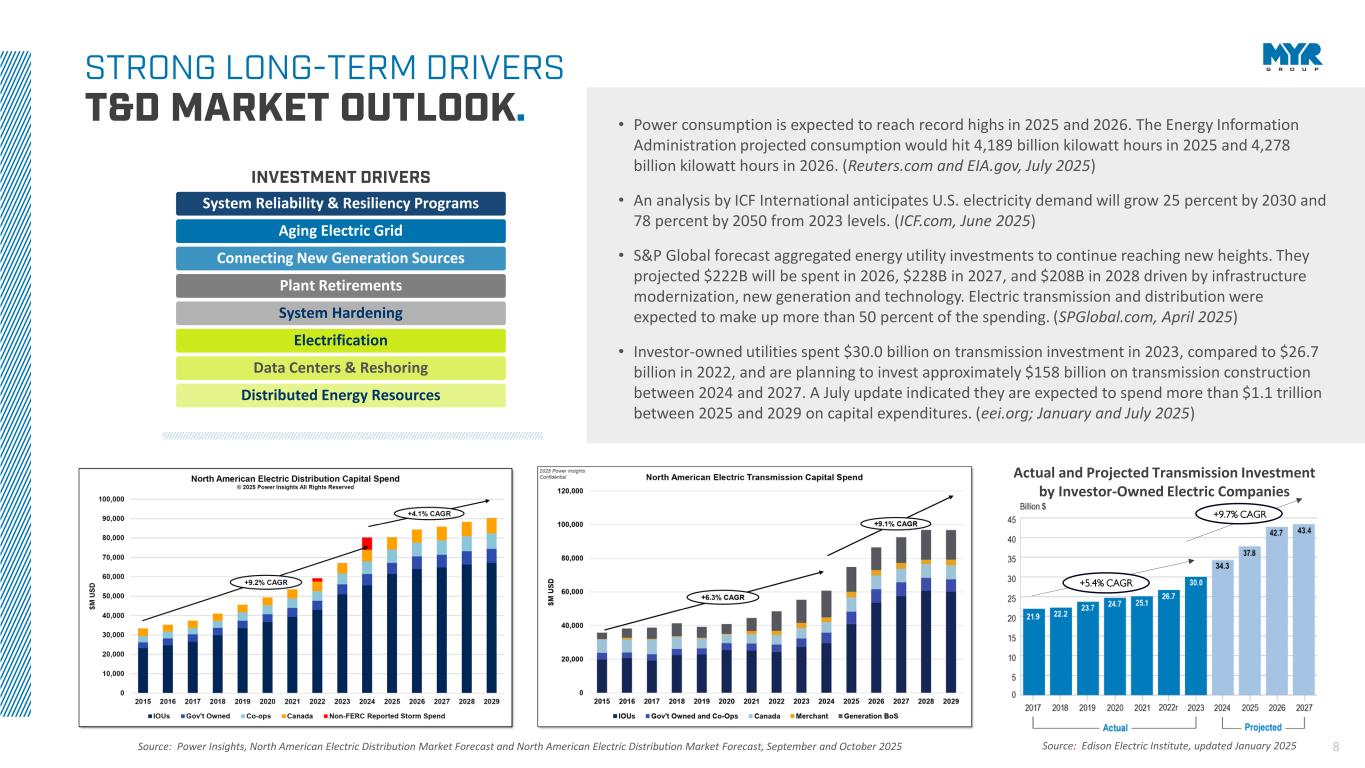 8Source: Power Insights, North American Electric Distribution Market Forecast and North American Electric Distribution Market Forecast, September and October 2025 STRONG LONG-TERM DRIVERS T&D MARKET OUTLOOK. Source: Edison Electric Institute, updated January 2025 Actual and Projected Transmission Investment by Investor-Owned Electric Companies • Power consumption is expected to reach record highs in 2025 and 2026. The Energy Information Administration projected consumption would hit 4,189 billion kilowatt hours in 2025 and 4,278 billion kilowatt hours in 2026. (Reuters.com and EIA.gov, July 2025) • An analysis by ICF International anticipates U.S. electricity demand will grow 25 percent by 2030 and 78 percent by 2050 from 2023 levels. (ICF.com, June 2025) • S&P Global forecast aggregated energy utility investments to continue reaching new heights. They projected $222B will be spent in 2026, $228B in 2027, and $208B in 2028 driven by infrastructure modernization, new generation and technology. Electric transmission and distribution were expected to make up more than 50 percent of the spending. (SPGlobal.com, April 2025) • Investor-owned utilities spent $30.0 billion on transmission investment in 2023, compared to $26.7 billion in 2022, and are planning to invest approximately $158 billion on transmission construction between 2024 and 2027. A July update indicated they are expected to spend more than $1.1 trillion between 2025 and 2029 on capital expenditures. (eei.org; January and July 2025) System Reliability & Resiliency Programs Aging Electric Grid Connecting New Generation Sources Plant Retirements System Hardening Electrification Data Centers & Reshoring Distributed Energy Resources INVESTMENT DRIVERS +5.4% CAGR +9.7% CAGR