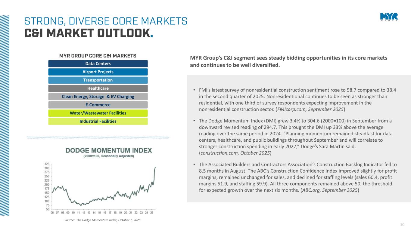 10 Data Centers Airport Projects Transportation Healthcare Clean Energy, Storage & EV Charging E-Commerce Water/Wastewater Facilities Industrial Facilities MYR GROUP CORE C&I MARKETS STRONG, DIVERSE CORE MARKETS C&I MARKET OUTLOOK. • FMI’s latest survey of nonresidential construction sentiment rose to 58.7 compared to 38.4 in the second quarter of 2025. Nonresidentional continues to be seen as stronger than residential, with one third of survey respondents expecting improvement in the nonresidential construction sector. (FMIcorp.com, September 2025) • The Dodge Momentum Index (DMI) grew 3.4% to 304.6 (2000=100) in September from a downward revised reading of 294.7. This brought the DMI up 33% above the average reading over the same period in 2024. “Planning momentum remained steadfast for data centers, healthcare, and public buildings throughout September and will correlate to stronger construction spending in early 2027,” Dodge’s Sara Martin said. (construction.com, October 2025) • The Associated Builders and Contractors Association’s Construction Backlog Indicator fell to 8.5 months in August. The ABC’s Construction Confidence Index improved slightly for profit margins, remained unchanged for sales, and declined for staffing levels (sales 60.4, profit margins 51.9, and staffing 59.9). All three components remained above 50, the threshold for expected growth over the next six months. (ABC.org, September 2025) Source: The Dodge Momentum Index, October 7, 2025 MYR Group’s C&I segment sees steady bidding opportunities in its core markets and continues to be well diversified.