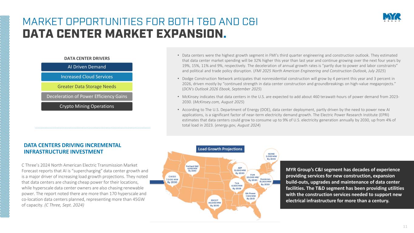 11 MARKET OPPORTUNITIES FOR BOTH T&D AND C&I DATA CENTER MARKET EXPANSION. AI Driven Demand Increased Cloud Services Greater Data Storage Needs Deceleration of Power Efficiency Gains Crypto Mining Operations DATA CENTER DRIVERS DATA CENTERS DRIVING INCREMENTAL INFRASTRUCTURE INVESTMENT • Data centers were the highest growth segment in FMI’s third quarter engineering and construction outlook. They estimated that data center market spending will be 32% higher this year than last year and continue growing over the next four years by 19%, 15%, 11% and 9%, respectively. The deceleration of annual growth rates is “partly due to power and labor constraints” and political and trade policy disruption. (FMI 2025 North American Engineering and Construction Outlook, July 2025) • Dodge Construction Network anticipates that nonresidential construction will grow by 4 percent this year and 3 percent in 2026, driven mostly by “continued strength in data center construction and groundbreakings on high-value megaprojects.” (DCN’s Outlook 2026 Ebook, September 2025) • McKinsey indicates that data centers in the U.S. are expected to add about 460 terawatt-hours of power demand from 2023- 2030. (McKinsey.com, August 2025) • According to The U.S. Department of Energy (DOE), data center deployment, partly driven by the need to power new AI applications, is a significant factor of near-term electricity demand growth. The Electric Power Research Institute (EPRI) estimates that data centers could grow to consume up to 9% of U.S. electricity generation annually by 2030, up from 4% of total load in 2023. (energy.gov, August 2024) MYR Group’s C&I segment has decades of experience providing services for new construction, expansion build-outs, upgrades and maintenance of data center facilities. The T&D segment has been providing utilities with the construction services needed to support new electrical infrastructure for more than a century. C Three’s 2024 North American Electric Transmission Market Forecast reports that AI is “supercharging” data center growth and is a major driver of increasing load growth projections. They noted that data centers are chasing cheap power for their locations, while hyperscale data center owners are also chasing renewable power. The report noted there are more than 170 hyperscale and co-location data centers planned, representing more than 45GW of capacity. (C Three, Sept. 2024)