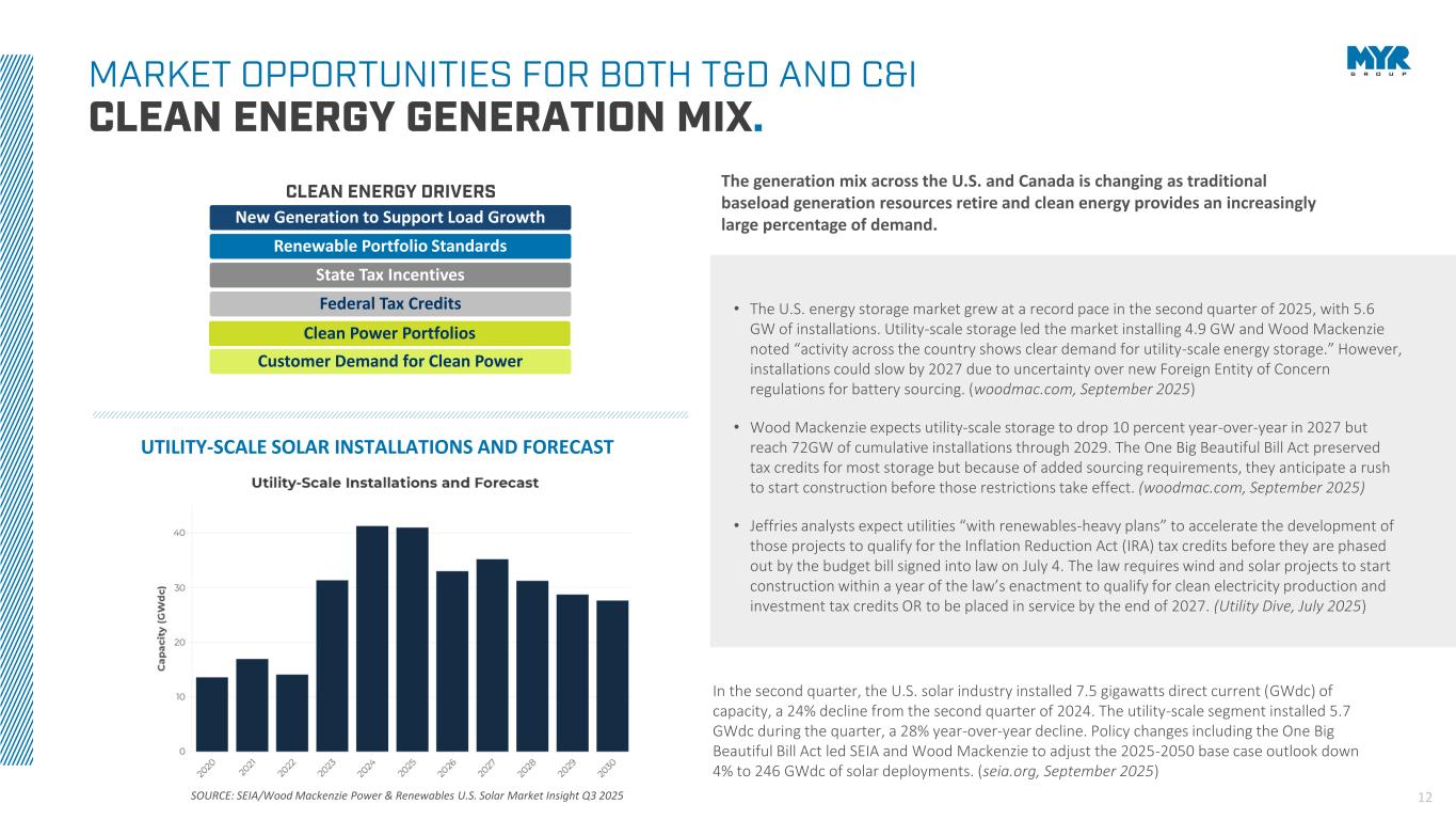 12 MARKET OPPORTUNITIES FOR BOTH T&D AND C&I CLEAN ENERGY GENERATION MIX. New Generation to Support Load Growth Renewable Portfolio Standards State Tax Incentives Federal Tax Credits Clean Power Portfolios Customer Demand for Clean Power CLEAN ENERGY DRIVERS UTILITY-SCALE SOLAR INSTALLATIONS AND FORECAST SOURCE: SEIA/Wood Mackenzie Power & Renewables U.S. Solar Market Insight Q3 2025 In the second quarter, the U.S. solar industry installed 7.5 gigawatts direct current (GWdc) of capacity, a 24% decline from the second quarter of 2024. The utility-scale segment installed 5.7 GWdc during the quarter, a 28% year-over-year decline. Policy changes including the One Big Beautiful Bill Act led SEIA and Wood Mackenzie to adjust the 2025-2050 base case outlook down 4% to 246 GWdc of solar deployments. (seia.org, September 2025) The generation mix across the U.S. and Canada is changing as traditional baseload generation resources retire and clean energy provides an increasingly large percentage of demand. • The U.S. energy storage market grew at a record pace in the second quarter of 2025, with 5.6 GW of installations. Utility-scale storage led the market installing 4.9 GW and Wood Mackenzie noted “activity across the country shows clear demand for utility-scale energy storage.” However, installations could slow by 2027 due to uncertainty over new Foreign Entity of Concern regulations for battery sourcing. (woodmac.com, September 2025) • Wood Mackenzie expects utility-scale storage to drop 10 percent year-over-year in 2027 but reach 72GW of cumulative installations through 2029. The One Big Beautiful Bill Act preserved tax credits for most storage but because of added sourcing requirements, they anticipate a rush to start construction before those restrictions take effect. (woodmac.com, September 2025) • Jeffries analysts expect utilities “with renewables-heavy plans” to accelerate the development of those projects to qualify for the Inflation Reduction Act (IRA) tax credits before they are phased out by the budget bill signed into law on July 4. The law requires wind and solar projects to start construction within a year of the law’s enactment to qualify for clean electricity production and investment tax credits OR to be placed in service by the end of 2027. (Utility Dive, July 2025)