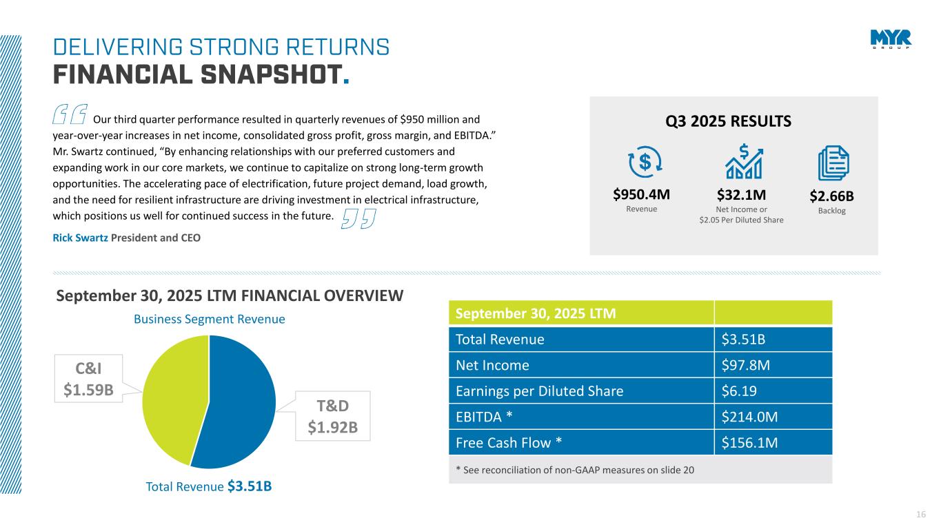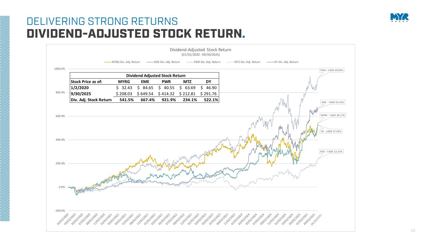 15 MYRG - CAGR 38.17% EME - CAGR 42.55% PWR - CAGR 49.83% MTZ - CAGR 23.35% DY - CAGR 37.44% -200.0% 0.0% 200.0% 400.0% 600.0% 800.0% 1000.0% Dividend-Adjusted Stock Return (01/02/2020 - 09/30/2025) MYRG Div.-Adj. Return EME Div.-Adj. Return PWR Div.-Adj. Return MTZ Div.-Adj. Return DY Div. Adj.-Return DELIVERING STRONG RETURNS DIVIDEND-ADJUSTED STOCK RETURN. Dividend Adjusted Stock Return Stock Price as of: MYRG EME PWR MTZ DY 1/2/2020 32.43$ 84.65$ 40.55$ 63.69$ 46.90$ 9/30/2025 208.03$ 649.54$ 414.32$ 212.81$ 291.76$ Div. Adj. Stock Return 541.5% 667.4% 921.9% 234.1% 522.1%