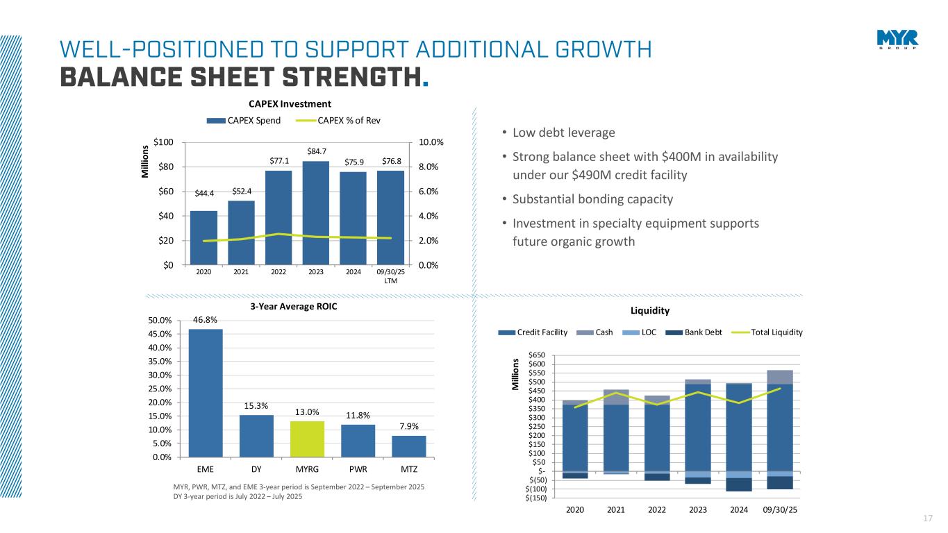 16 Q3 2025 RESULTS $32.1M Net Income or $2.05 Per Diluted Share $2.66B Backlog $950.4M Revenue Our third quarter performance resulted in quarterly revenues of $950 million and year-over-year increases in net income, consolidated gross profit, gross margin, and EBITDA.” Mr. Swartz continued, “By enhancing relationships with our preferred customers and expanding work in our core markets, we continue to capitalize on strong long-term growth opportunities. The accelerating pace of electrification, future project demand, load growth, and the need for resilient infrastructure are driving investment in electrical infrastructure, which positions us well for continued success in the future. Rick Swartz President and CEO DELIVERING STRONG RETURNS FINANCIAL SNAPSHOT. T&D $1.92B C&I $1.59B Business Segment Revenue September 30, 2025 LTM Total Revenue $3.51B Net Income $97.8M Earnings per Diluted Share $6.19 EBITDA * $214.0M Free Cash Flow * $156.1M * See reconciliation of non-GAAP measures on slide 20 September 30, 2025 LTM FINANCIAL OVERVIEW Total Revenue $3.51B